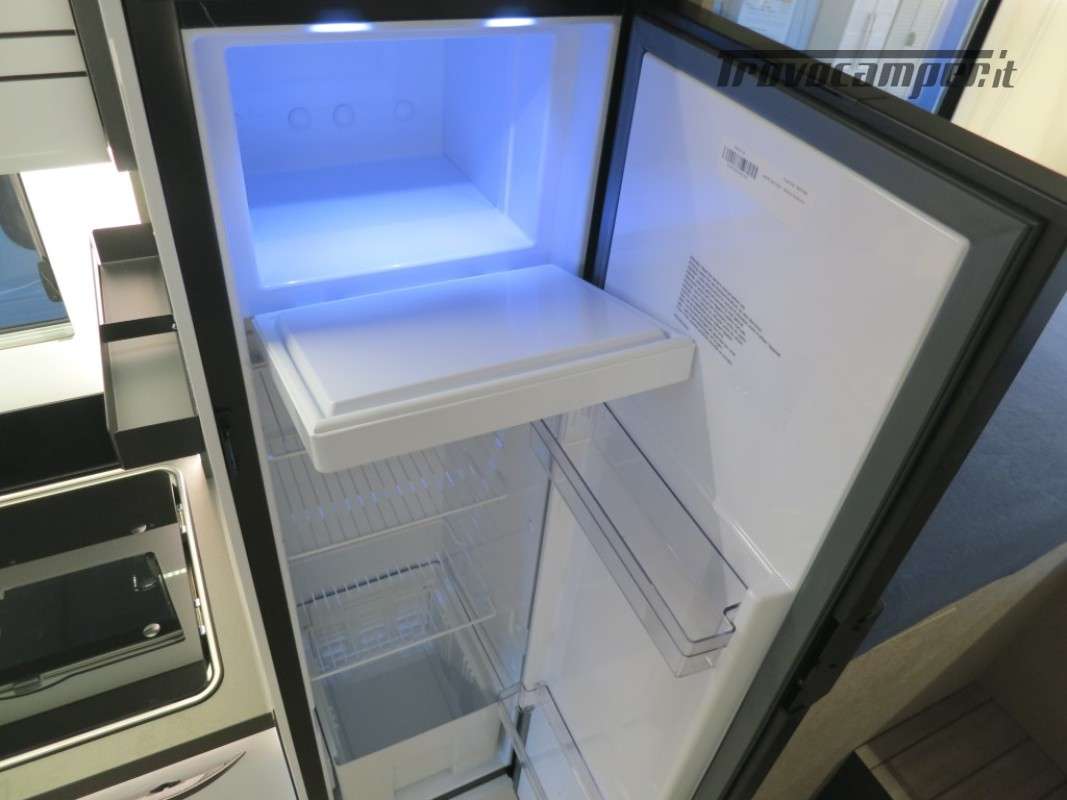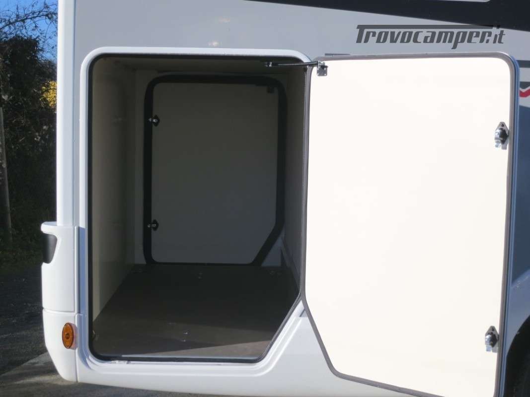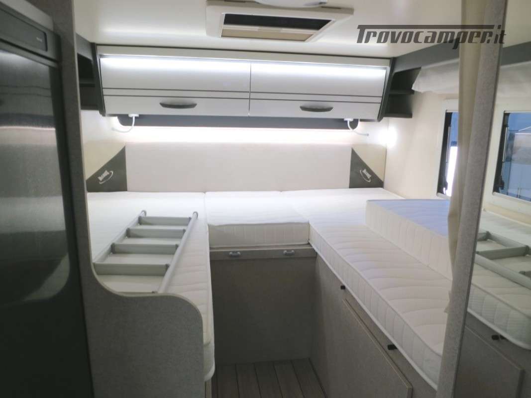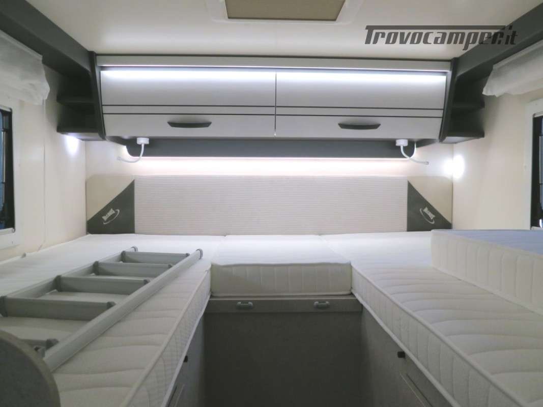 Con letti gemelli in coda, e letto matrimoniale basculante, questo camper è anche dotato di un garage che può ospitare fino a 3 bici.