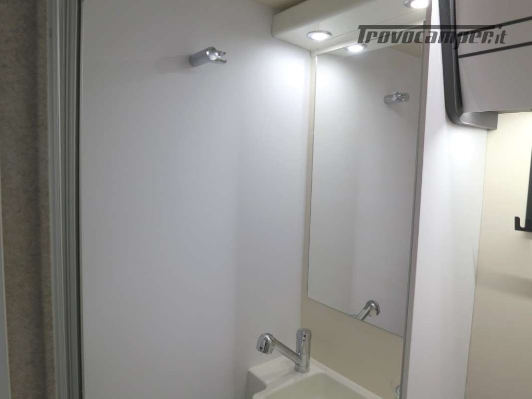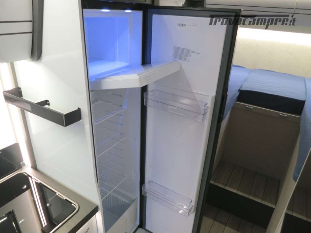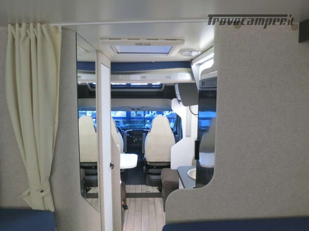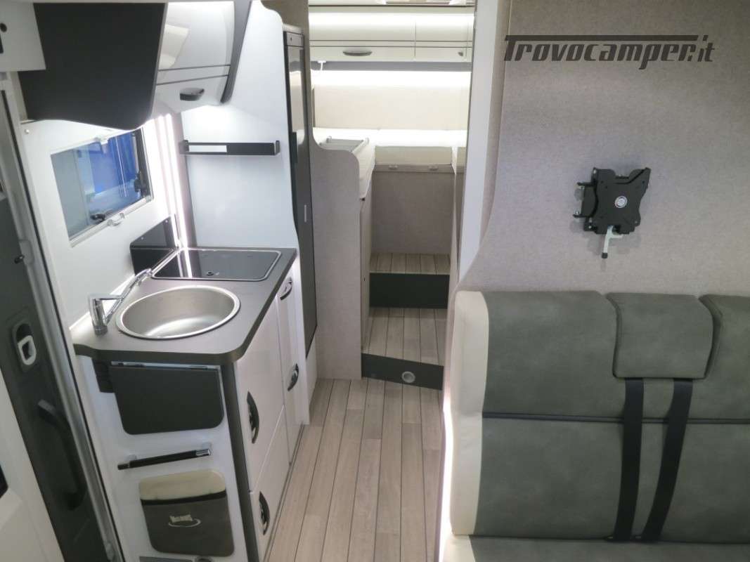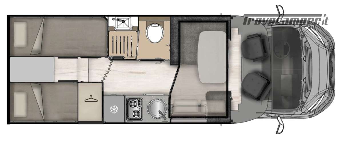 Con letti gemelli in coda, e letto matrimoniale basculante, questo camper è anche dotato di un garage che può ospitare fino a 3 bici.