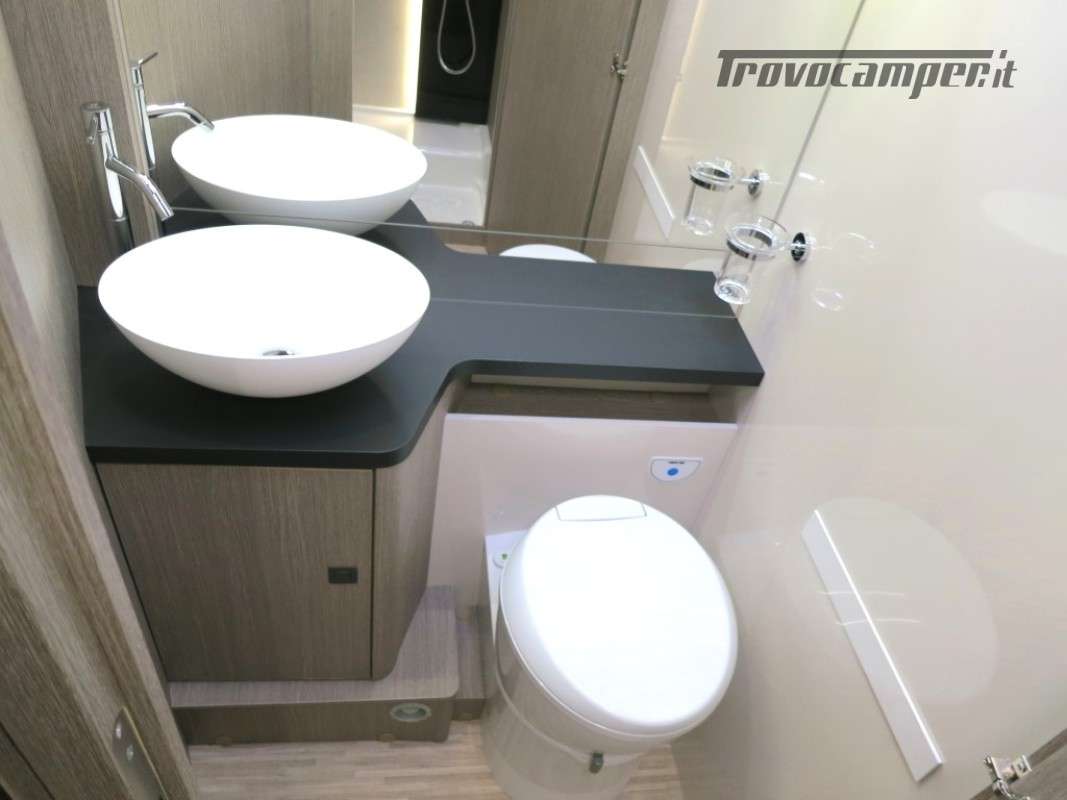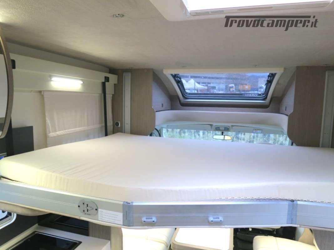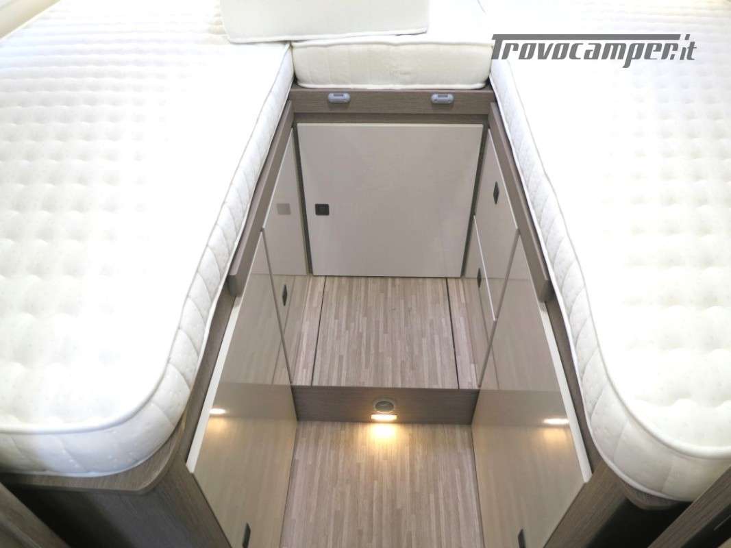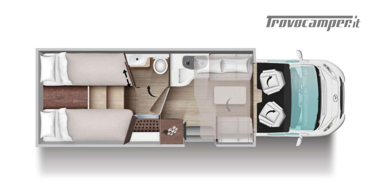 Con letti gemelli in coda, e letto matrimoniale basculante, questo camper è anche dotato di un garage che può ospitare fino a 4 bici.