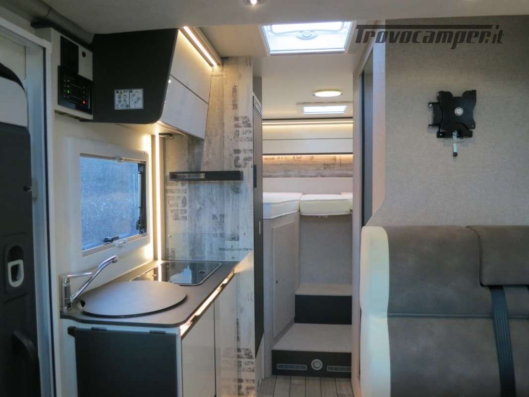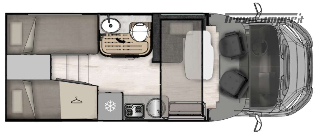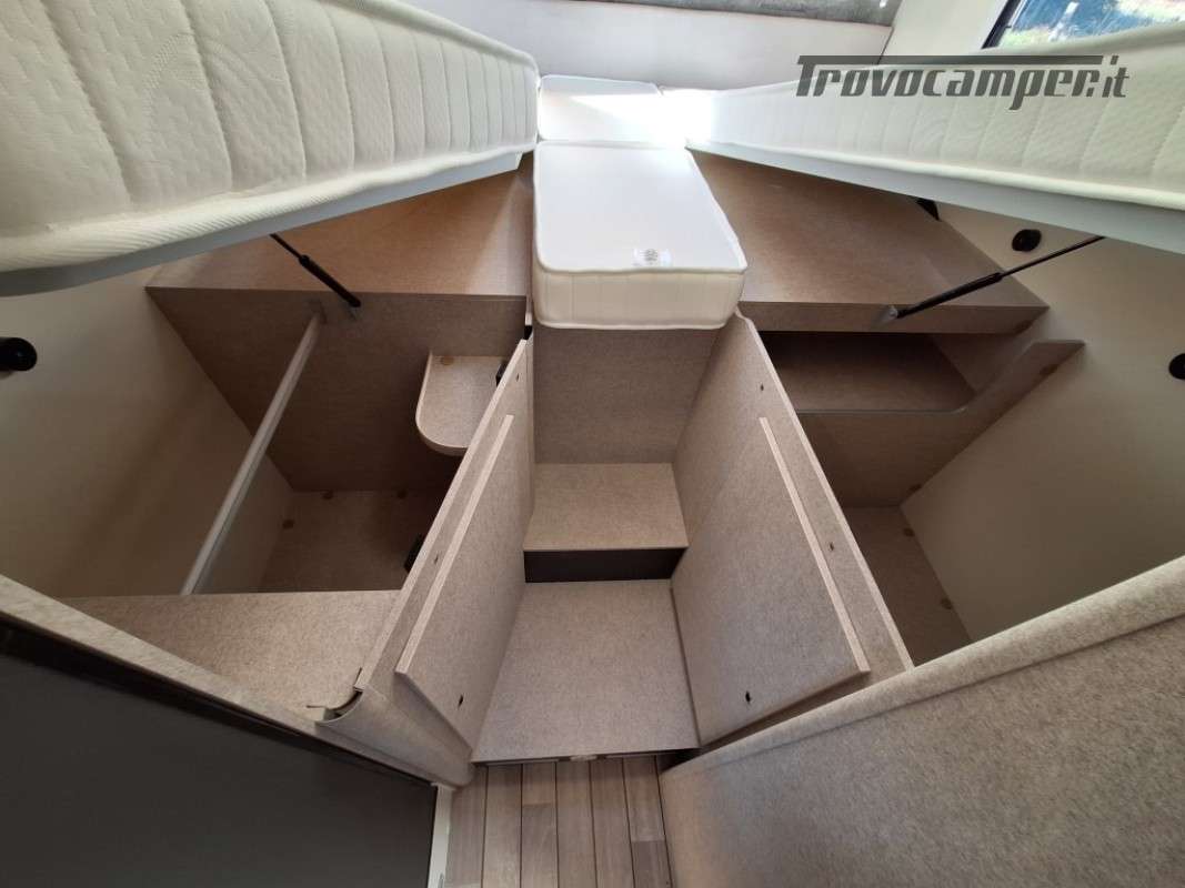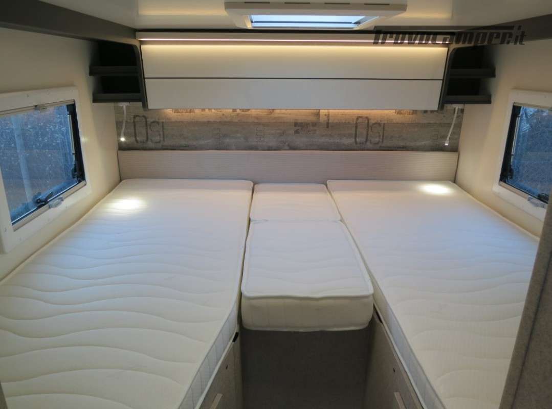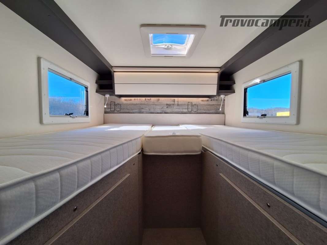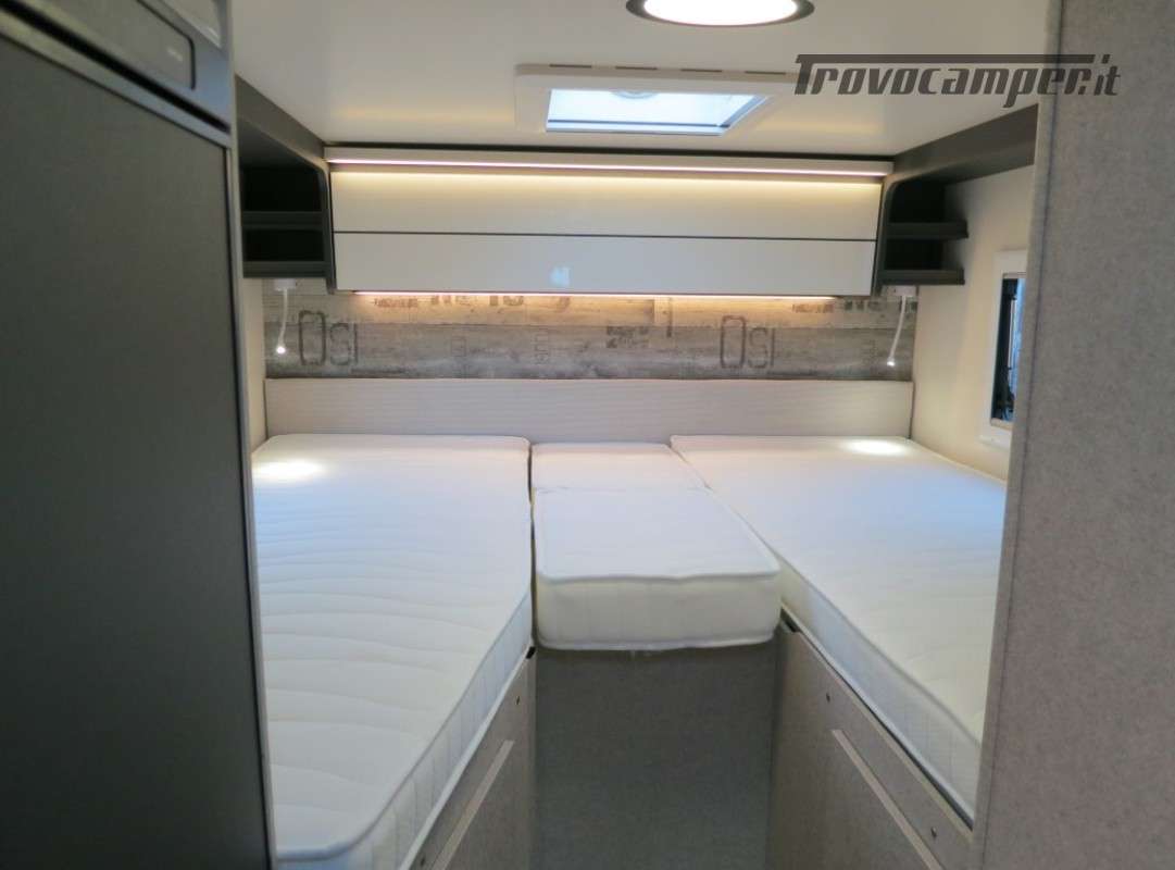 Con letti gemelli in coda, e letto basculante singolo, questo camper è anche dotato di un piccolo garage che può ospitare fino a 2 bici.