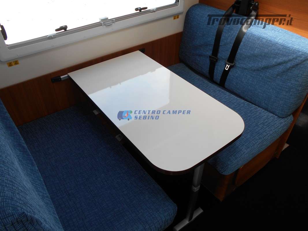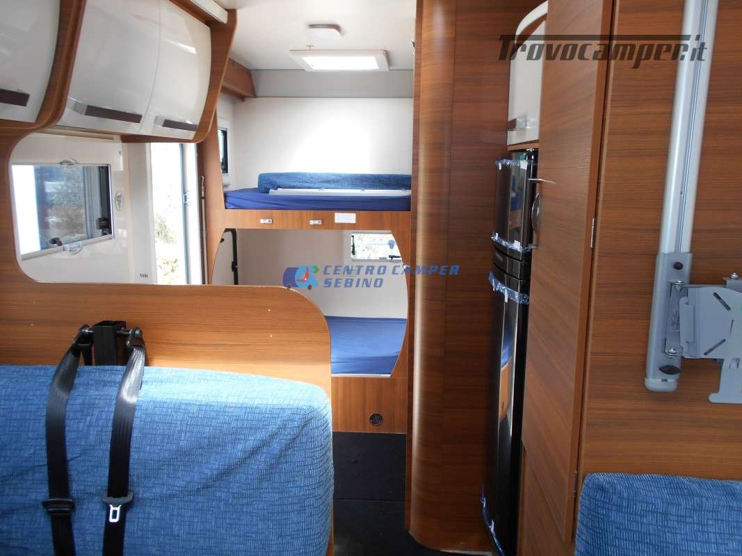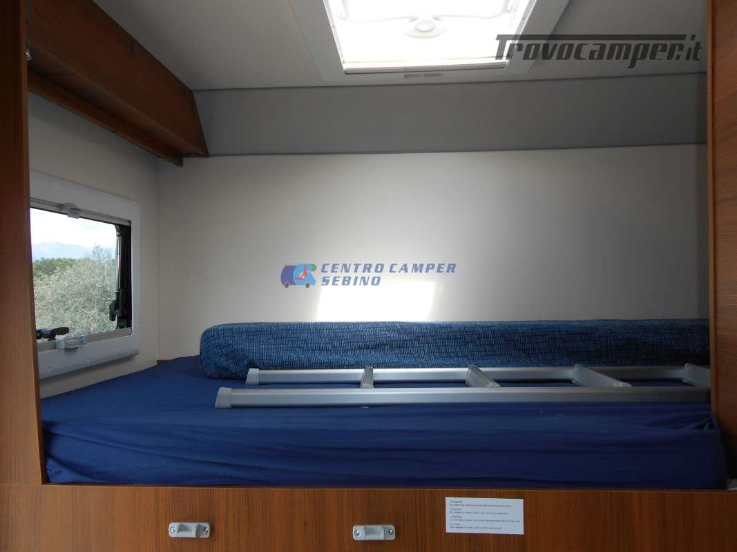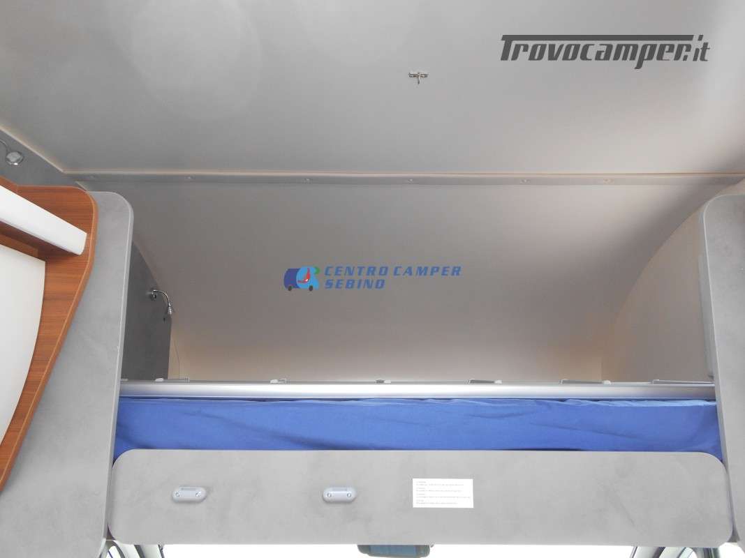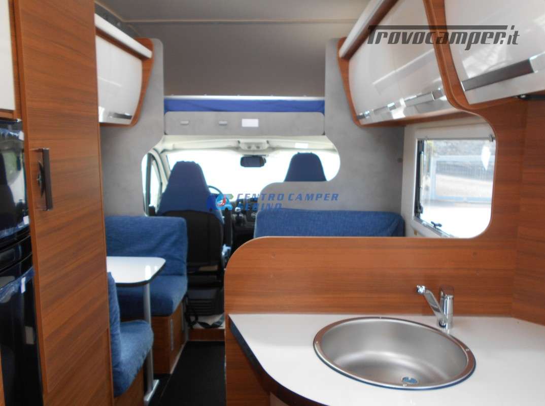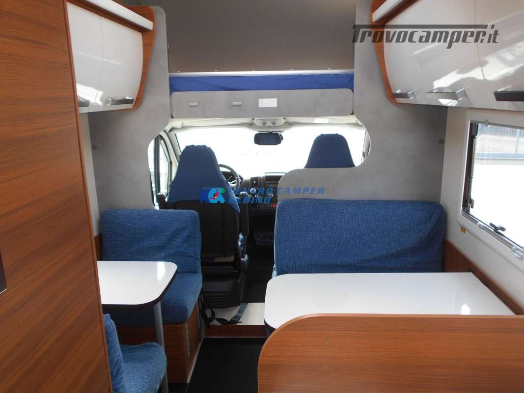 Noleggio Elnagh Baron 22 camper mansardato con 7 posti letto e 7 posti viaggio omologati, doppia dinette affiancata (doppio tavolino) e letti a castello trasversali (gavone a volume variabile, altezza massima 135cm).