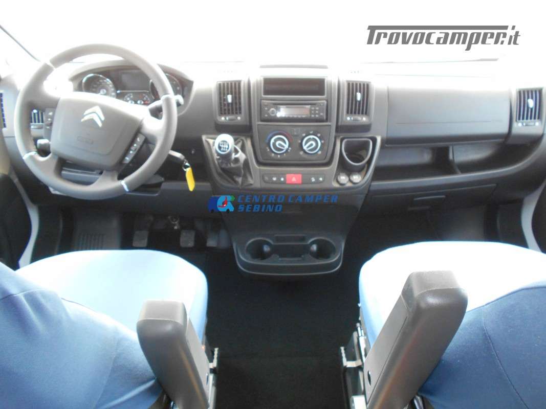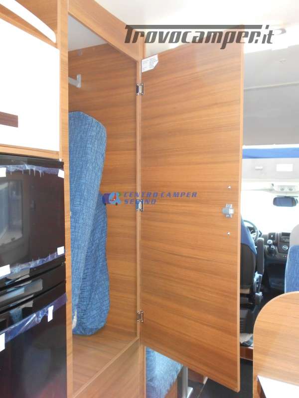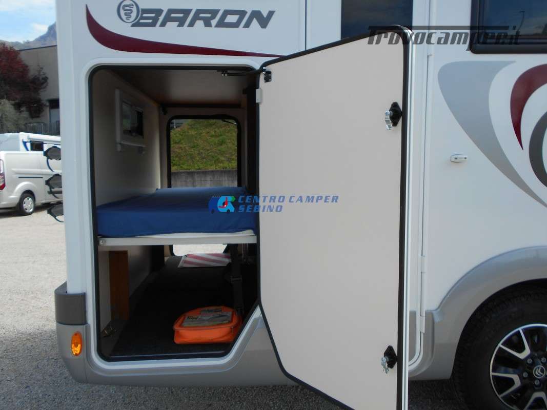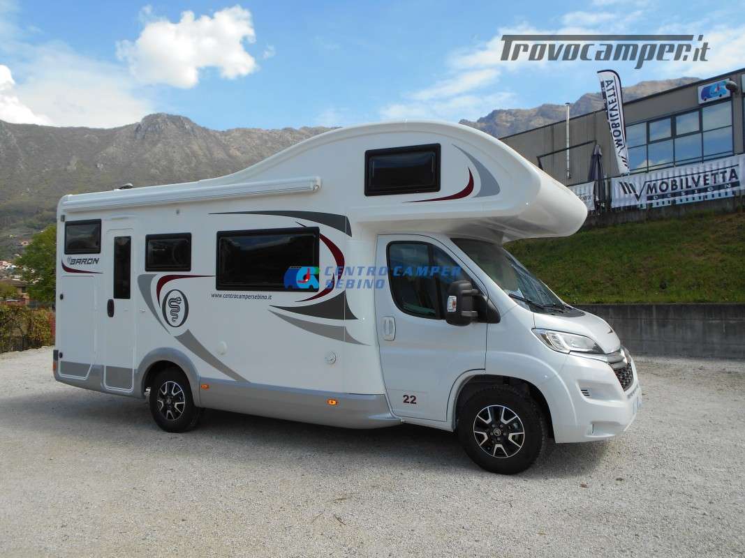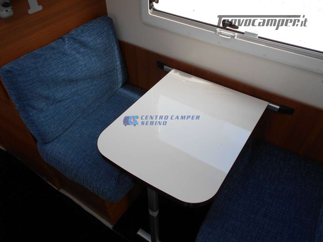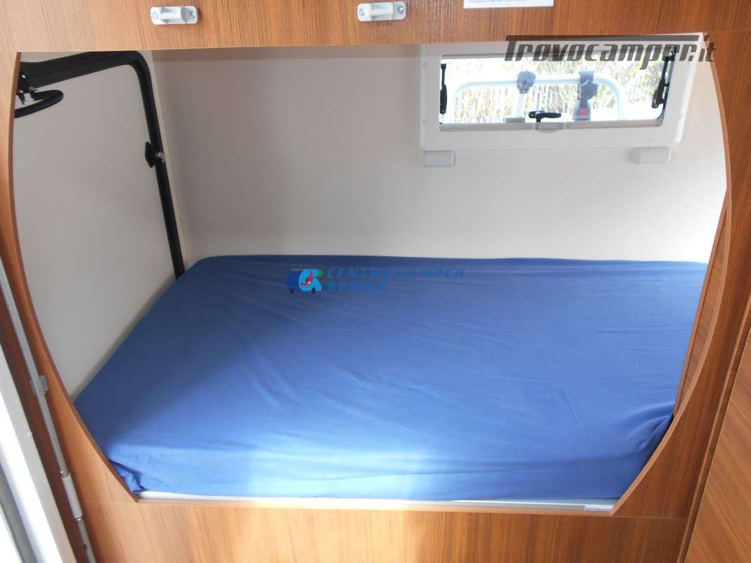 Noleggio Elnagh Baron 22 camper mansardato con 7 posti letto e 7 posti viaggio omologati, doppia dinette affiancata (doppio tavolino) e letti a castello trasversali (gavone a volume variabile, altezza massima 135cm).