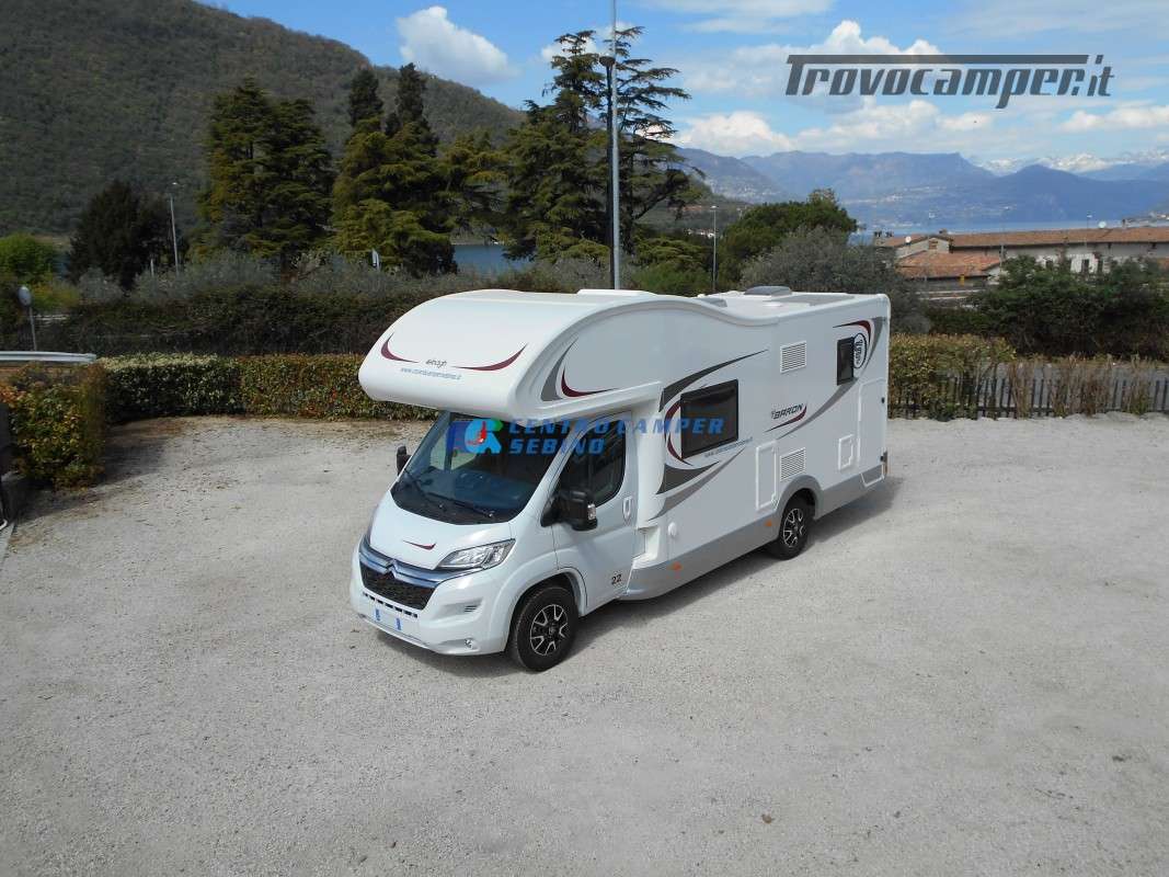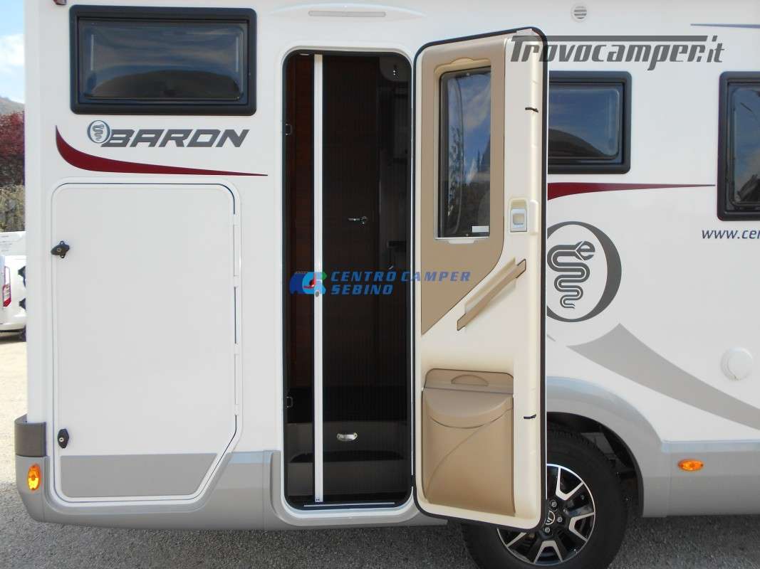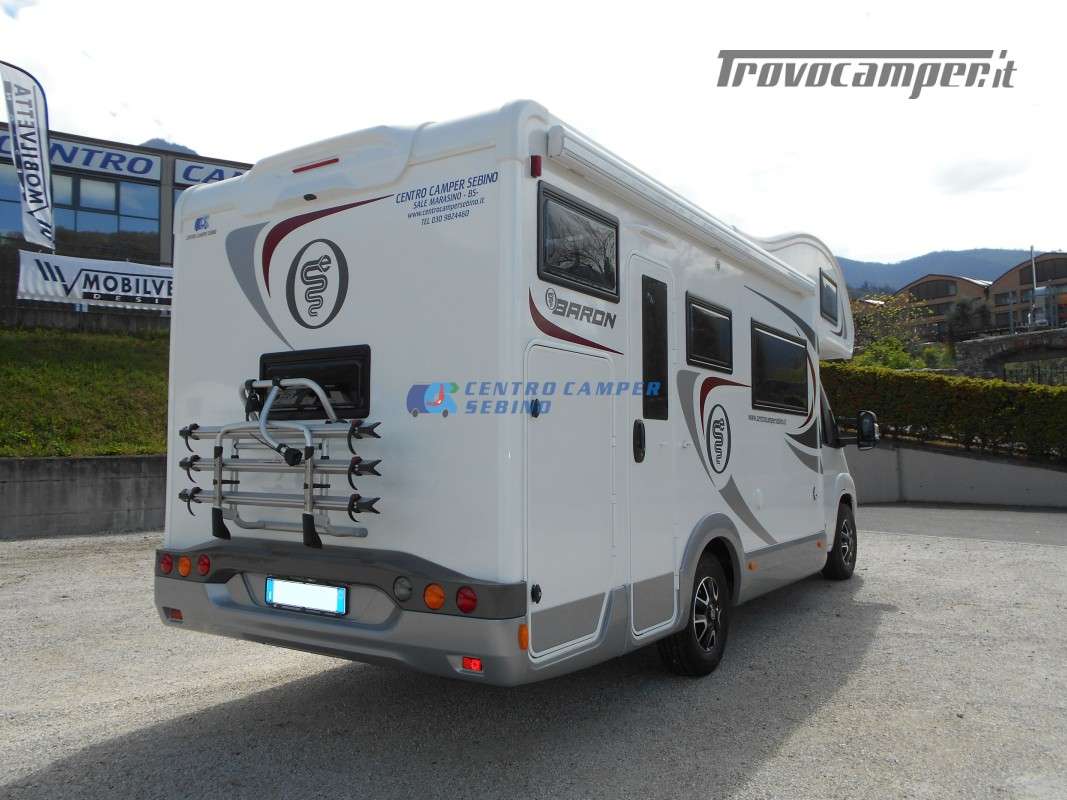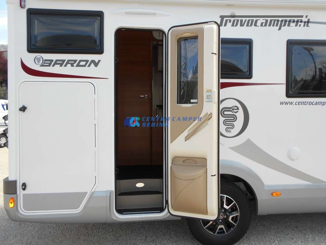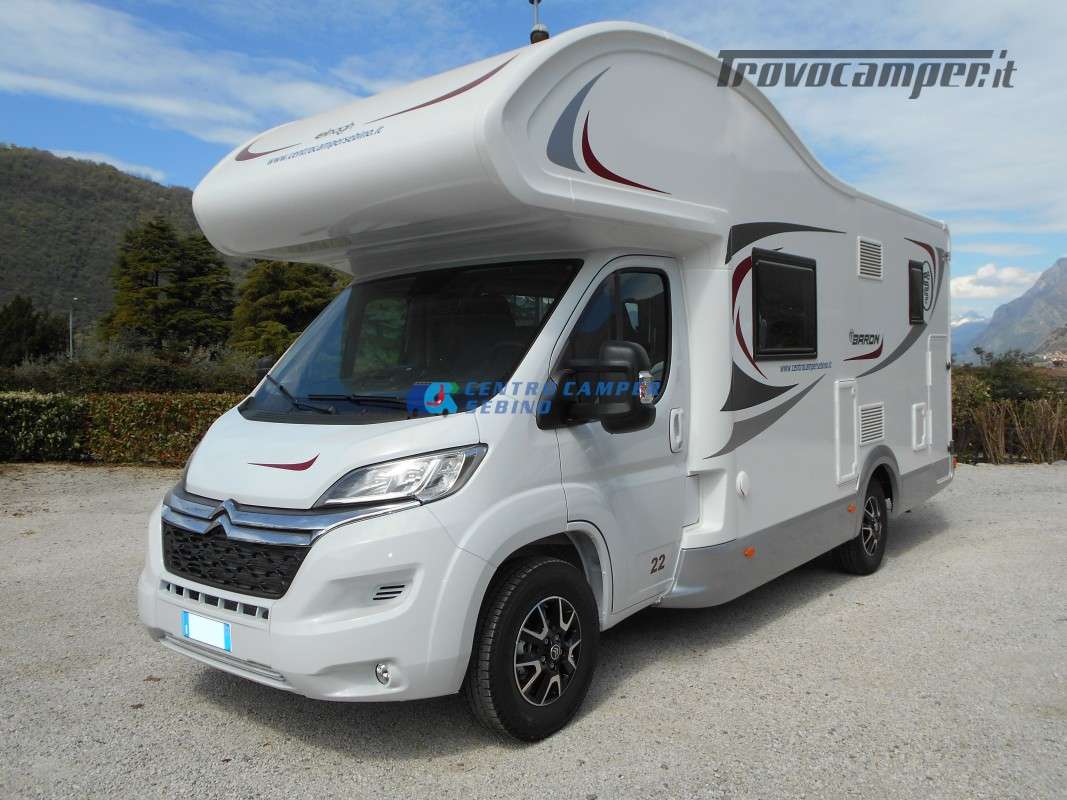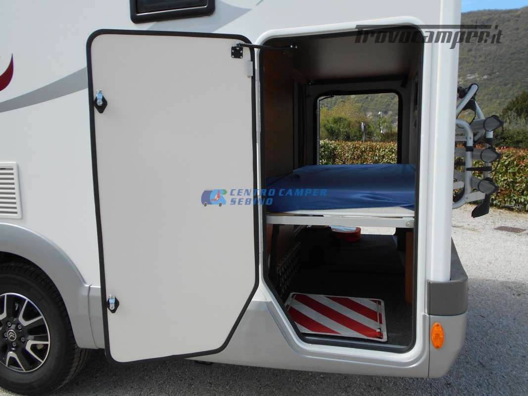 Noleggio Elnagh Baron 22 camper mansardato con 7 posti letto e 7 posti viaggio omologati, doppia dinette affiancata (doppio tavolino) e letti a castello trasversali (gavone a volume variabile, altezza massima 135cm).