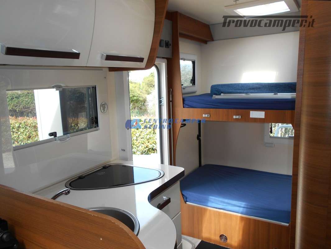 7 posti letto: matrimoniale in mansarda (150 x 209 cm), letti a castello posteriori (89 x 220 cm l’uno), letto matrimoniale (180 x 125 cm) e letto singolo (147 x 66 cm) ricavabili dalle due dinette