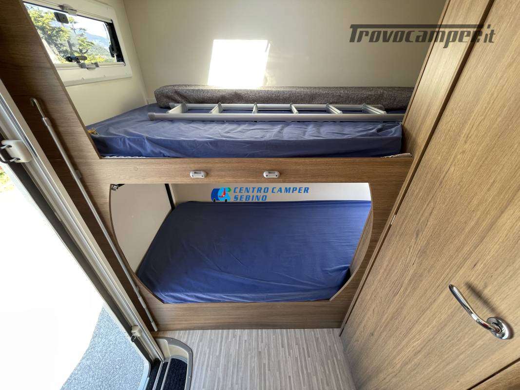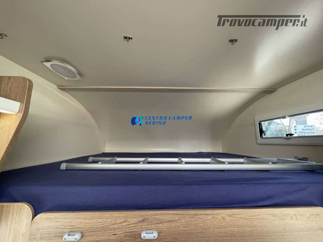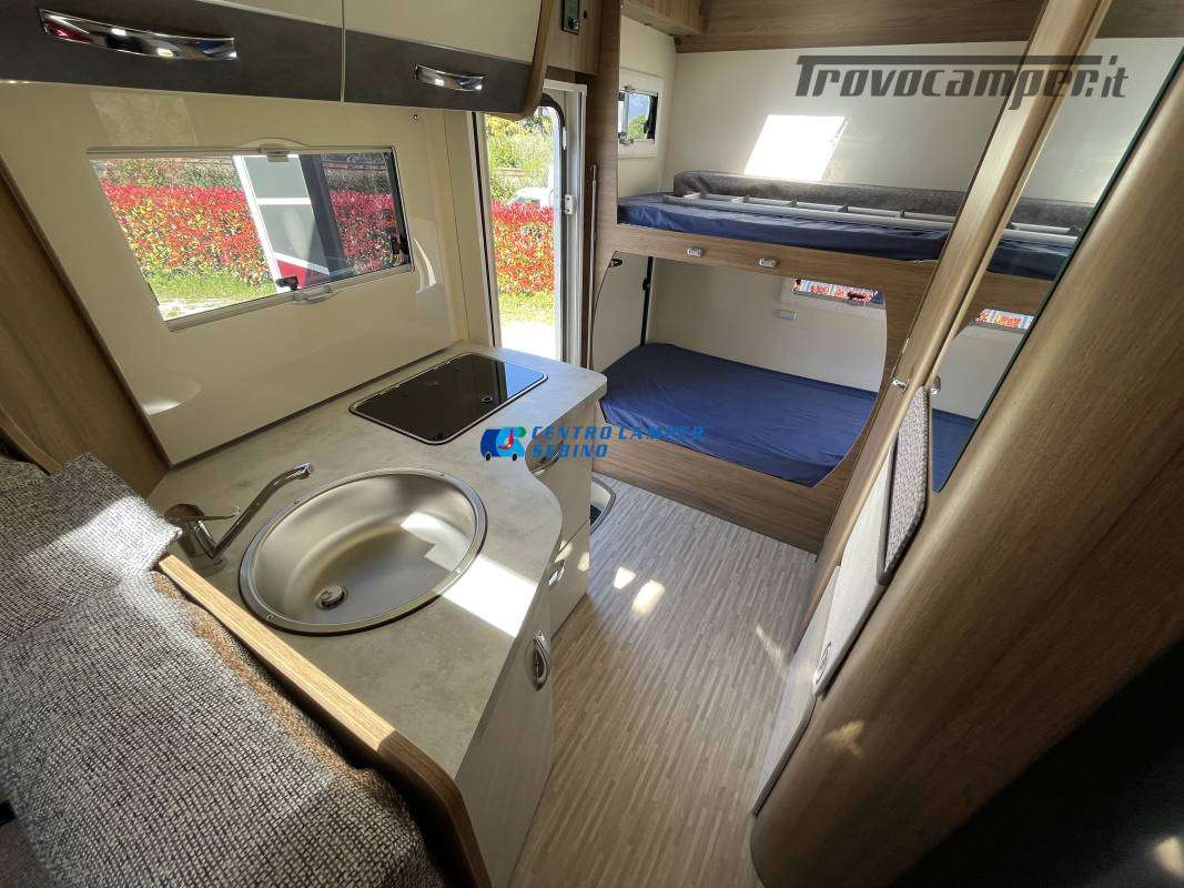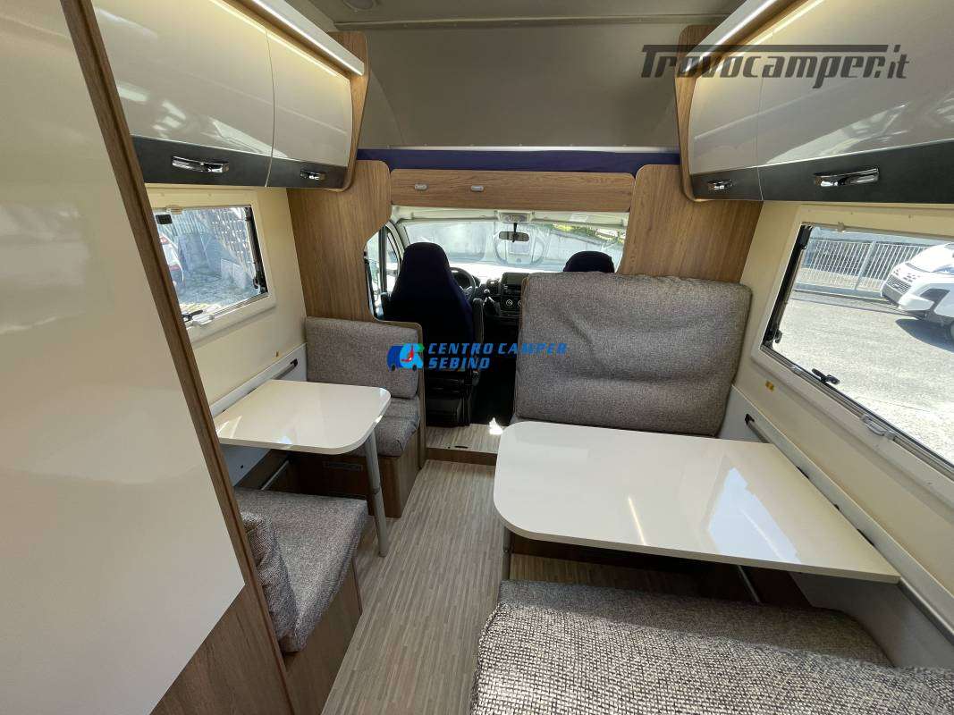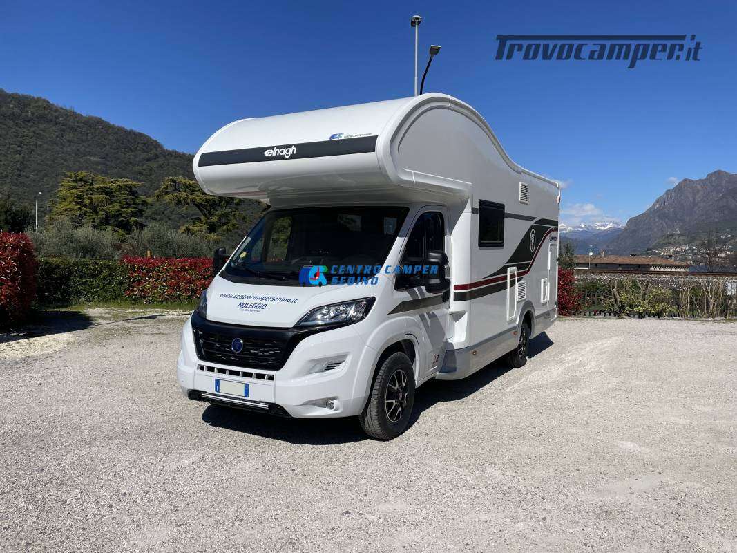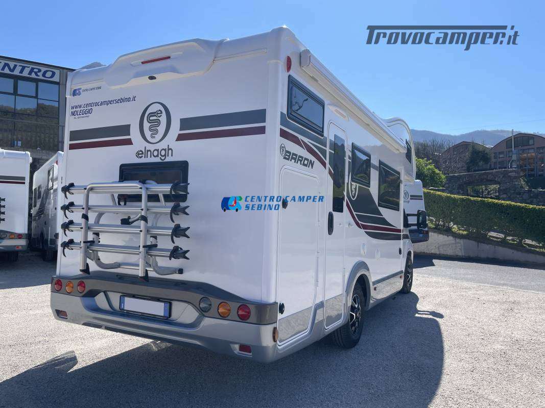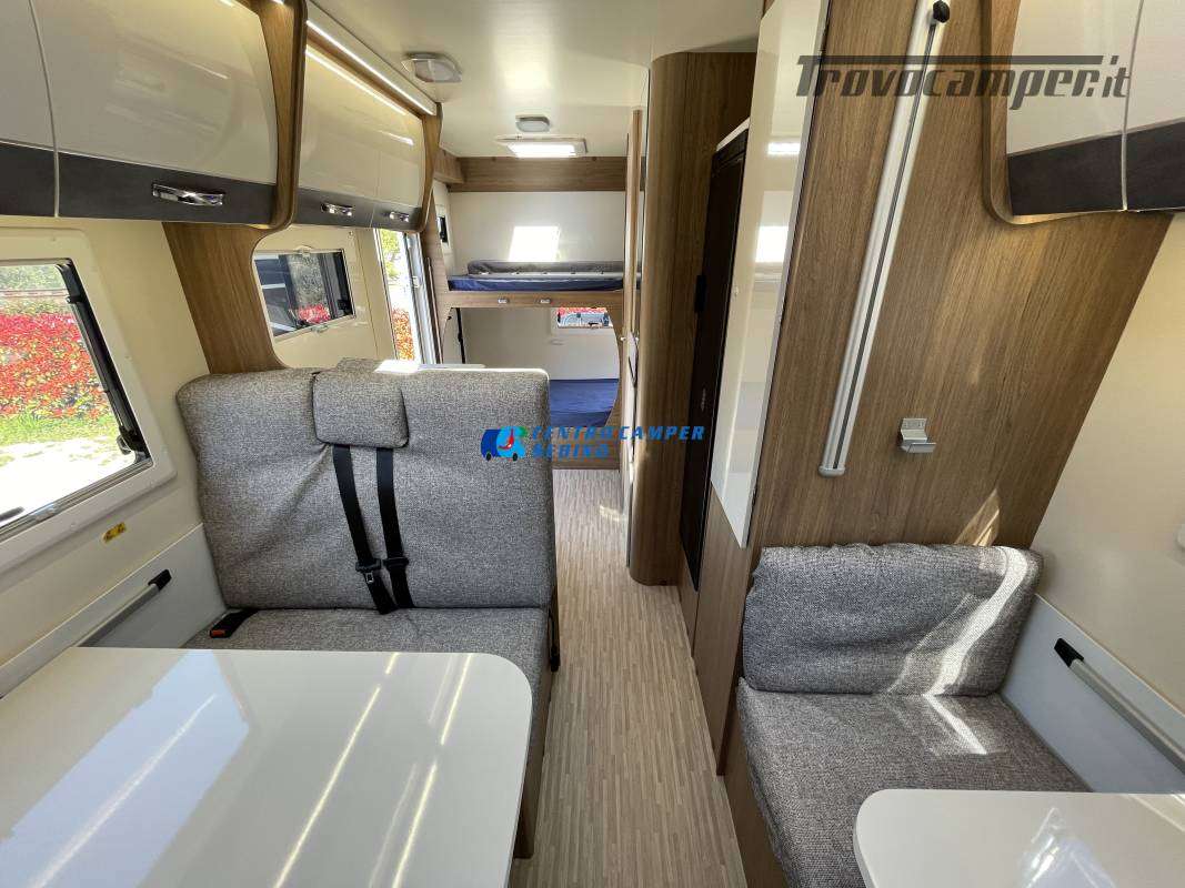 Noleggio Elnagh Baron 22 camper mansardato con 7 posti letto e 7 posti viaggio omologati, doppia dinette affiancata (doppio tavolino) e letti a castello trasversali (gavone a volume variabile).