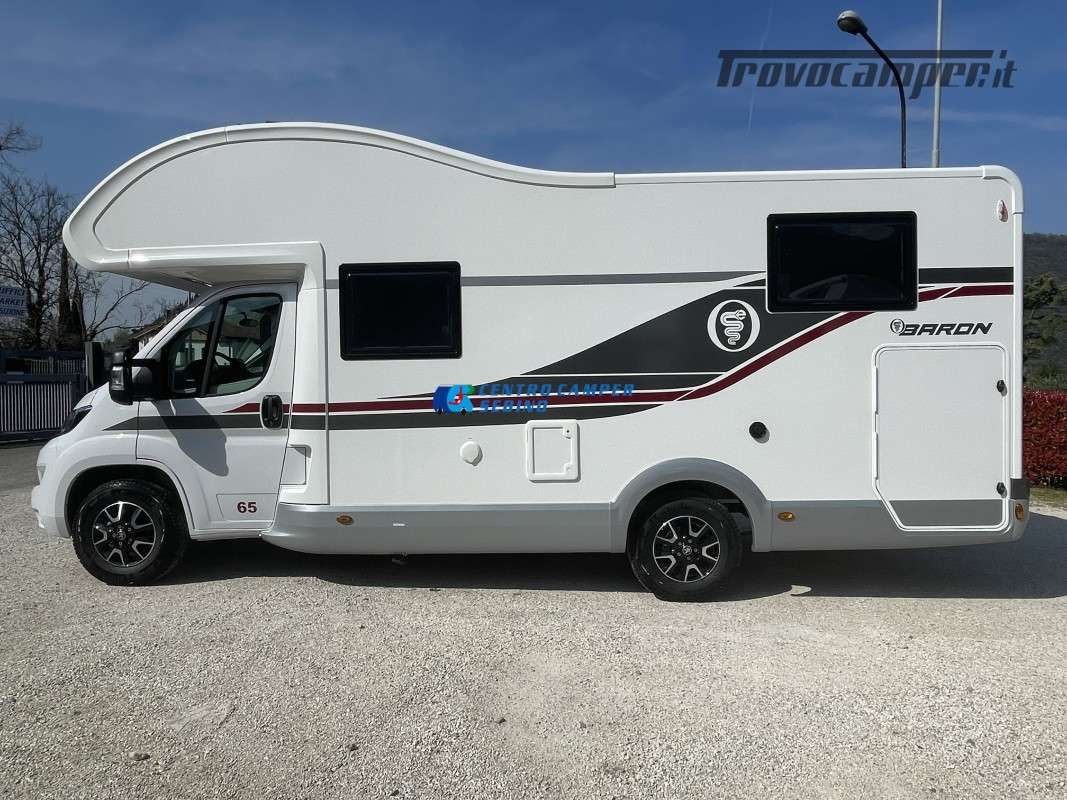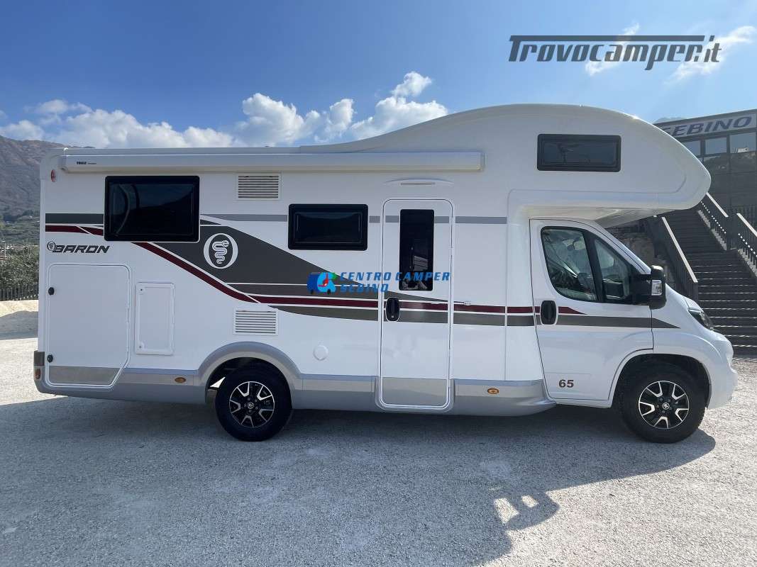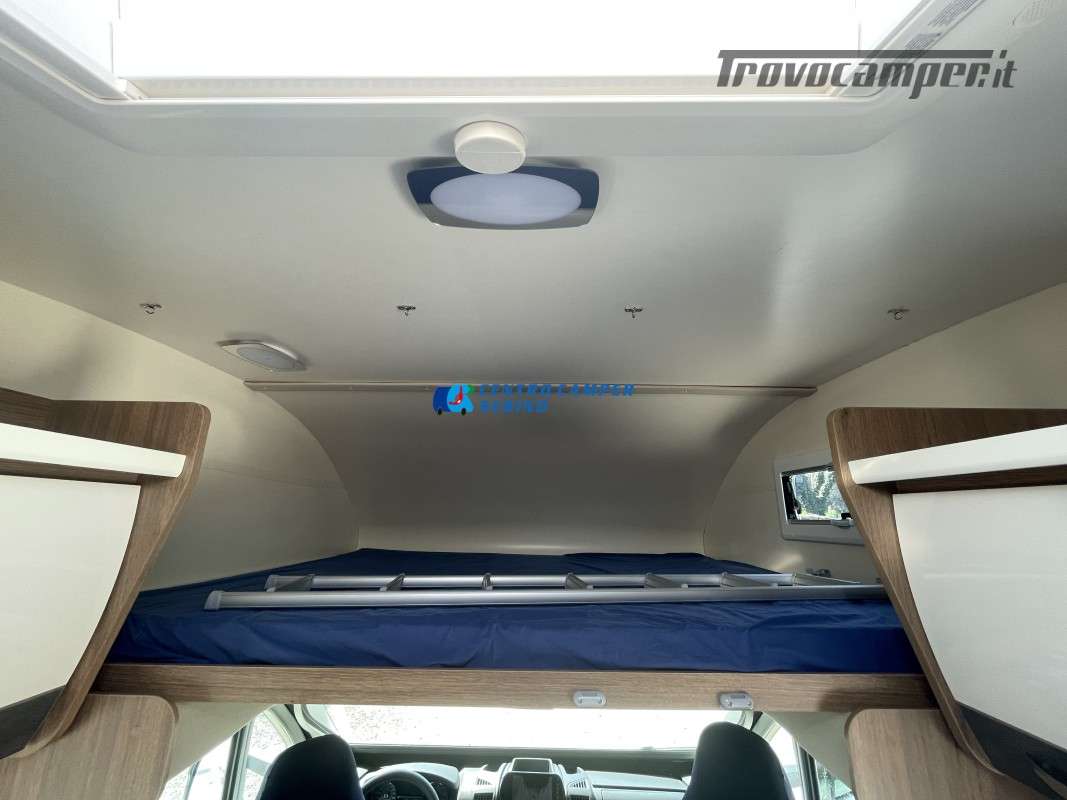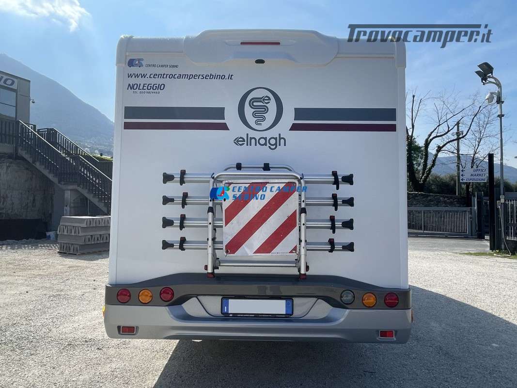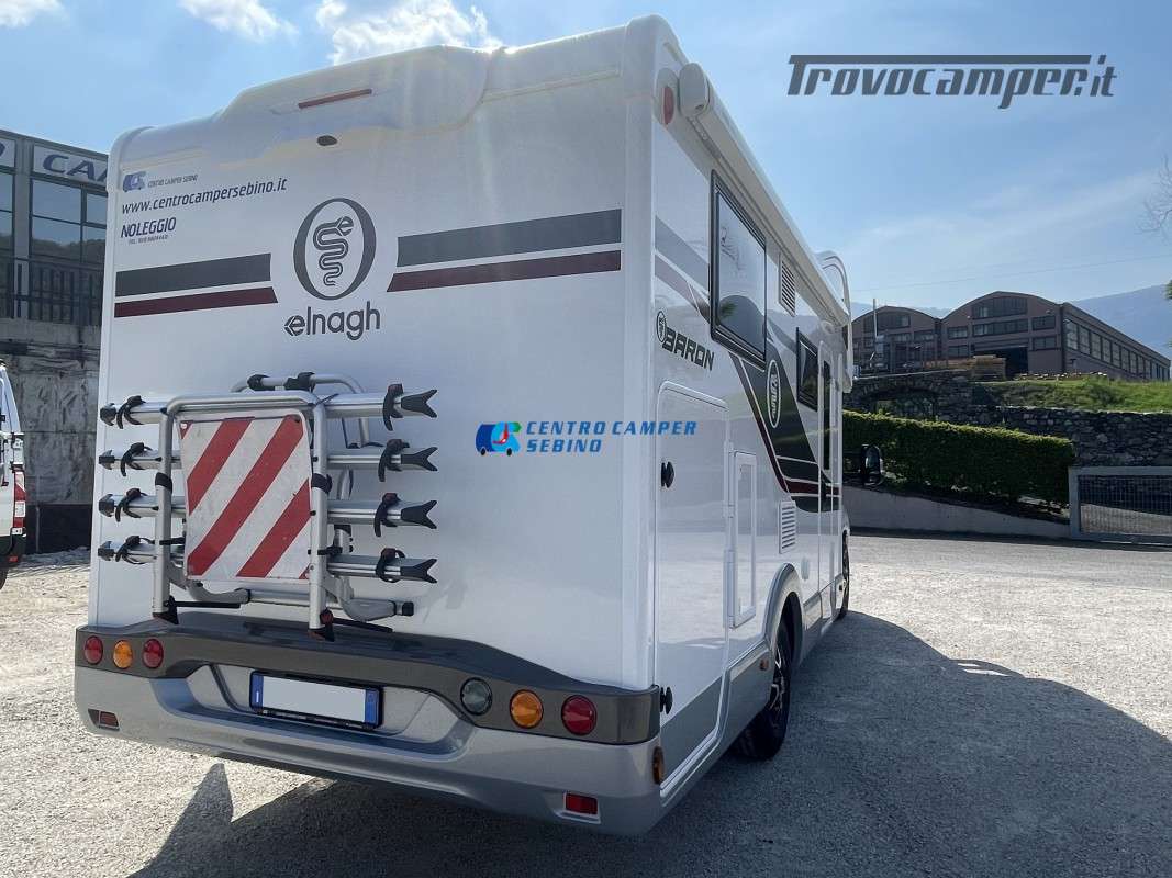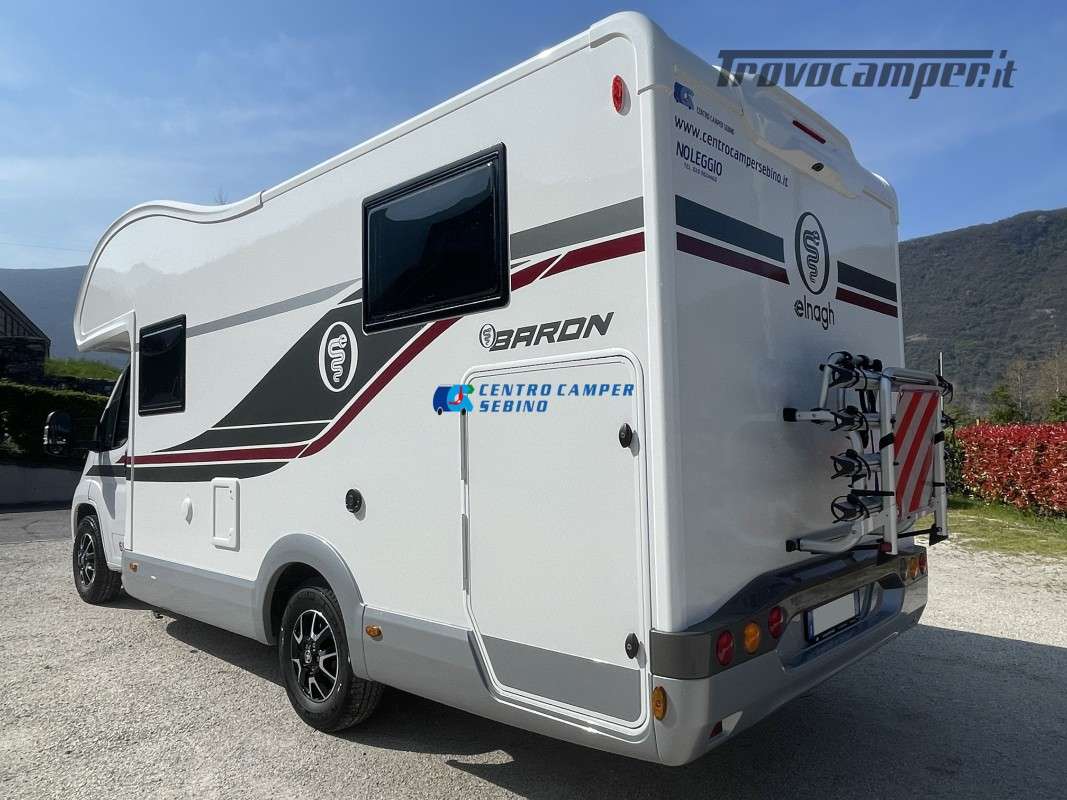 Noleggio camper mansardato Elnagh Baron 65 6,99 mt 5 posti con letti gemelli (unibili), grande garage e bagno con box doccia separato (antine in plexiglass) con formula chilometraggio ILLIMITATO!