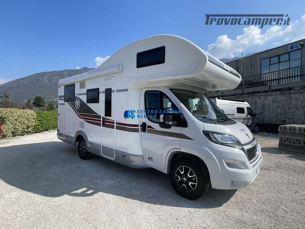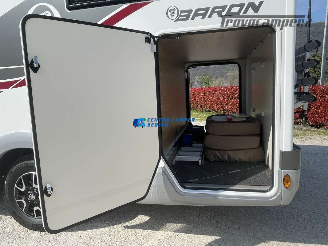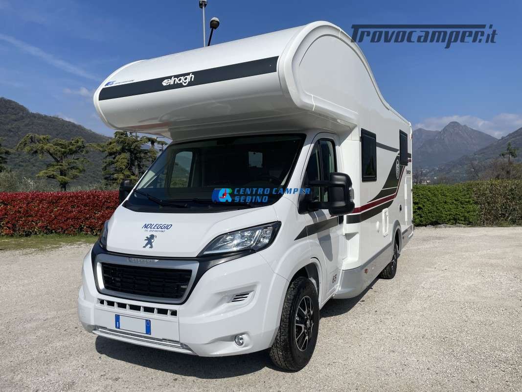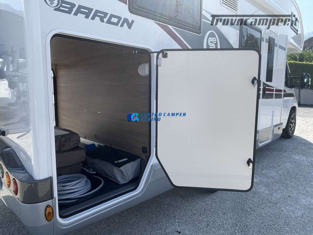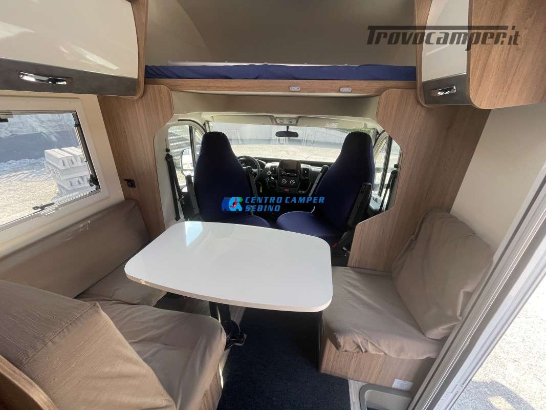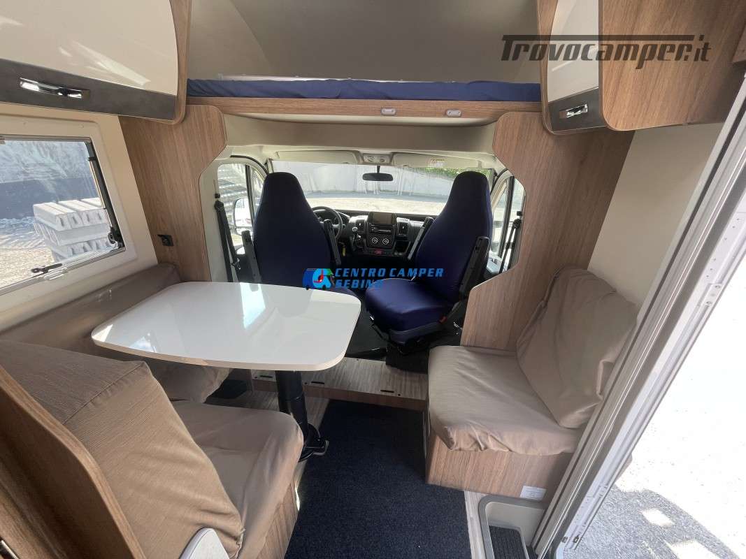 Noleggio camper mansardato Elnagh Baron 65 6,99 mt 5 posti con letti gemelli (unibili), grande garage e bagno con box doccia separato (antine in plexiglass) con formula chilometraggio ILLIMITATO!