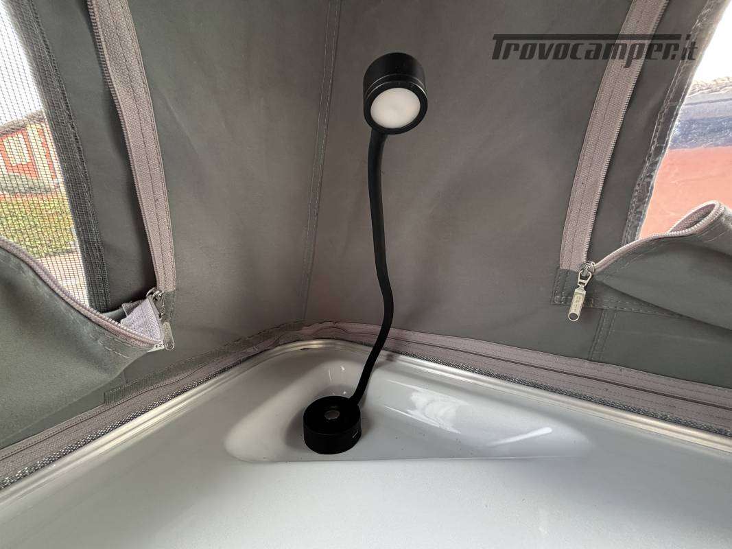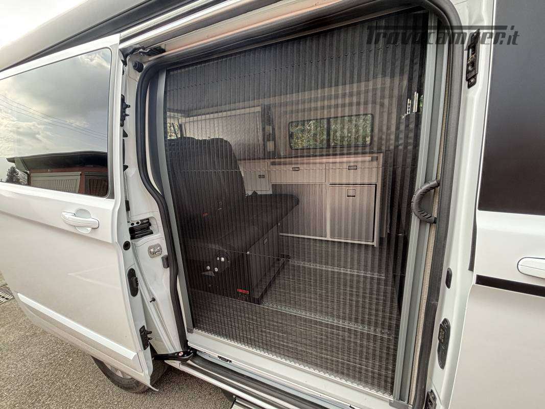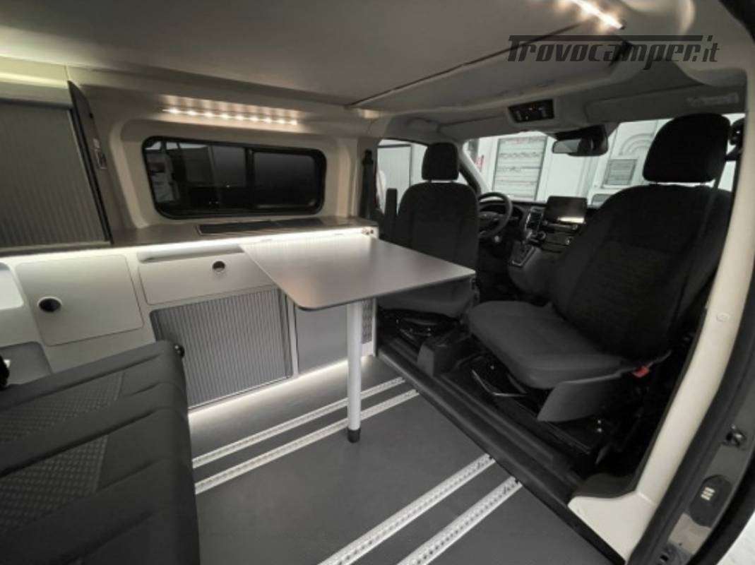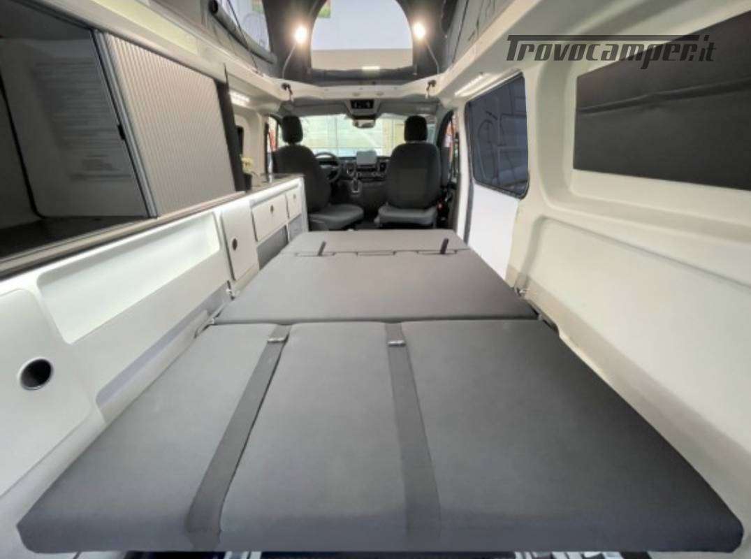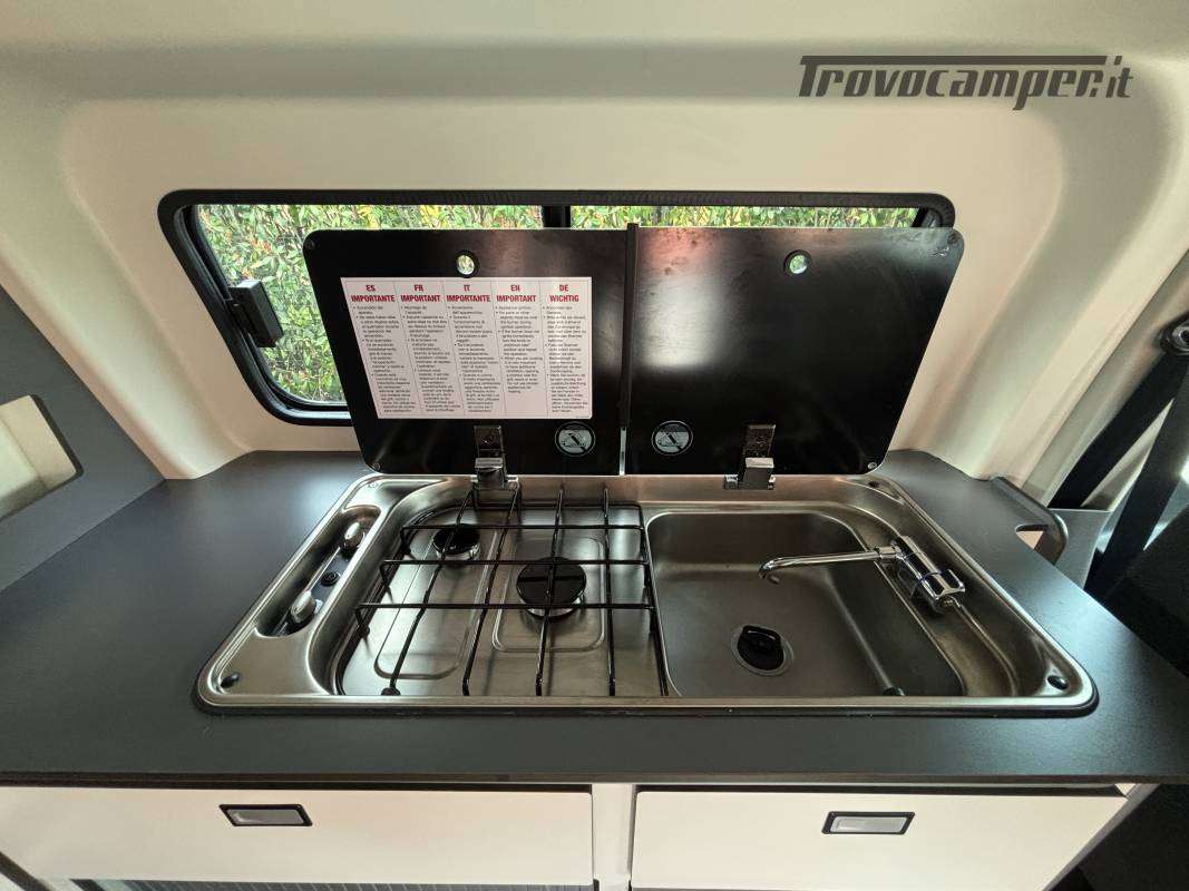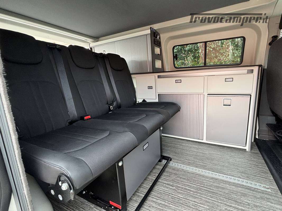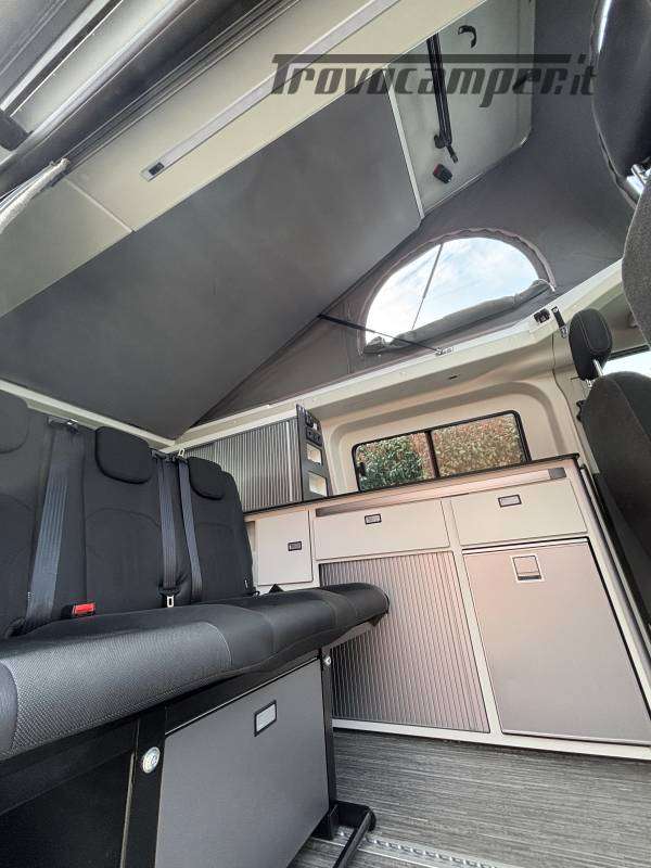 Zona Van: Cellula completamente coibentata per un utilizzo senza problemi anche in inverno in montagna, 4 posti letto su due letti doppi (uno al piano terra ricavabile abbattendo la panca sedili e uno al primo piano, quello al primo piano dotato di doghe), riscaldamento autonomo programmabile (Webasto), frigorifero con cella freezer, lavandino con rubinetto, doppi fuochi a gas, prese suko e usb multiple in tutta la cellula, due armadi. Illuminazione scenografica dimmerabile a Led nascosta all'interno dell'arredamento con comandi touch, zanzariera al portellone laterale, doccino, 2 luci Led con comando touch sul portellone posteriore per illuminare zona posteriore/doccia, serbatoio acqua da 50L, serbatoio acque grigie riscaldato, tavolino con supporto utilizzabile anche all'esterno del mezzo, tendalino esterno 2x2, gradino di accesso retrattile elettrico, 2 luci led con presa USB al piano superiore.