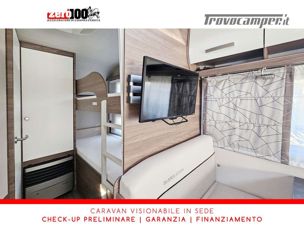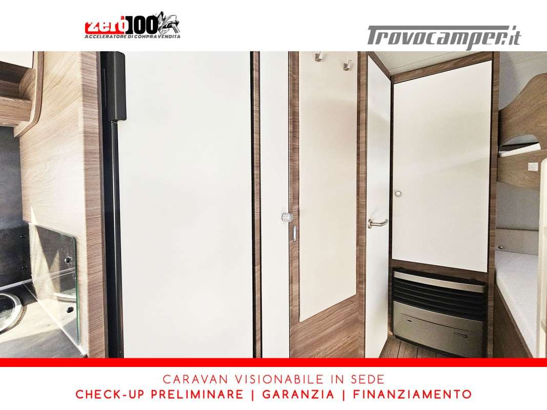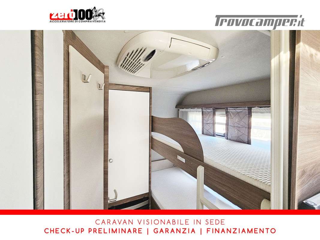Letto matrimoniale anteriore trasversale -Dinette Centrale trasformabile in letto matrimoniale – Letti a castello longitudinali posteriori lato sx – Cucina lineare 3 fuochi – Frigorifero trivalente alto con cella freezer separata – Bagno finestrato con doccia separata
