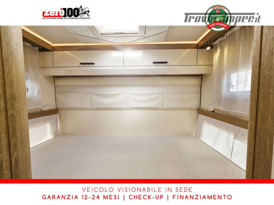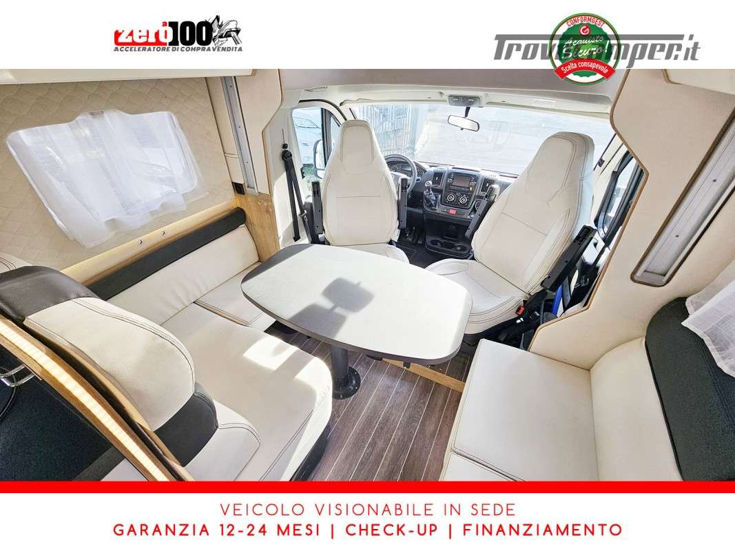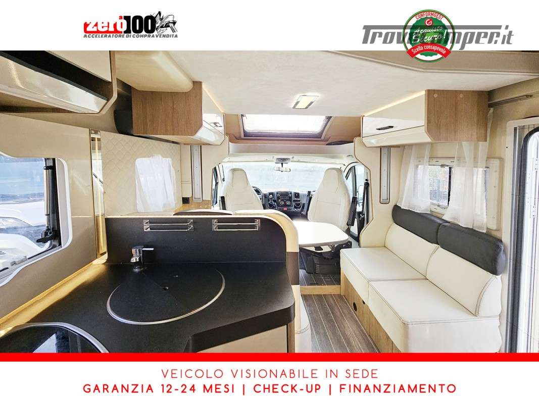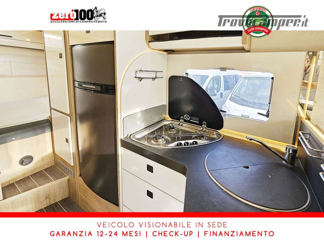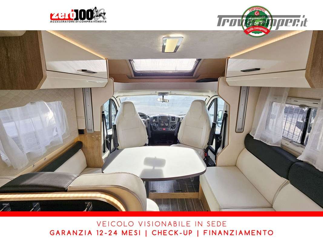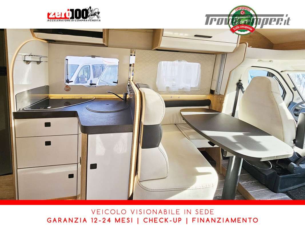 Mezza dinette con sedili girevoli e divanetto laterale trasformabile in letto - Letto matrimoniale trasversale posteriore fisso (Flex Space potenzialmente ripristinabile) - Cucina angolare con frigo alto trivalente - Bagno con doccia separata - Letto matrimoniale basculante elettrico - Garage