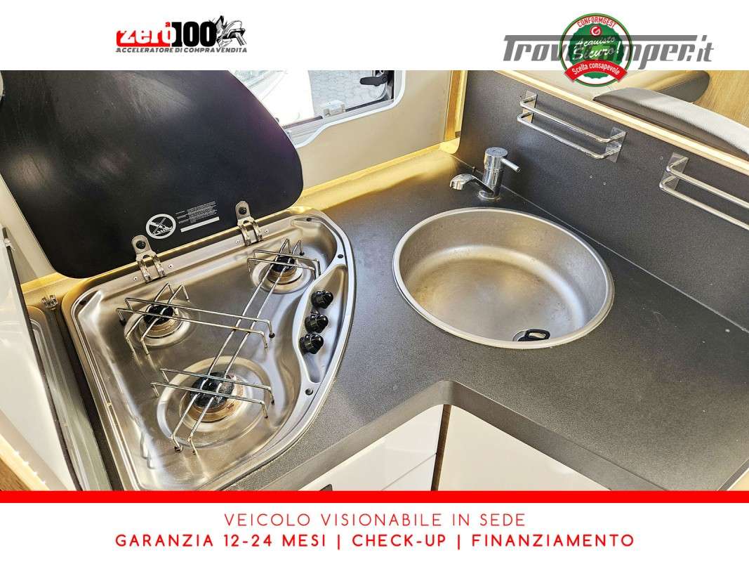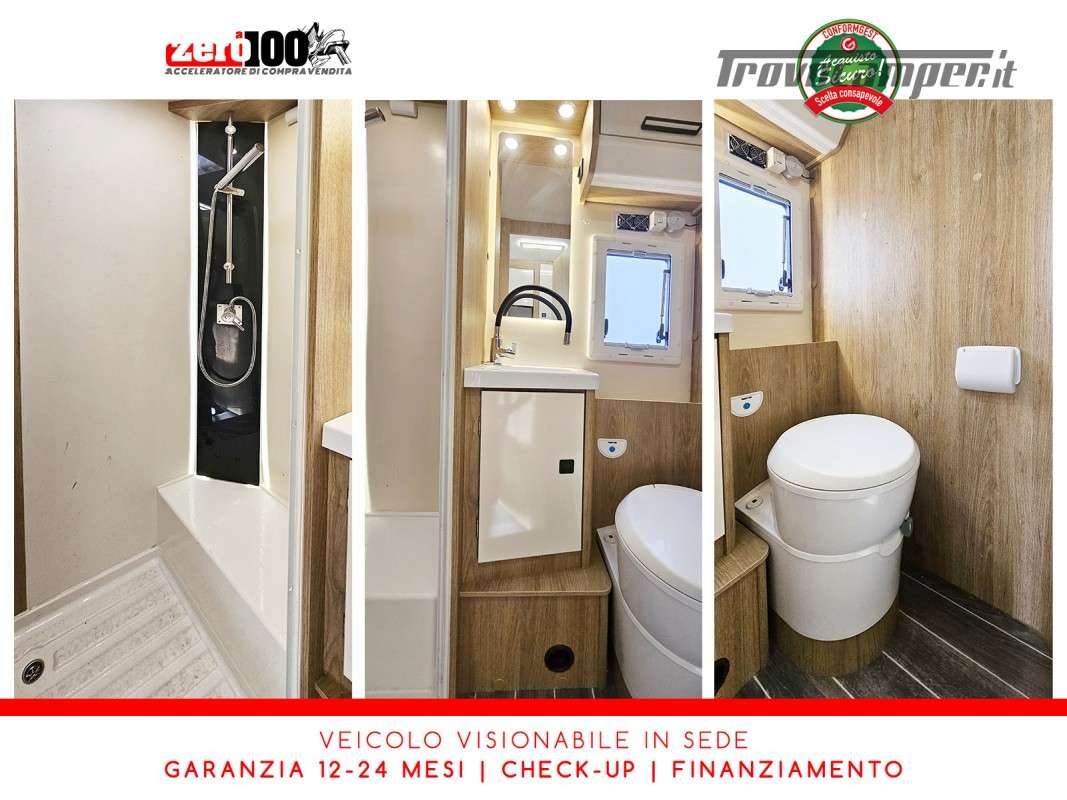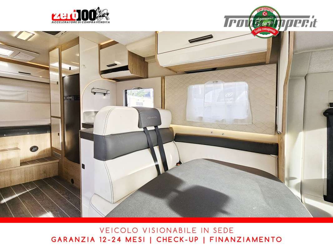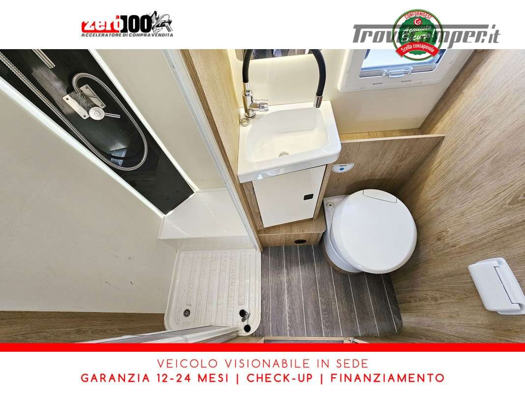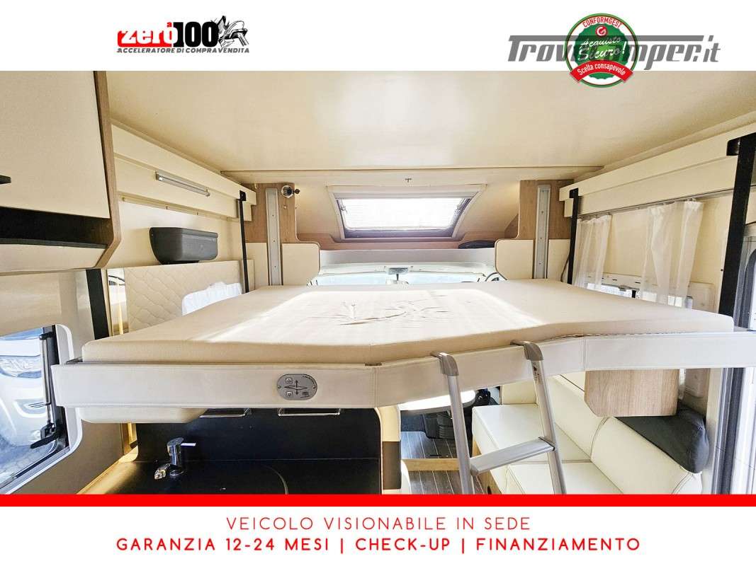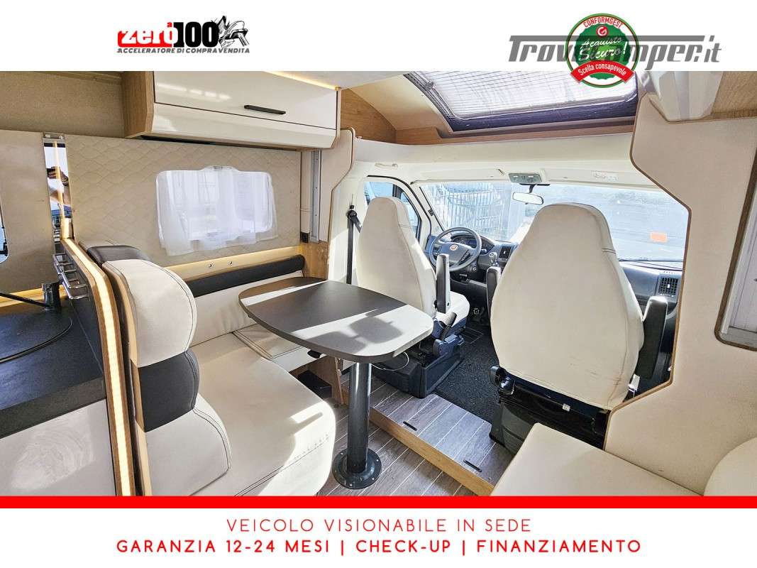 Mezza dinette con sedili girevoli e divanetto laterale trasformabile in letto - Letto matrimoniale trasversale posteriore fisso (Flex Space potenzialmente ripristinabile) - Cucina angolare con frigo alto trivalente - Bagno con doccia separata - Letto matrimoniale basculante elettrico - Garage