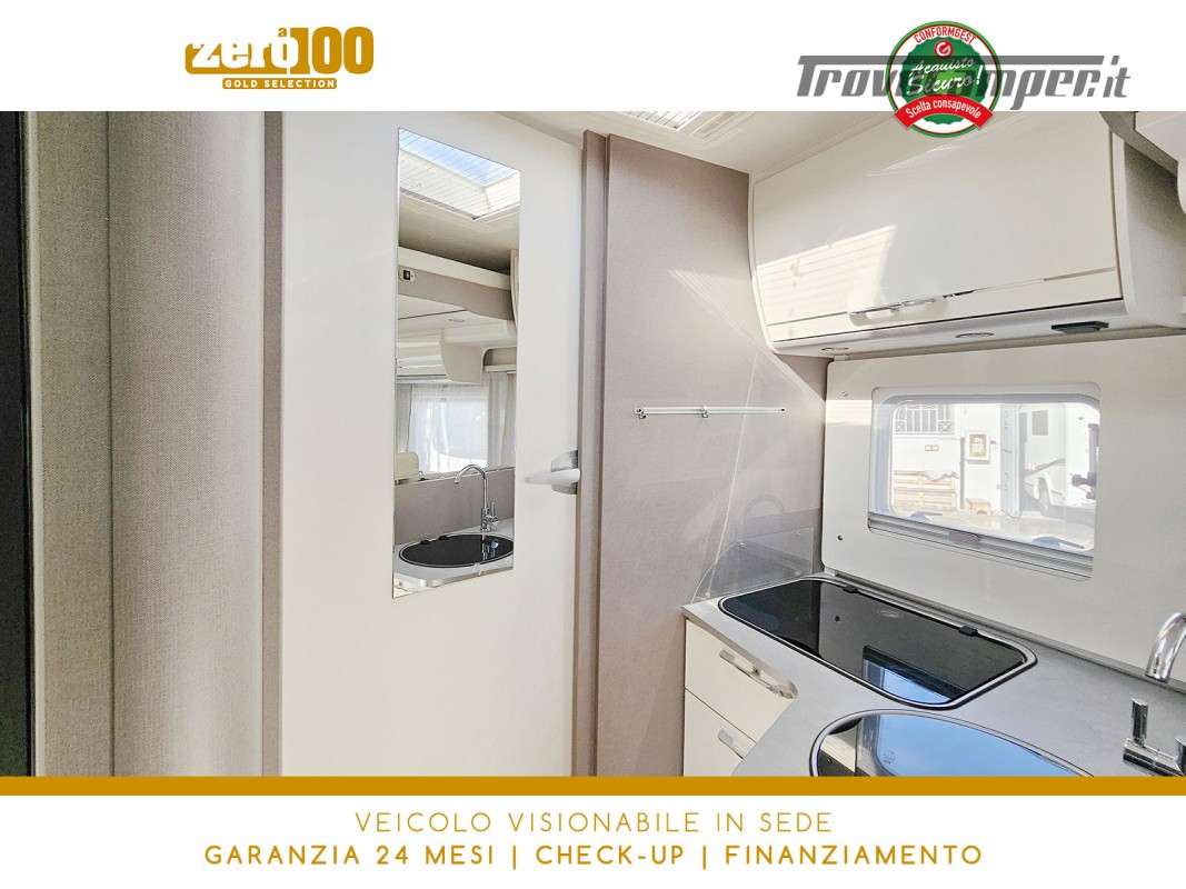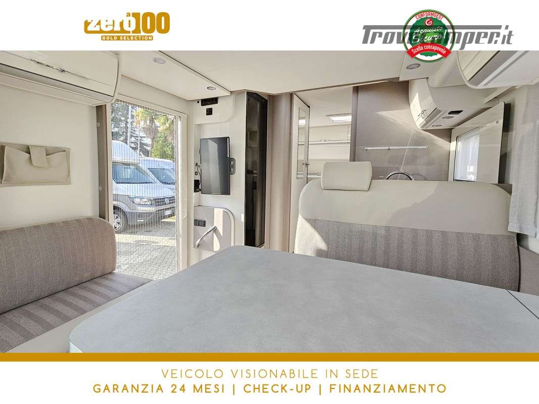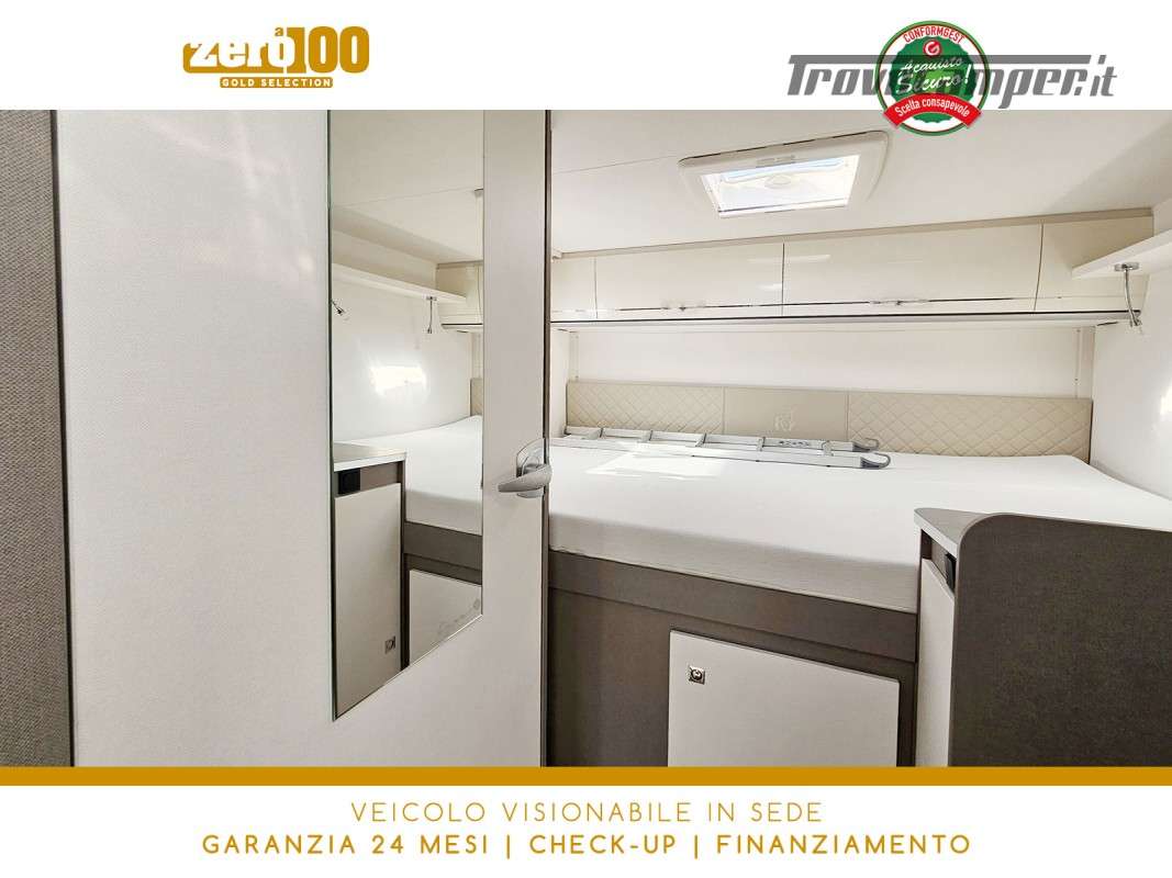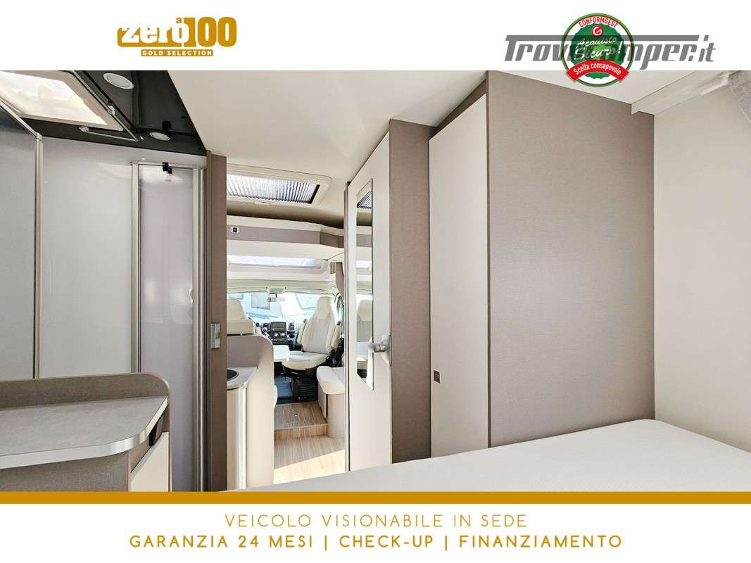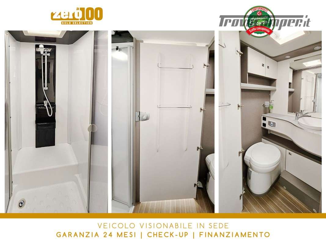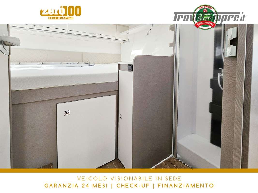 Letto matrimoniale trasversale in coda - Mezza dinette con sedili cabina girevoli trasformabile in letto singolo - Letto basculante anteriore elettrico - Cucina a L 3 fuochi con frigorifero trivalente con cella frigorifera separata - Bagno diviso in due zone con separazione doccia - Garage