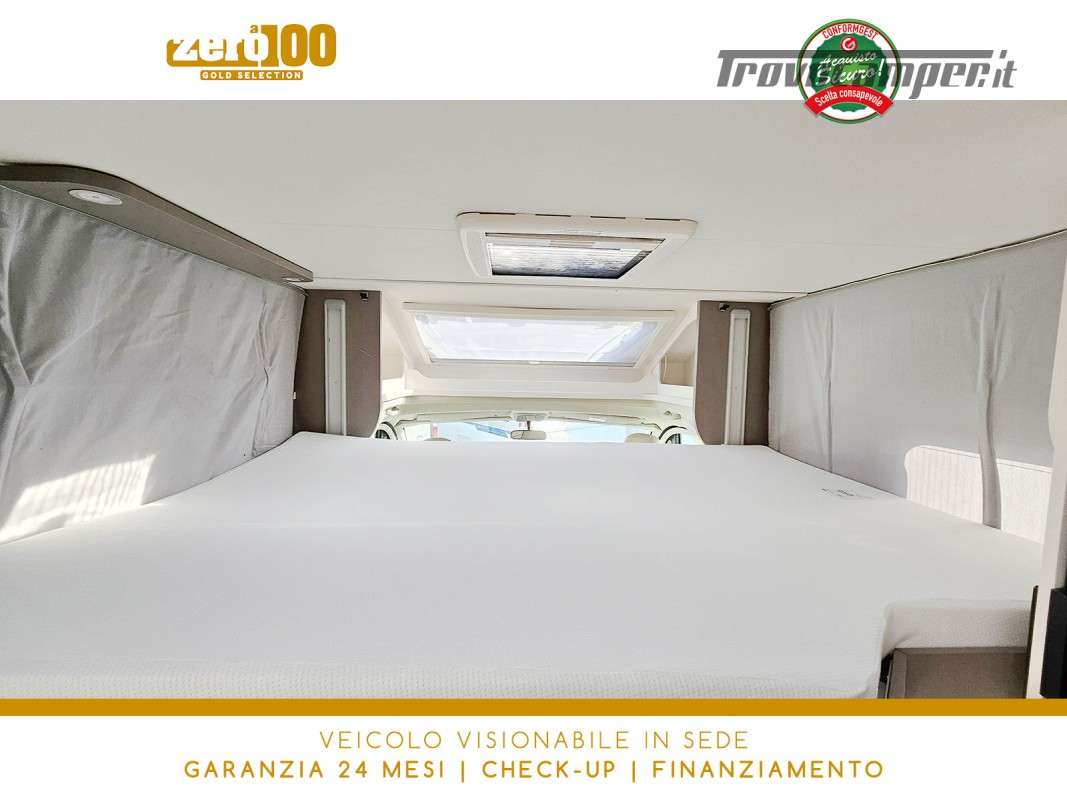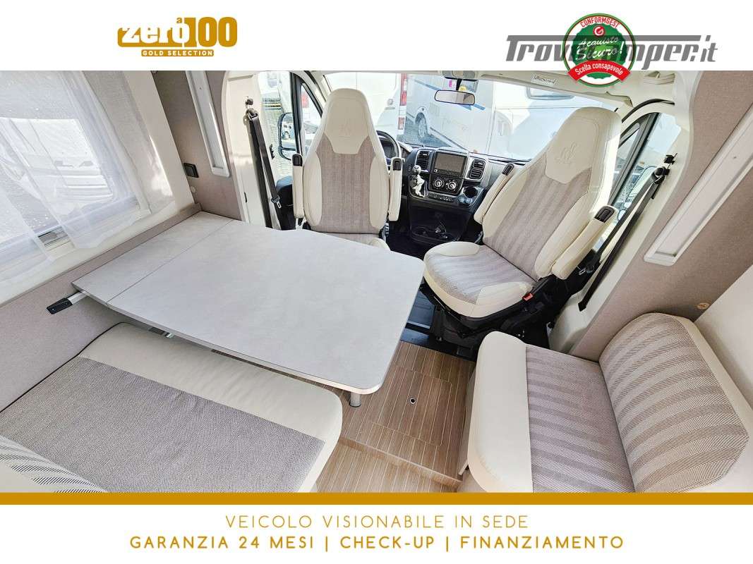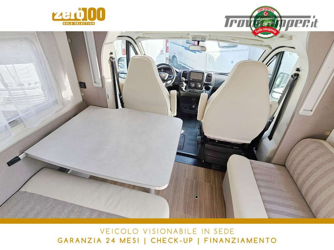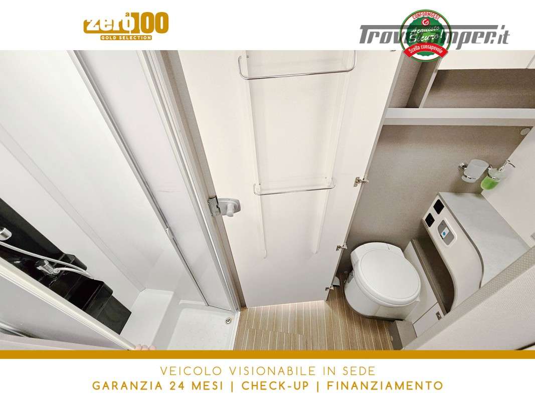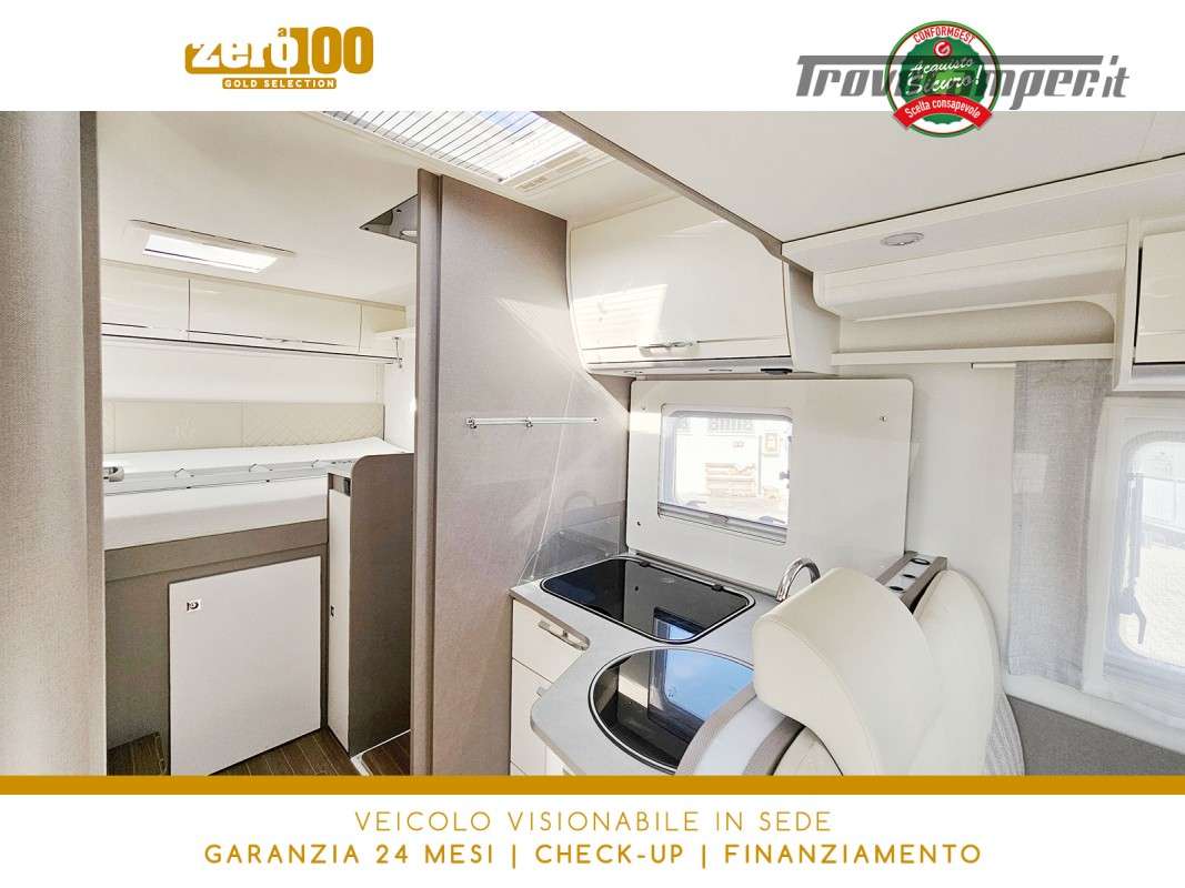 Letto matrimoniale trasversale in coda - Mezza dinette con sedili cabina girevoli trasformabile in letto singolo - Letto basculante anteriore elettrico - Cucina a L 3 fuochi con frigorifero trivalente con cella frigorifera separata - Bagno diviso in due zone con separazione doccia - Garage