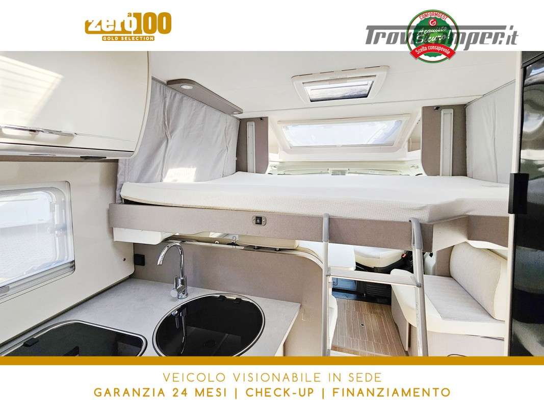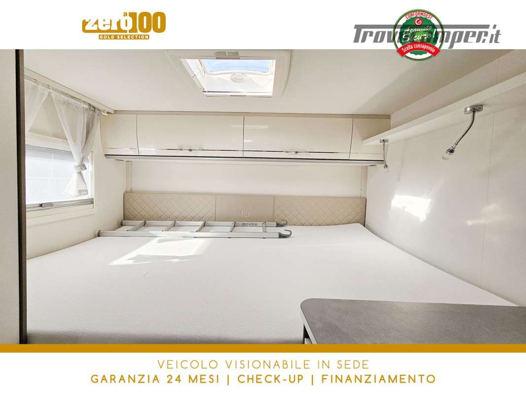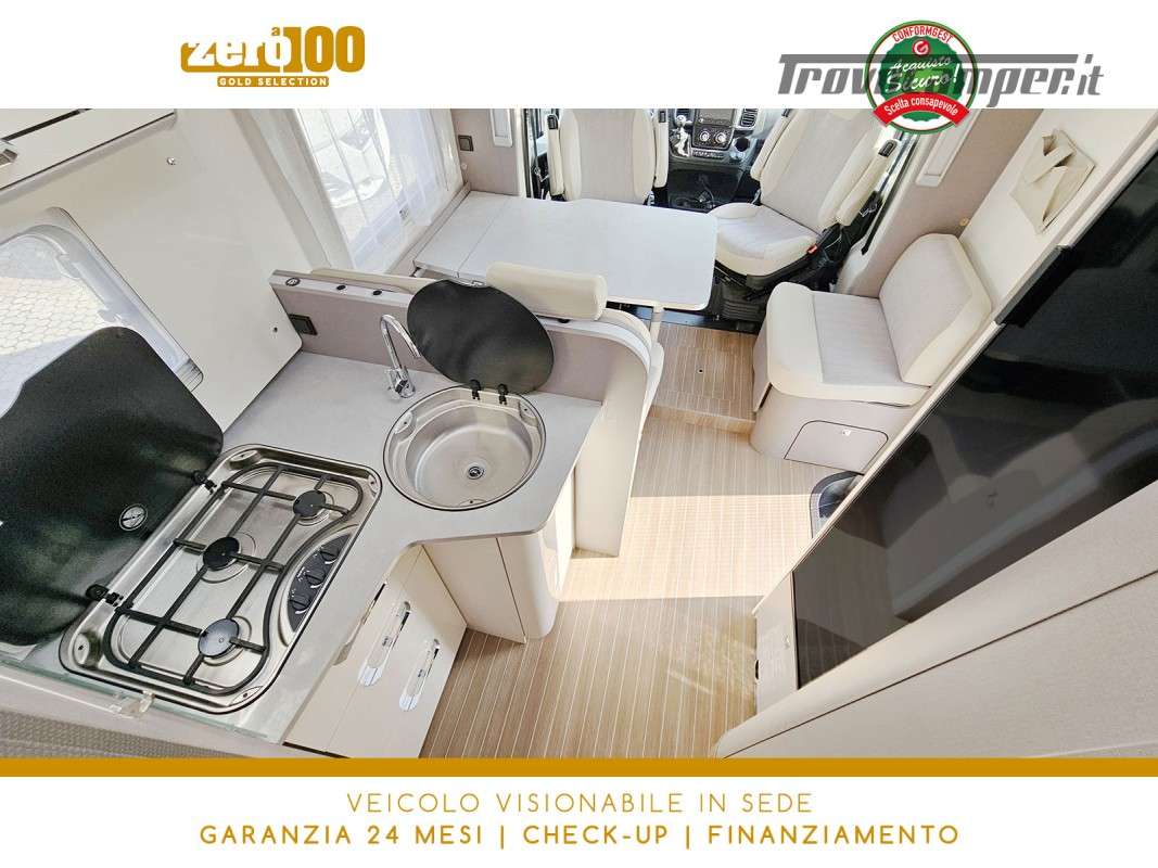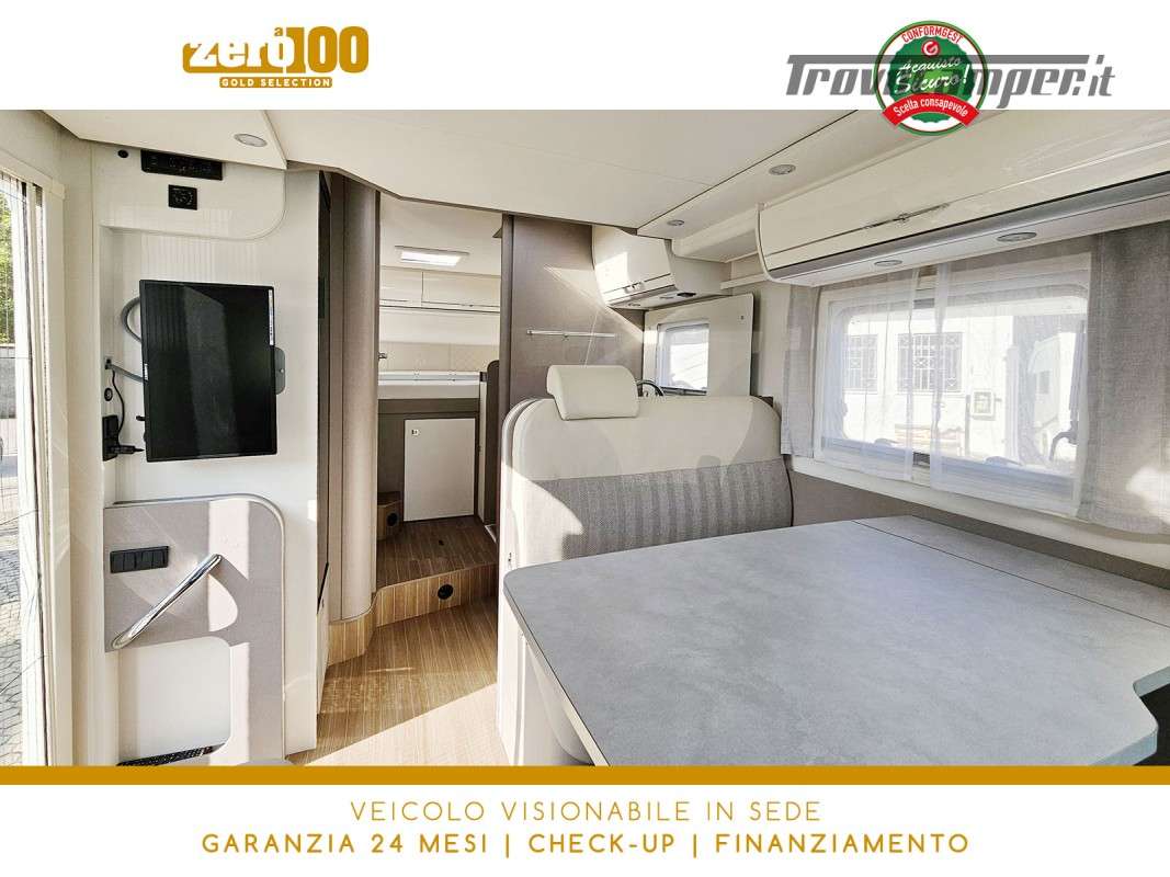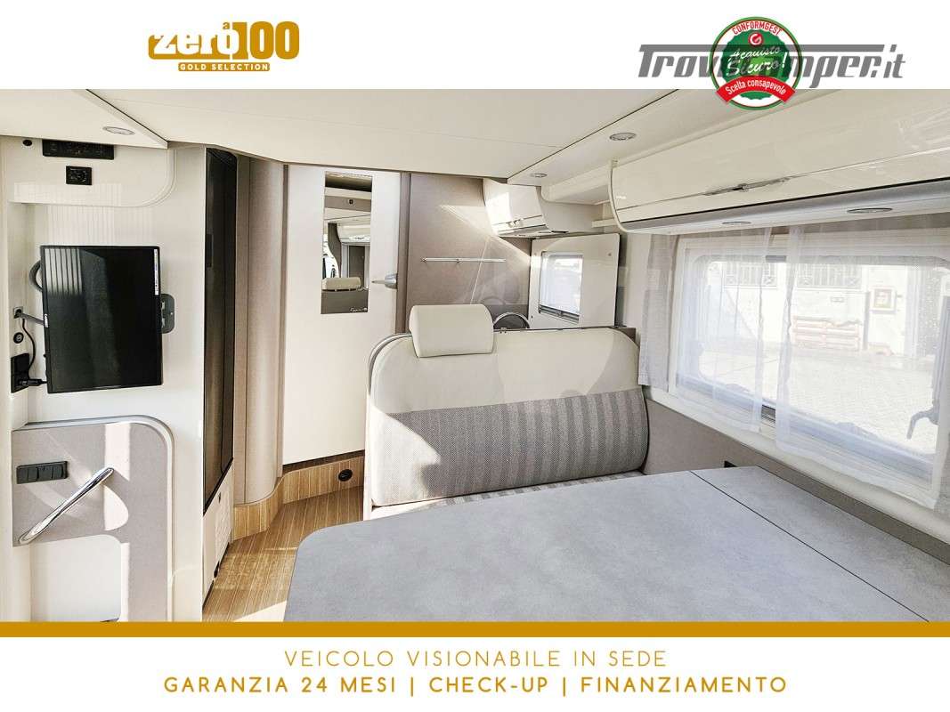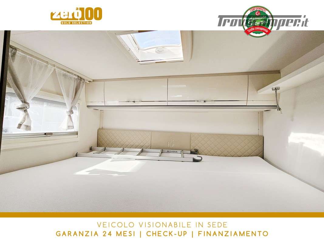 Letto matrimoniale trasversale in coda - Mezza dinette con sedili cabina girevoli trasformabile in letto singolo - Letto basculante anteriore elettrico - Cucina a L 3 fuochi con frigorifero trivalente con cella frigorifera separata - Bagno diviso in due zone con separazione doccia - Garage