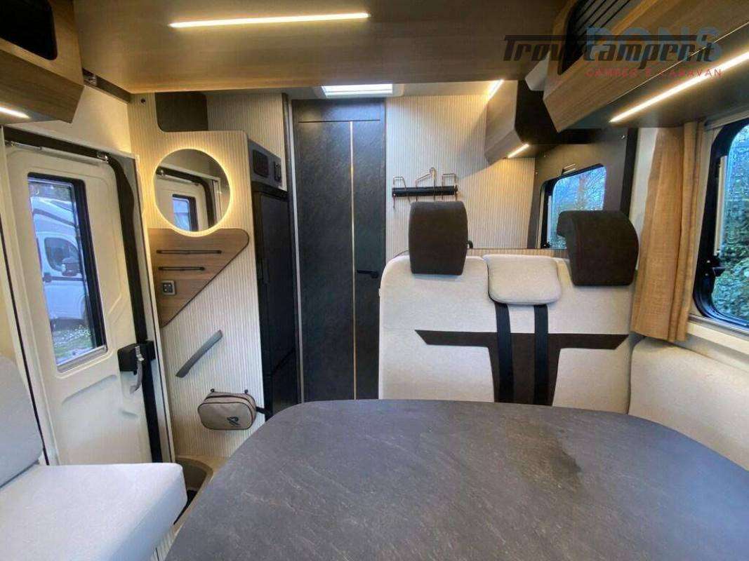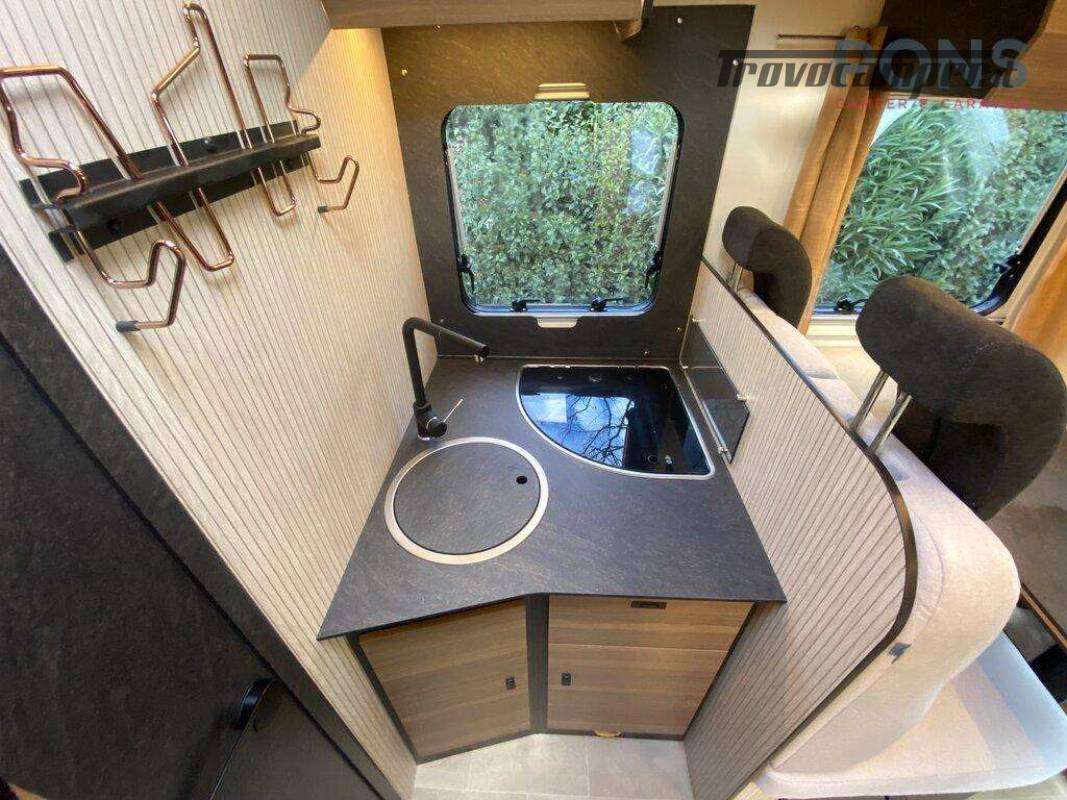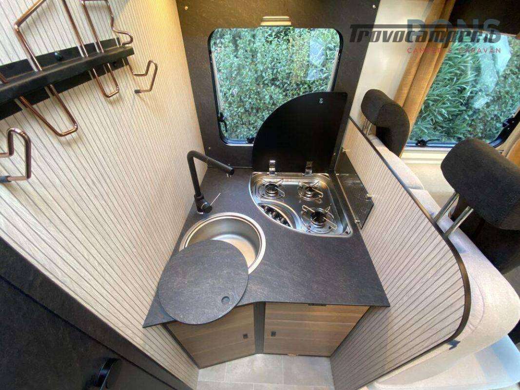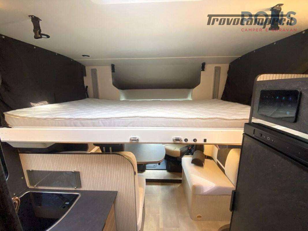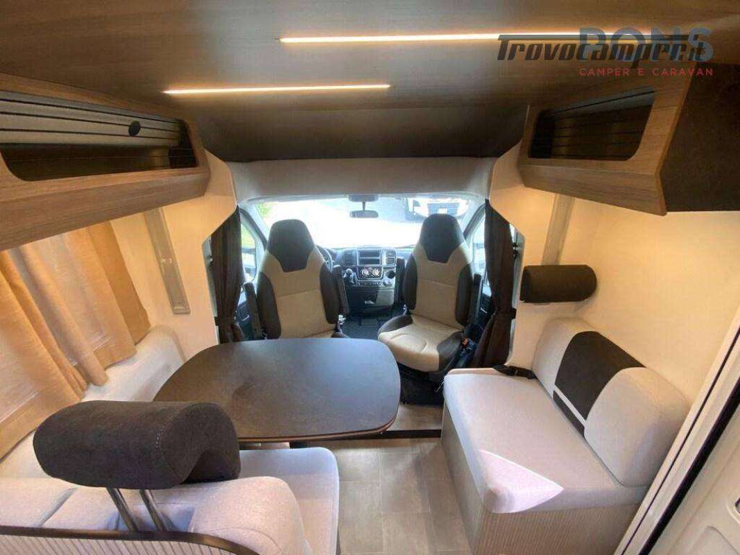I due sedili della cabina girevoli e i due divanetti creano una comoda dinette con tavolo ruotabile, un letto basculante soprastante, cucina compatta con piano cottura a 3 fuochi, spazioso lavabo e di fronte un frigorifero con scomparto freezer.