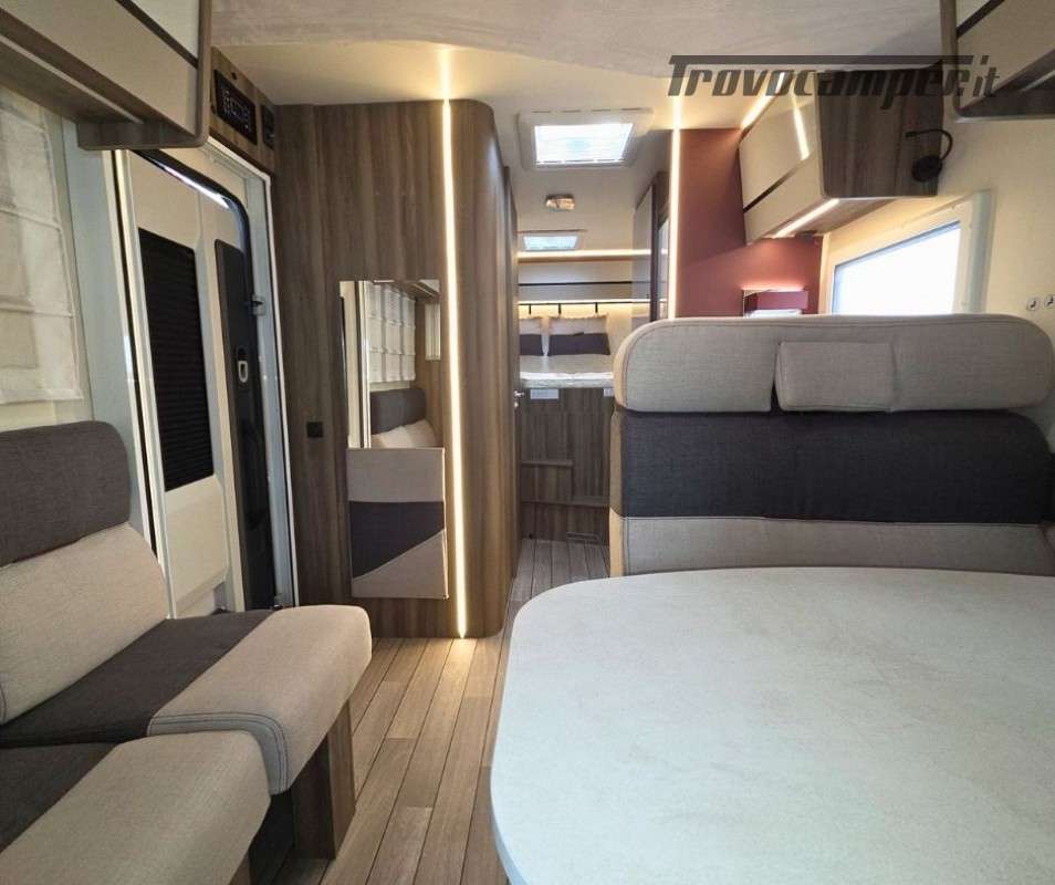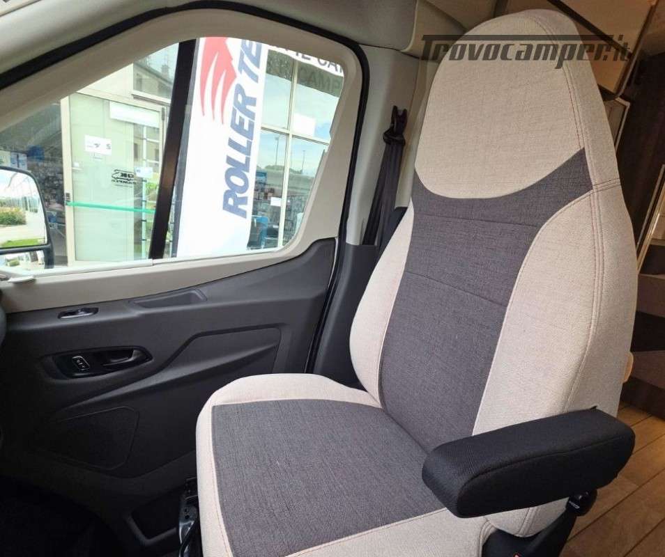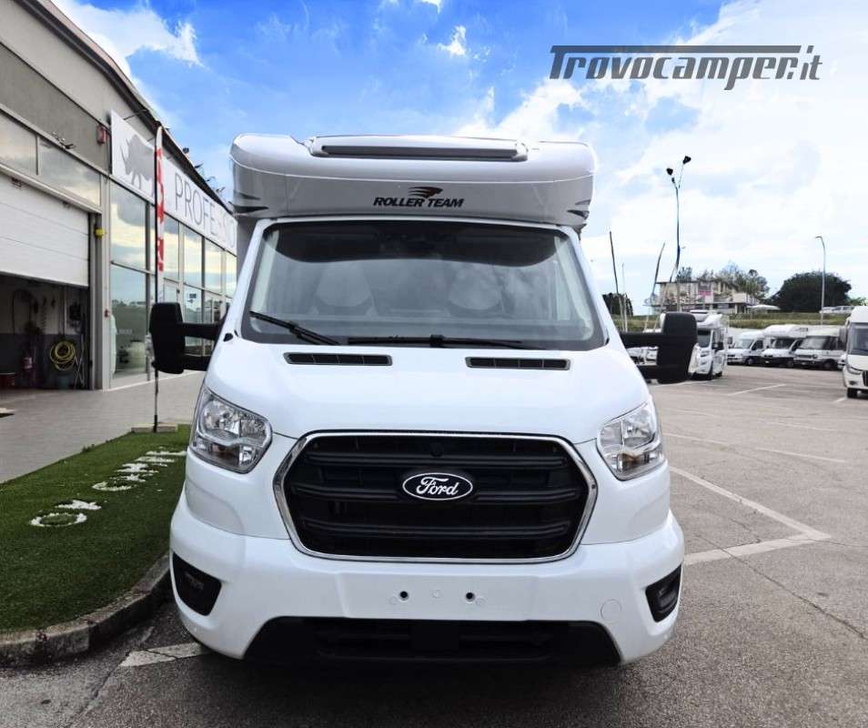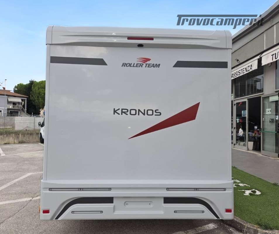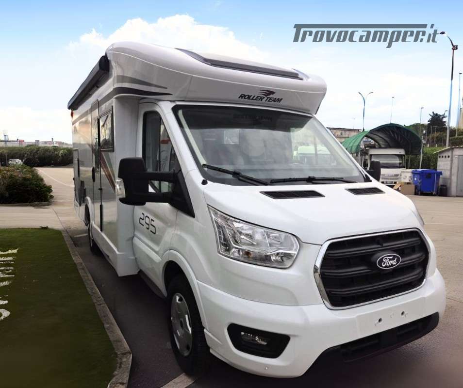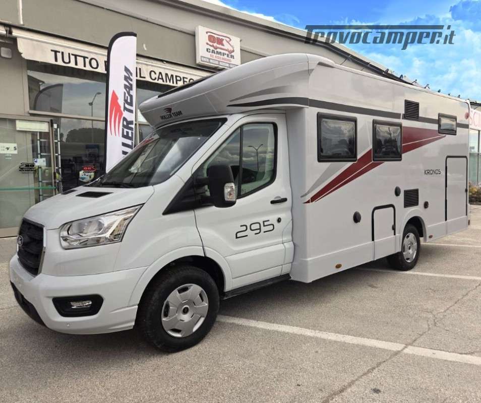 Roller Team Kronos 295 TL su Ford Transit 2000, 165 CV, 5 posti viaggio e 5 posti letto. Camper versatile e moderno con dotazioni premium: retrocamera, cruise control intelligente, climatizzatore automatico, skyroof e pannello solare 200W. Perfetto per viaggi in famiglia, comfort e sicurezza al top in ogni avventura.