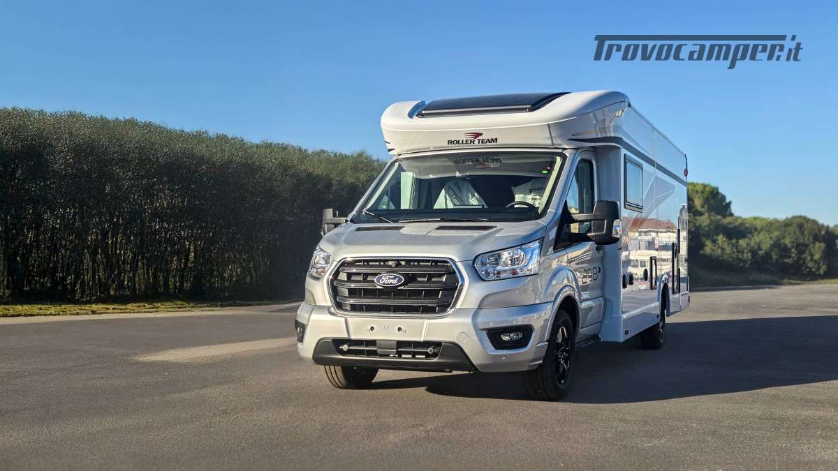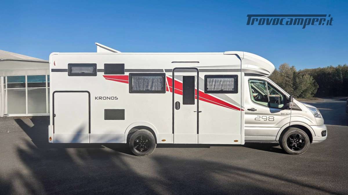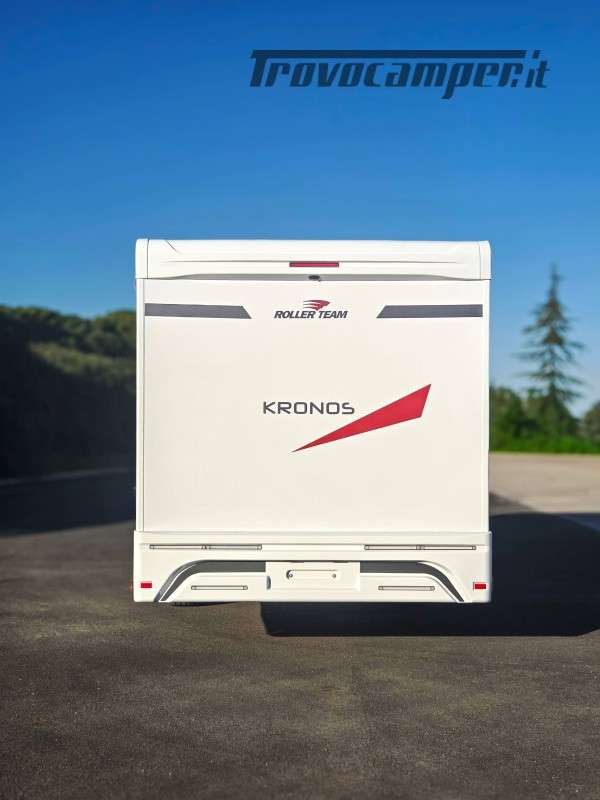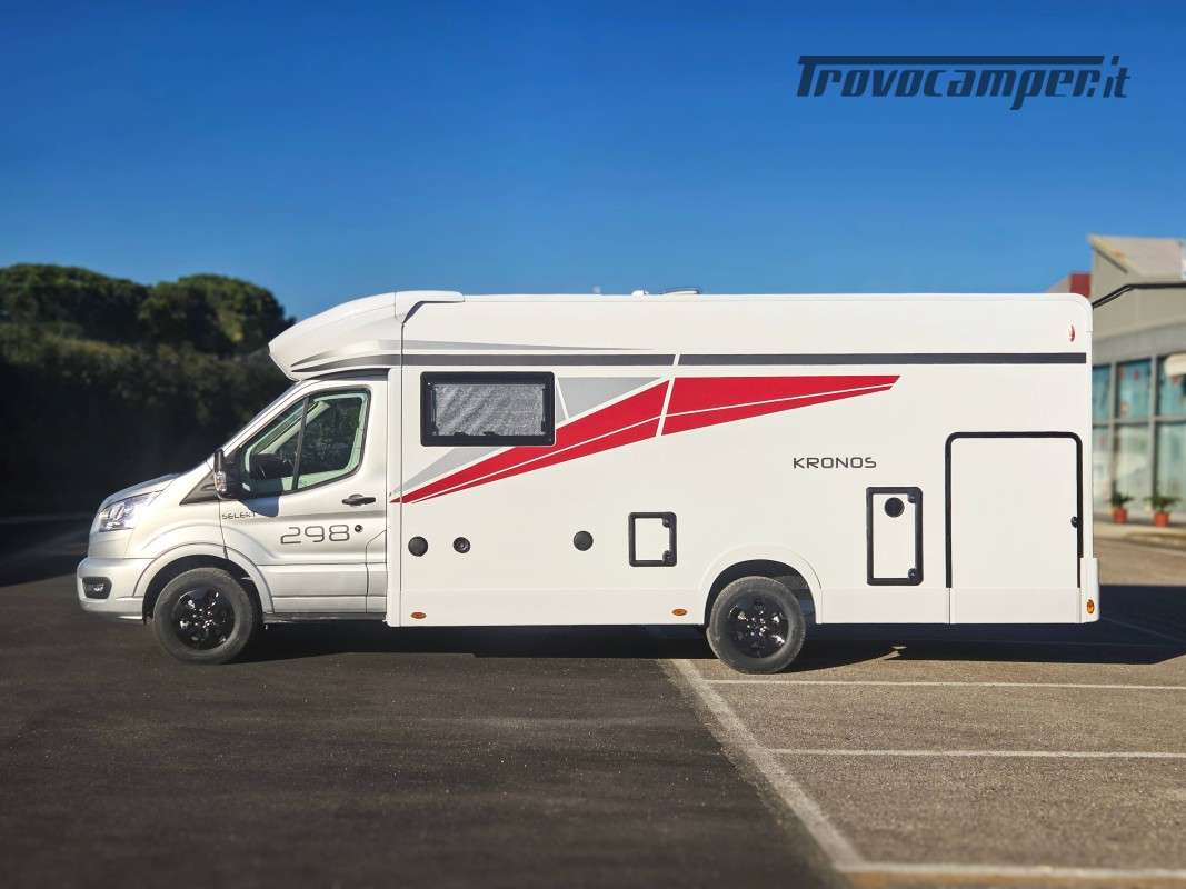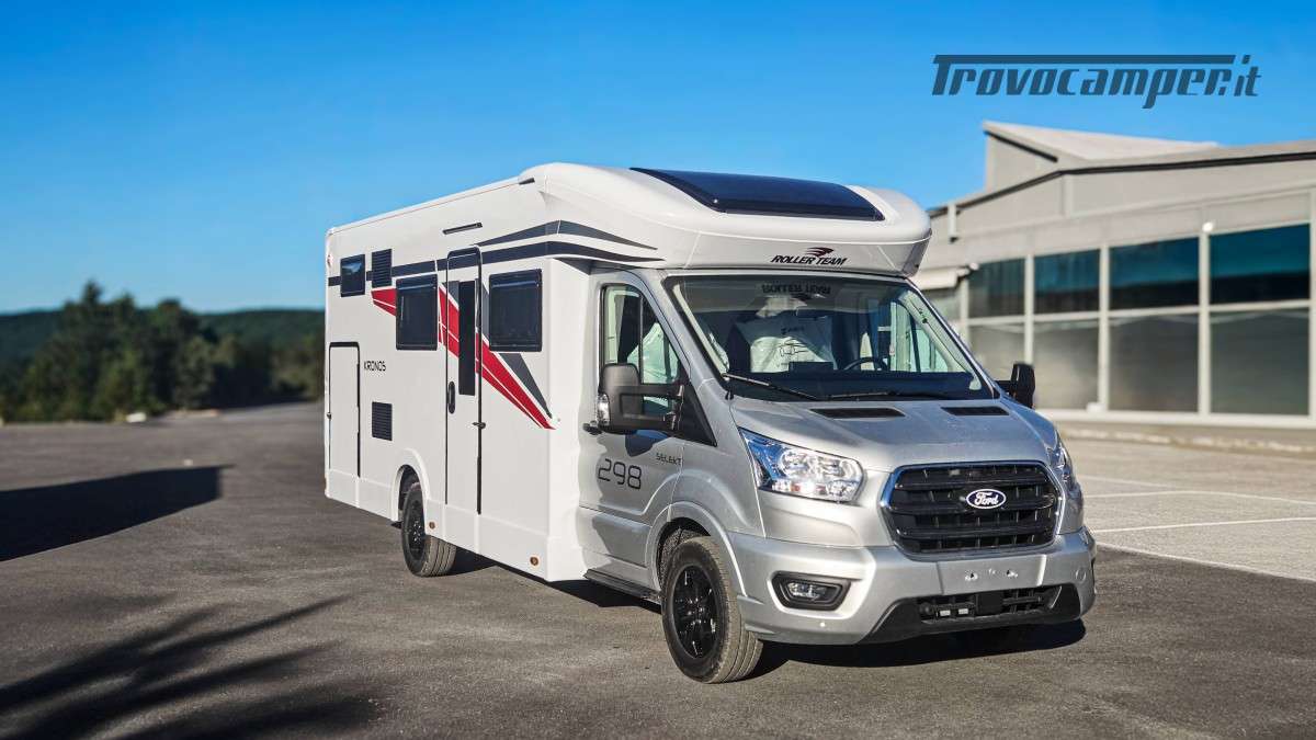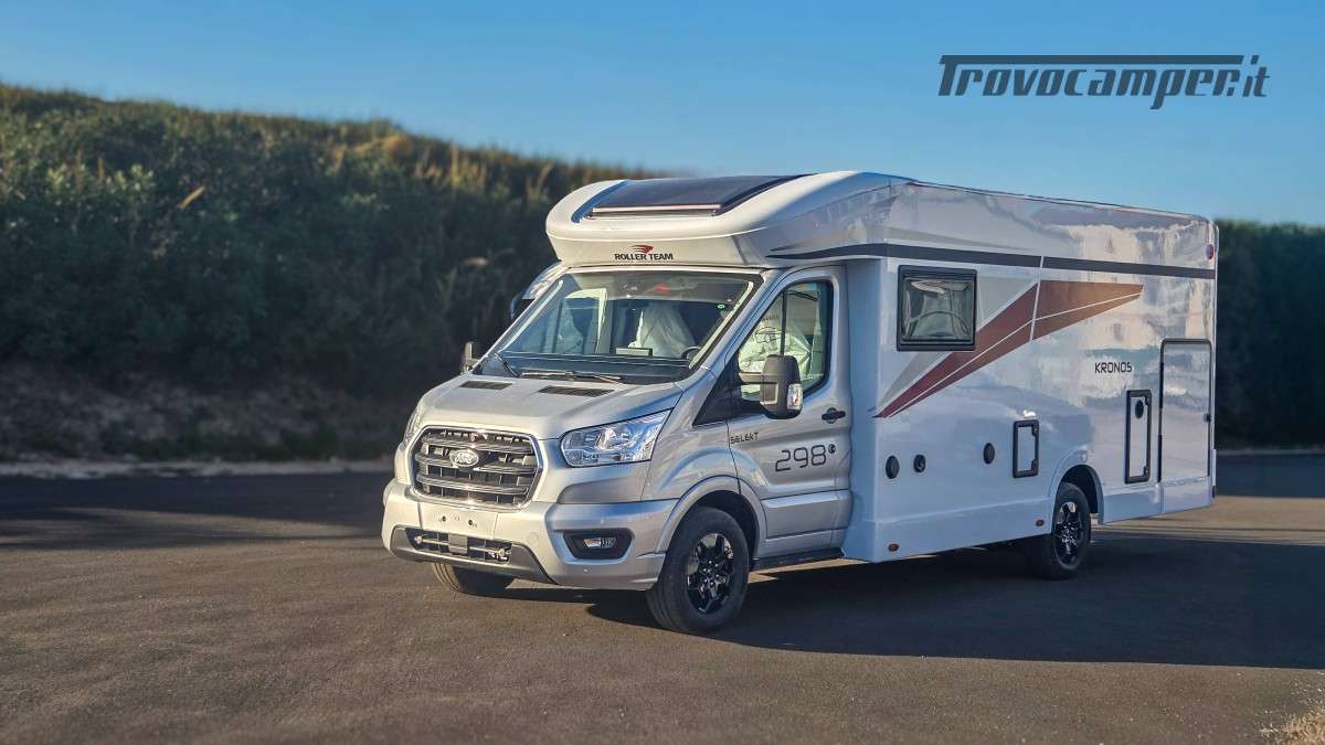 Il Roller Team Kronos 298 TL è un semintegrale di grandi dimensioni ($743\ \text{cm}$ di lunghezza) concepito specificamente per le famiglie numerose (5 posti omologati e 5 posti letto). Offre il massimo comfort e sicurezza, grazie anche alla motorizzazione Ford Transit $2000$ da $165\ \text{CV}$ potenziata dal Pack Selekt che include il cambio automatico a 8 marce. Si distingue per una dotazione di serie eccezionalmente ricca (Pack Kronos Ford) e per l'integrazione delle più avanzate tecnologie di assistenza alla guida (Pack Extra Assistance Ford), che rendono l'esperienza di viaggio fluida, sicura e rilassante.