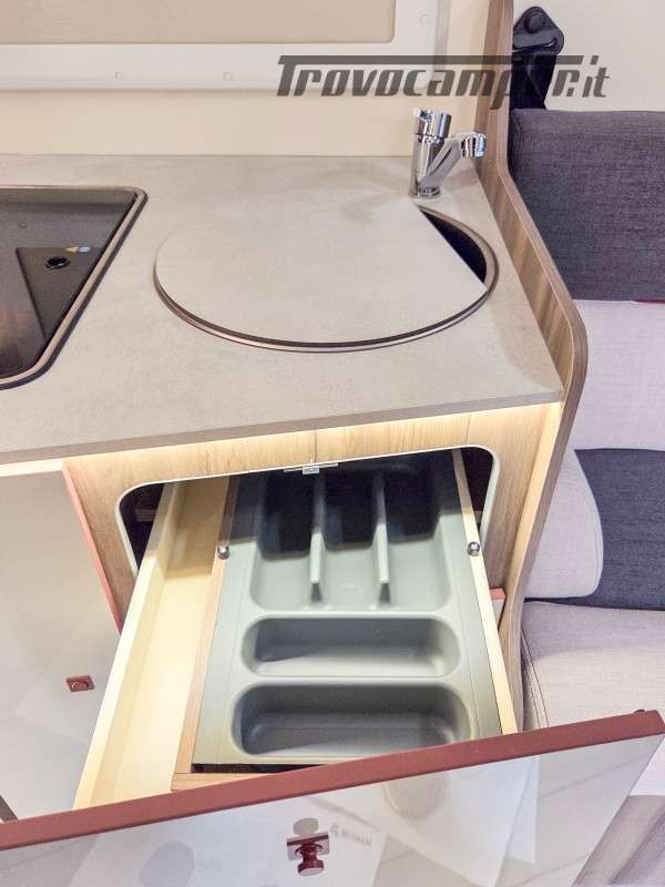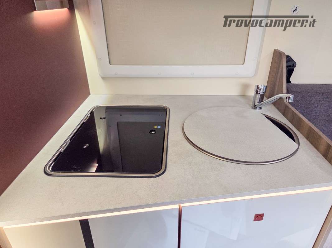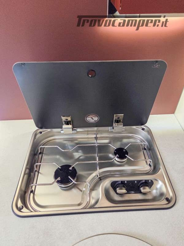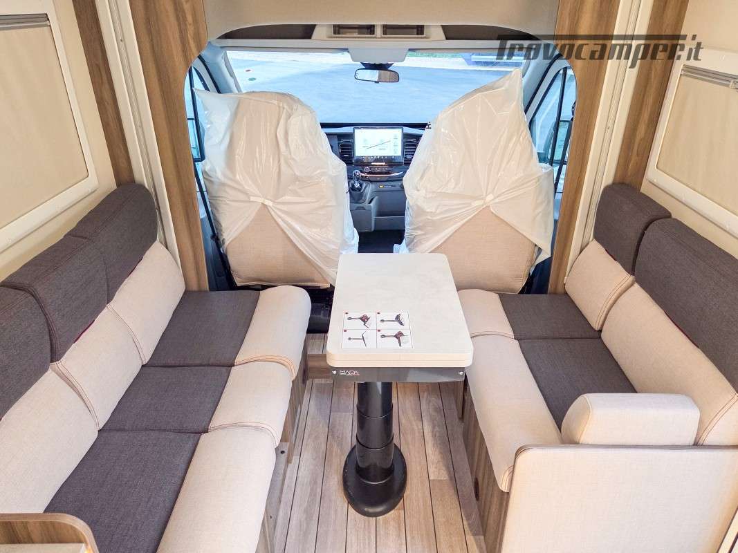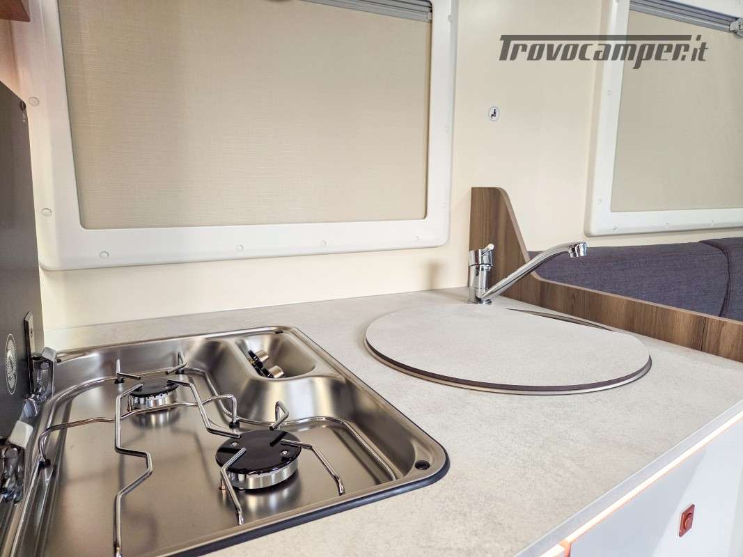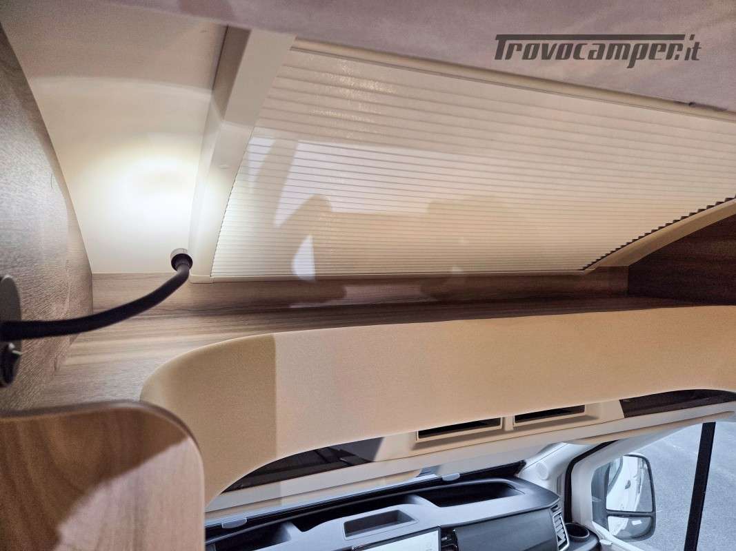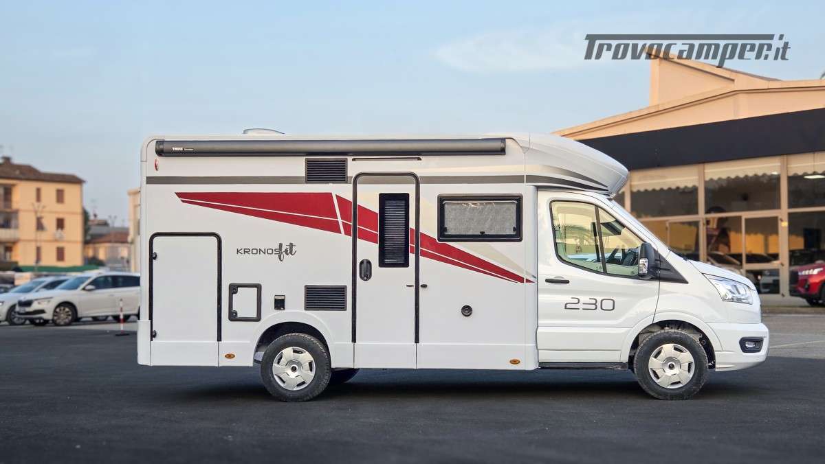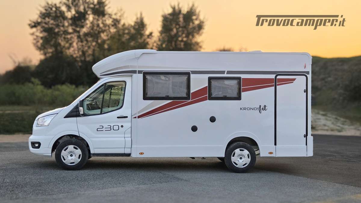 Il Kronos Fit 230 TL è una soluzione ideale per famiglie e gruppi, grazie ai suoi 4 posti omologati e 4 posti letto ben distribuiti. Le sue dimensioni ottimizzate (639 cm di lunghezza, 215 cm di larghezza e 285 cm di altezza) lo rendono facile da guidare quanto un furgonato, pur offrendo il comfort e gli spazi di un camper profilato.