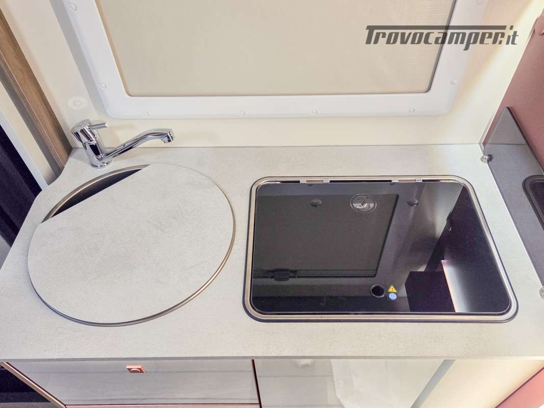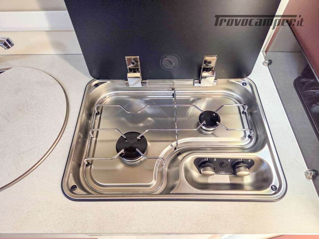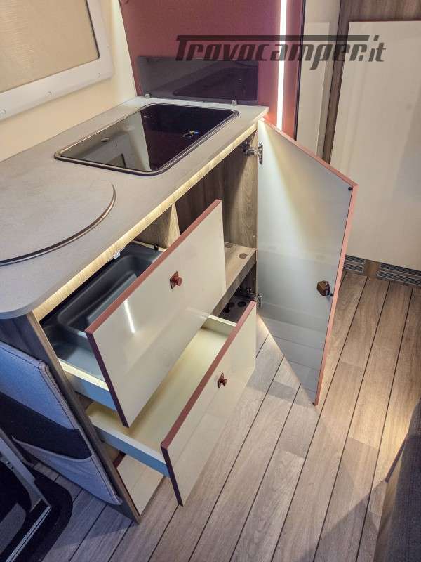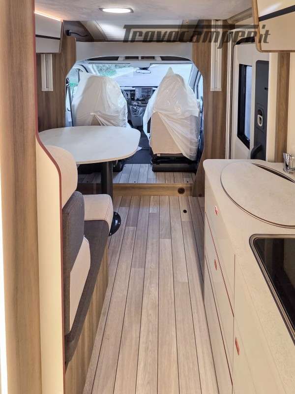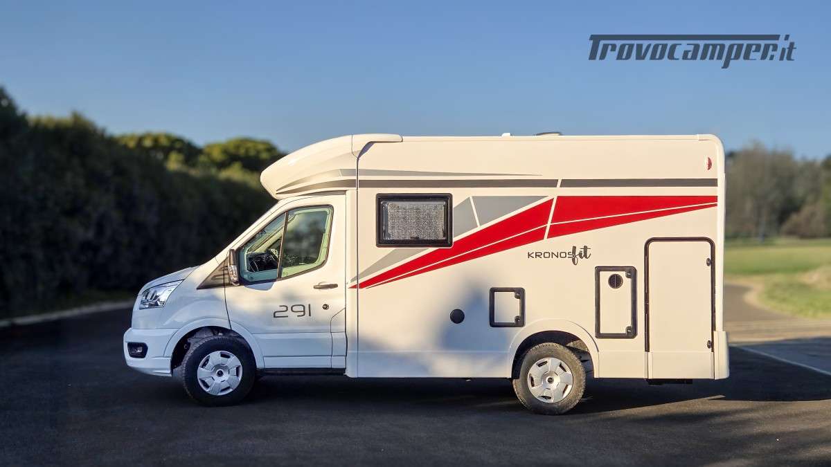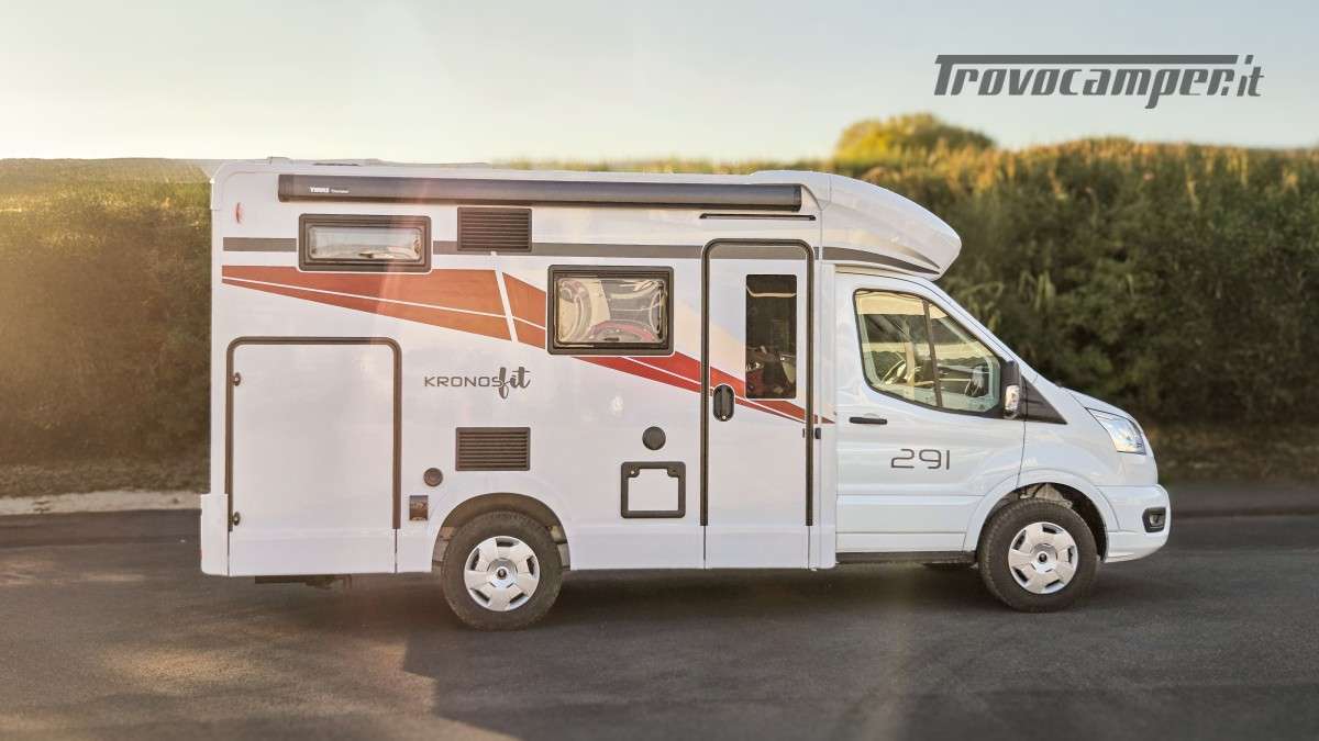 Il Kronos Fit 291 TL è perfetto per coppie o piccole famiglie, offrendo 4 posti omologati e 3 posti letto. Le sue dimensioni ridotte (599 cm di lunghezza, 215 cm di larghezza e 285 cm di altezza) lo rendono particolarmente agile, facile da parcheggiare e ideale per viaggiare senza stress anche su strade secondarie e in città.