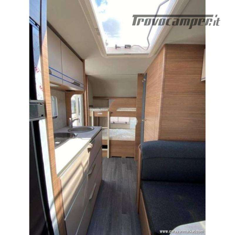 LA SUA DISPOSIZIONE PREVEDE LETTO MATRIMONIALE TRASVERSALE, BAGNO CON LAVADINO E BOX DOCCIA SEPARATO, DINETTE CLASSICA TRASFORMABILE IN LETTO, CUCINA CON FRIGO GRANDE A COLONNA, LETTO A CASTELLO IN CODA E AMPIO ARMADIO. Caratteristiche di Serie & Dotazioni di Serie Tetto in Vetroresina Spessori: Tetto (mm.): 31 Pareti (mm.): 31 Pavimento (mm.): 38
