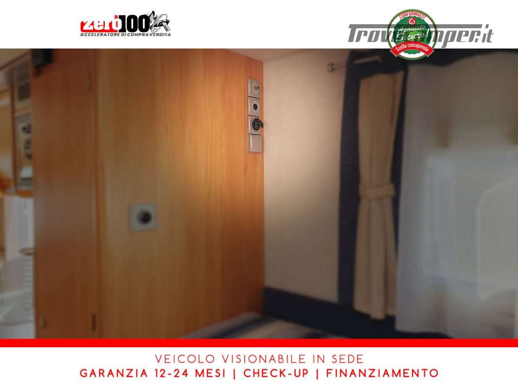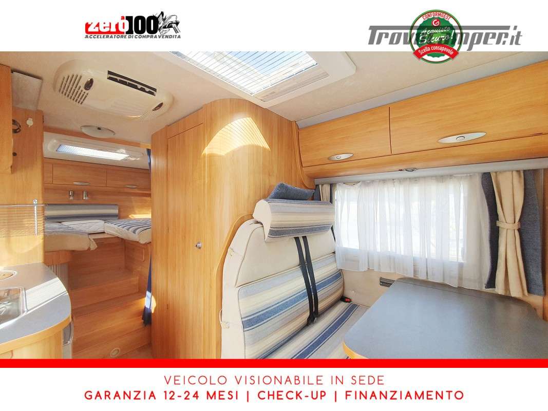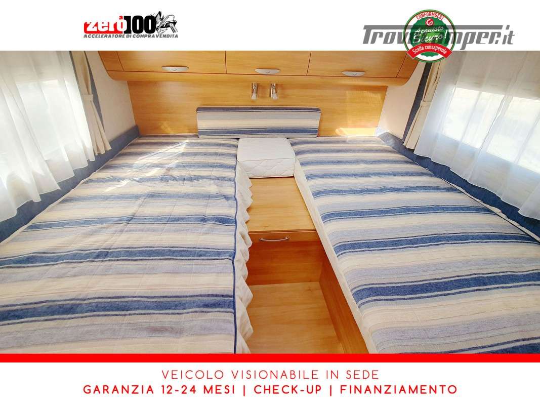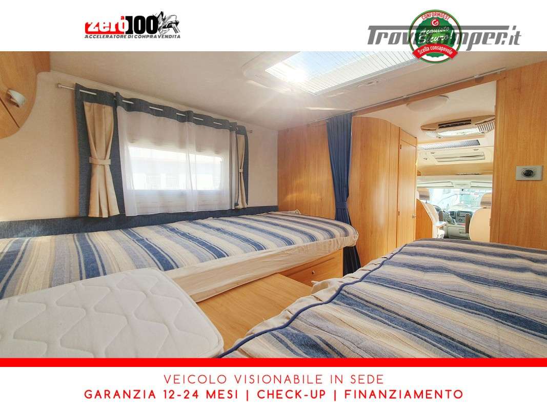 Letti gemelli in coda con garage a volume variabile accessibile da entrambi i lati - Mezza dinette con sedili anteriori girevoli trasformabile in letto matrimoniale - Cucina lineare con piano cottura 3 fuochi, cappa aspirante e forno - Frigorifero 110 lt - Bagno con doccia separata
