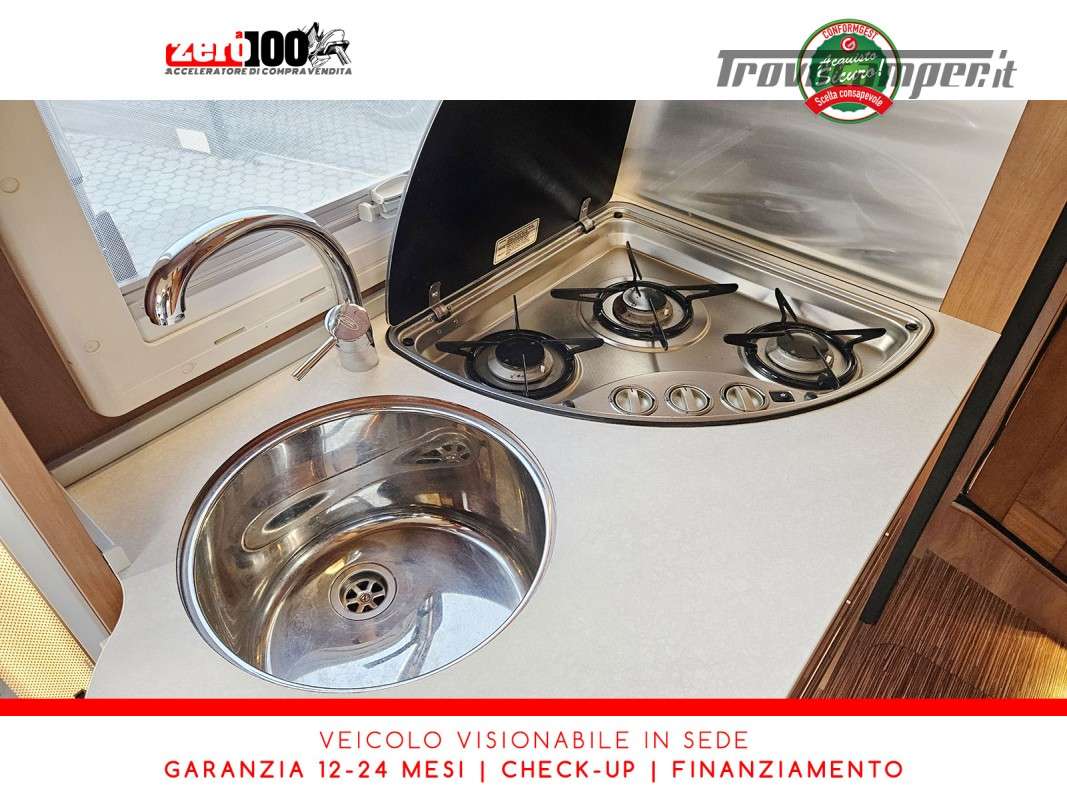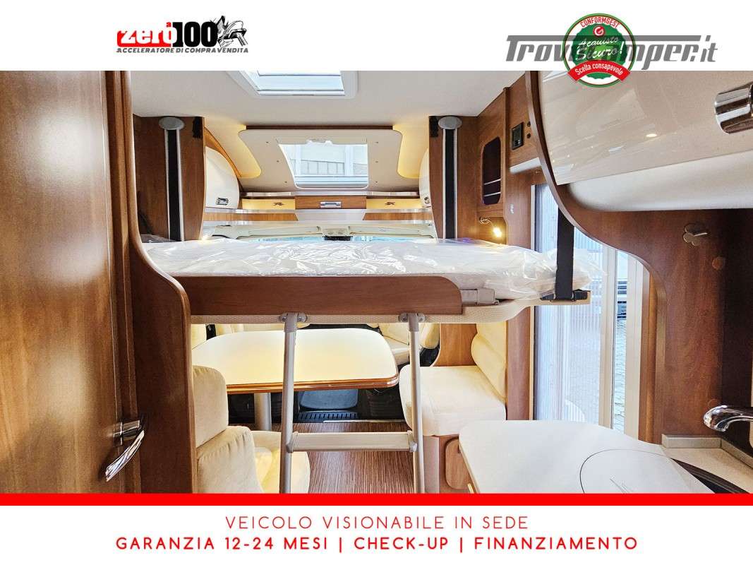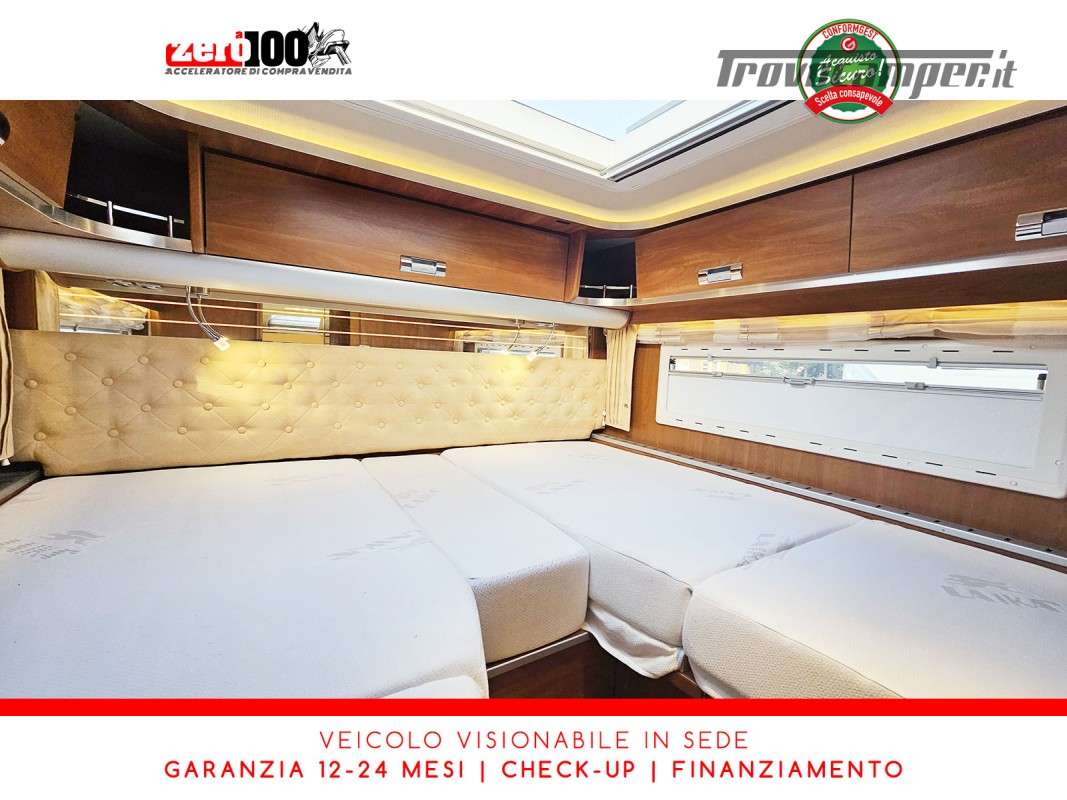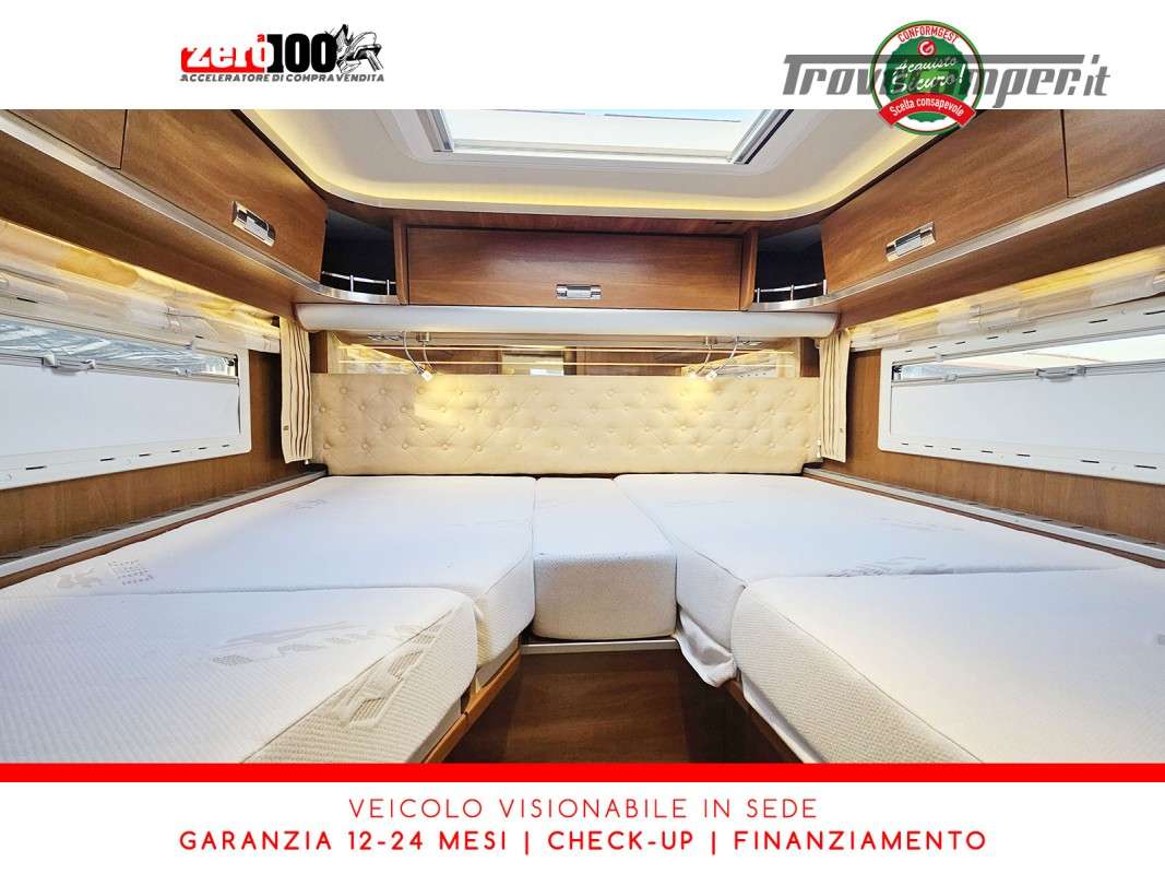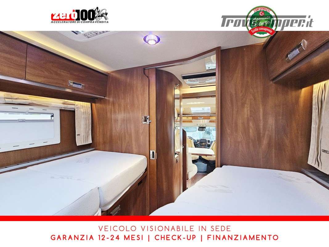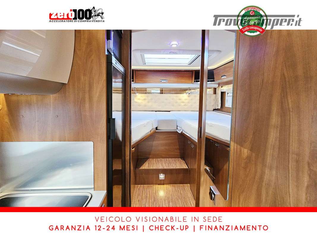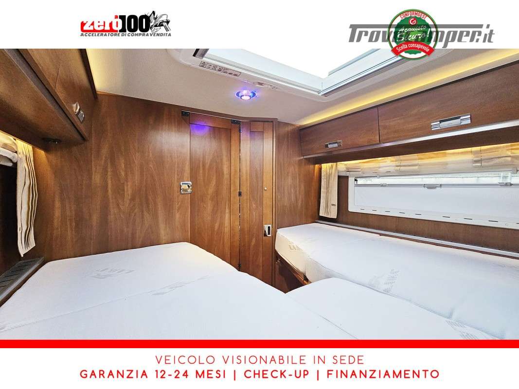 Letti gemelli in coda - Mezza dinette con sedili cabina girevoli - Letto basculante sopra dinette elettrico - Cucina lineare 3 fuochi con piezo, cappa aspirante e forno a gas - Frigorifero trivalente alto - Bagno con finestra e box doccia separato - Garage