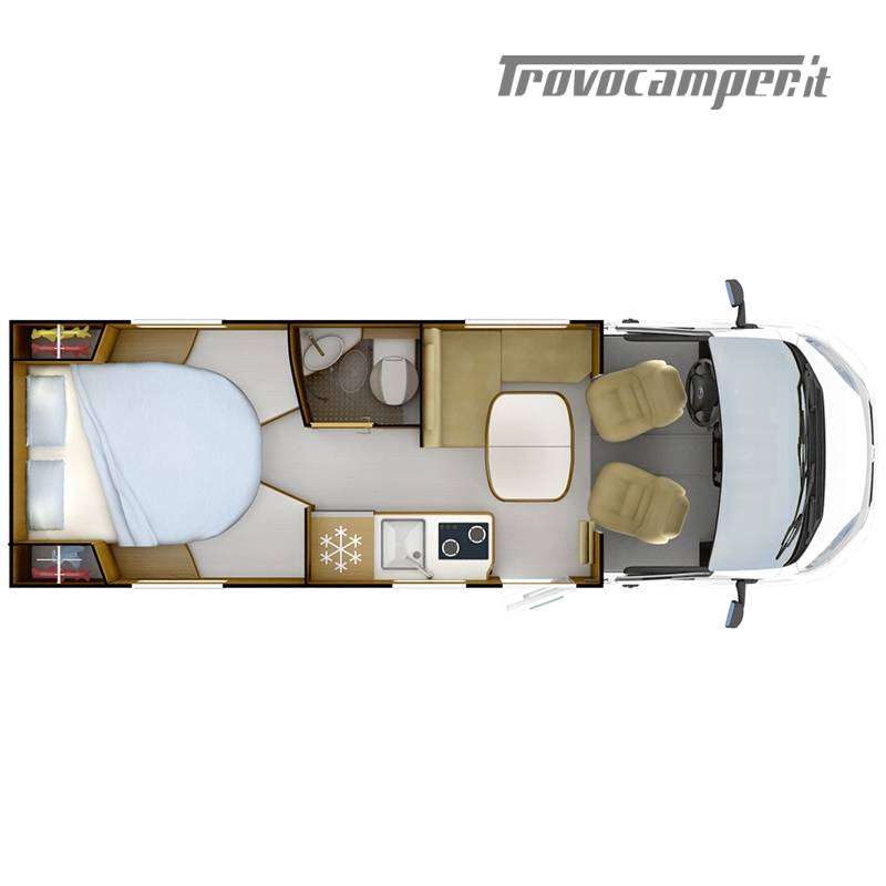 Zona notte: letto matrimoniale nautico in coda misure 140x195, sollevabile elettricamente, traslabile avanti/indietro, porta tra zona letto e zona giorno, terzo posto in dinet.