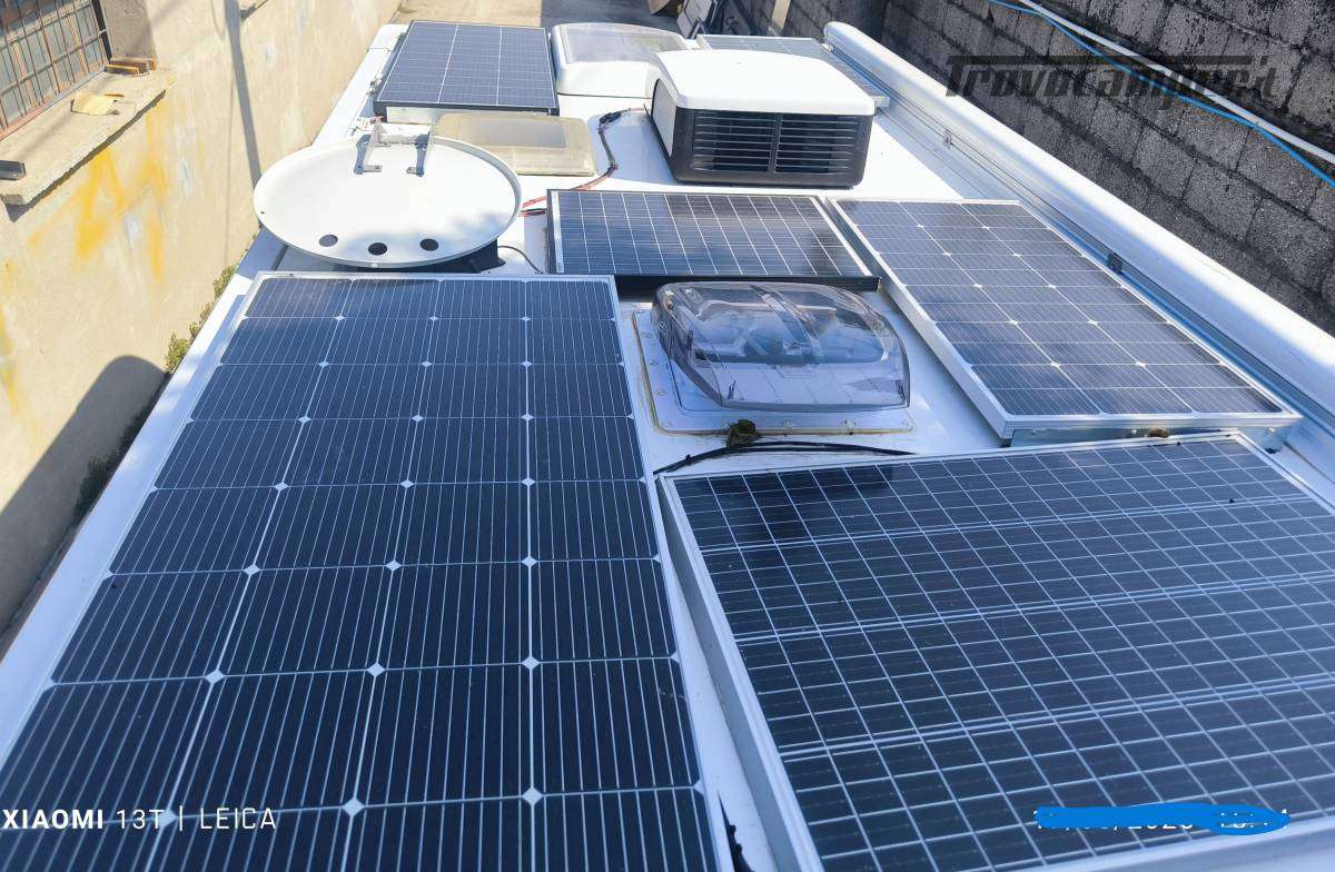 Impianto elettrico: 2 batterie LIfepo4 Bluetooth totale 600AH, inverter 3000w, collegato su tutte le prese, secondo inverter 600w, impianto fotovoltaico da 800W con MPPT Victron smart 50AH, mppt suplementare, ricarica da alternatore con 2 DC DC Redarc (totale 80AH), stacca batterie, ventole automatiche aspirazione aria calda da garage e zona frigo.