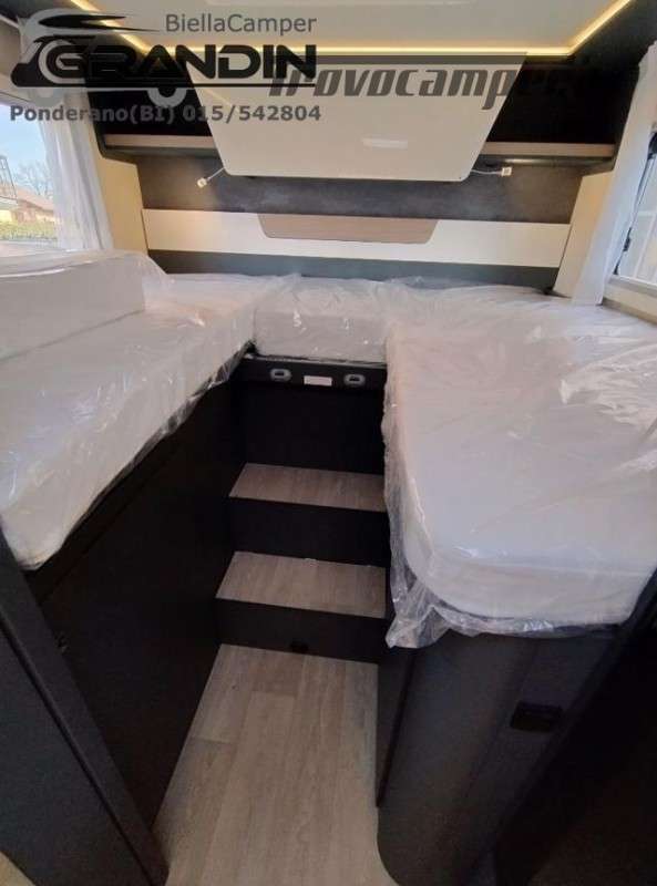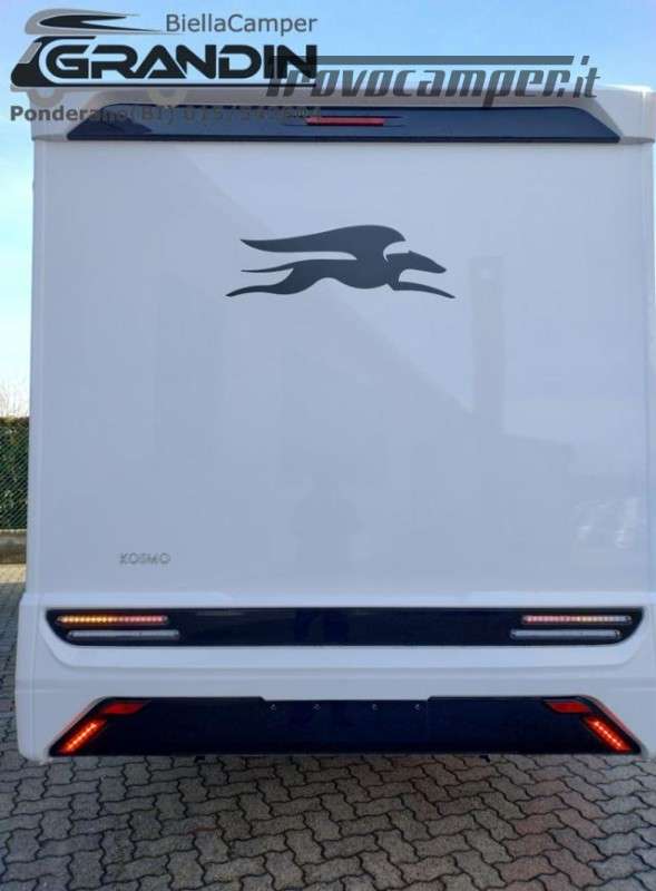 Pack One Kosmo : Fodere cabina coordinate con il soggiorno, Cupolino con skyview integrato, apribile, Letto basculante elettrico sopra il soggiorno (Installando il letto basculante sopra al soggiorno, l'oblò panoramico è spostato nella camera da letto posteriore e sostituito da un oblò da 40x40 cm), Cappa aspirante in cucina, Predisposizione retrocamera, Serbatoio di recupero riscaldato, Oscuranti interni plissettati in cabina per parabrezza e cristalli laterali, Predisposizione pannello solare, Pedana in legno per la doccia, Moquette cabina guida, Porta cellula Premium XL con chiusura centralizzata con telecomando, finestra, oscurante, vani di stivaggio e pistone a gas, Pareti camera da letto posteriore rivestite in Ecopelle, Cestelli e portabottiglie estraibili in cucina, Tappezzeria Siena, Cuscini Liguria,