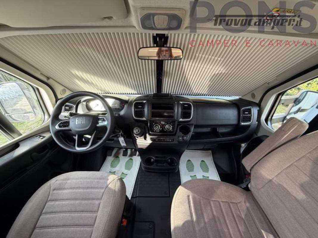 In coda trovi una vera camera matrimoniale con letto centrale, armadi e pensili, mentre il letto basculante elettrico sopra la dinette offre altri due posti letto pronti in pochi secondi.