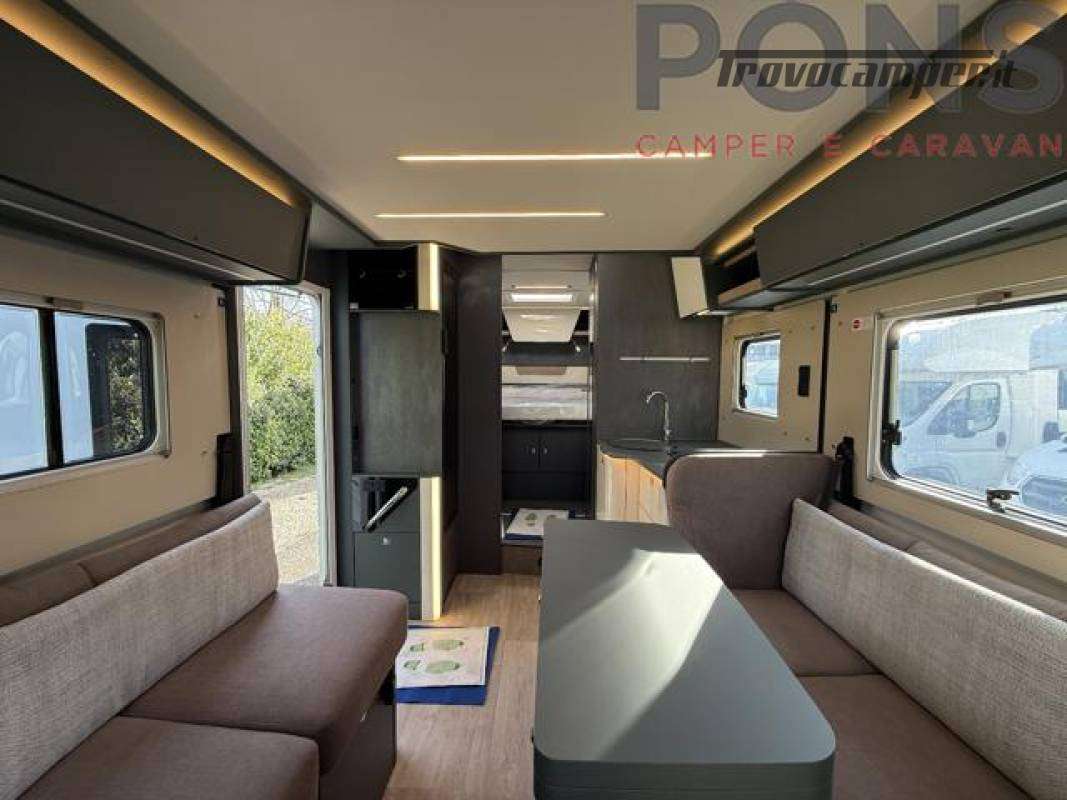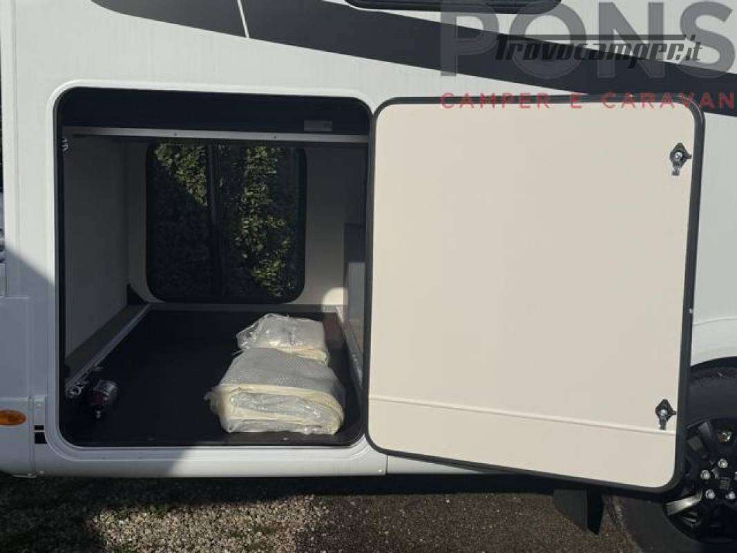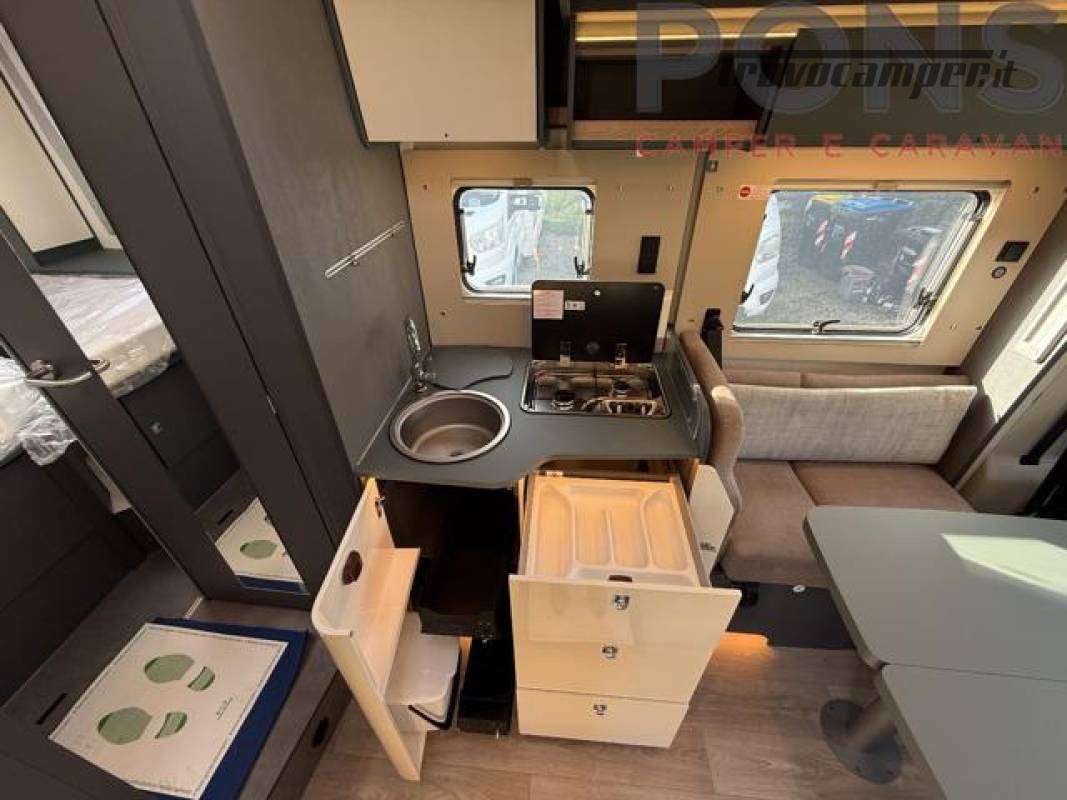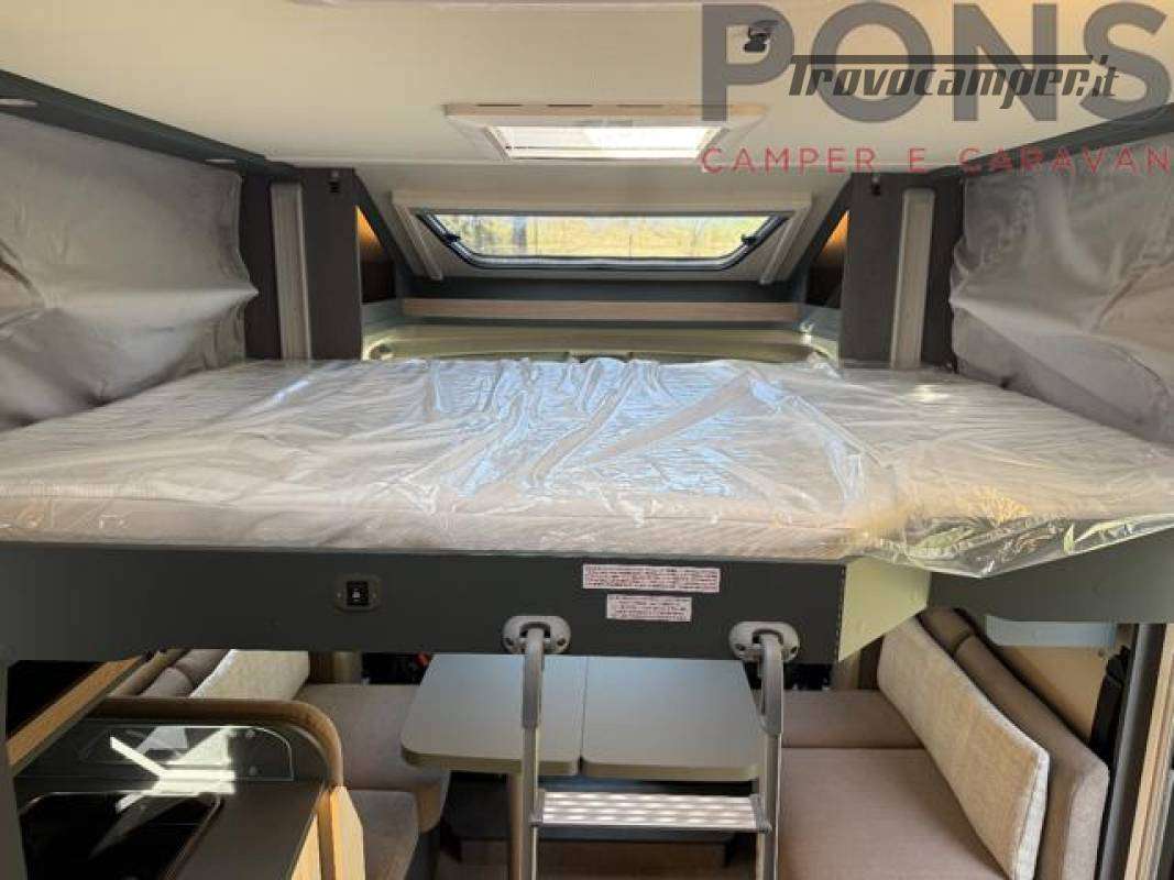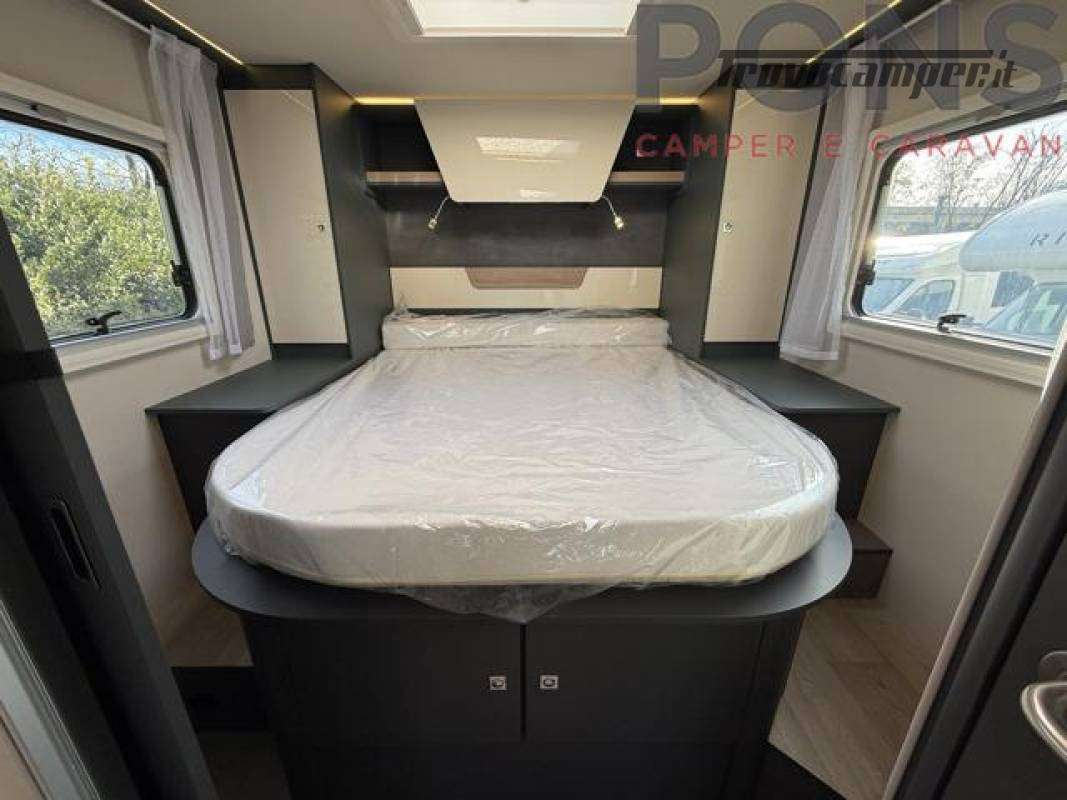 In coda trovi una vera camera matrimoniale con letto centrale, armadi e pensili, mentre il letto basculante elettrico sopra la dinette offre altri due posti letto pronti in pochi secondi.