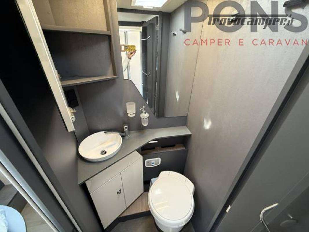 Il blocco toilette è elegante e pratico, con wc, lavabo e numerosi vani portaoggetti; di fronte la doccia indipendente con colonna e pedana in legno garantisce il comfort di casa anche in viaggio.