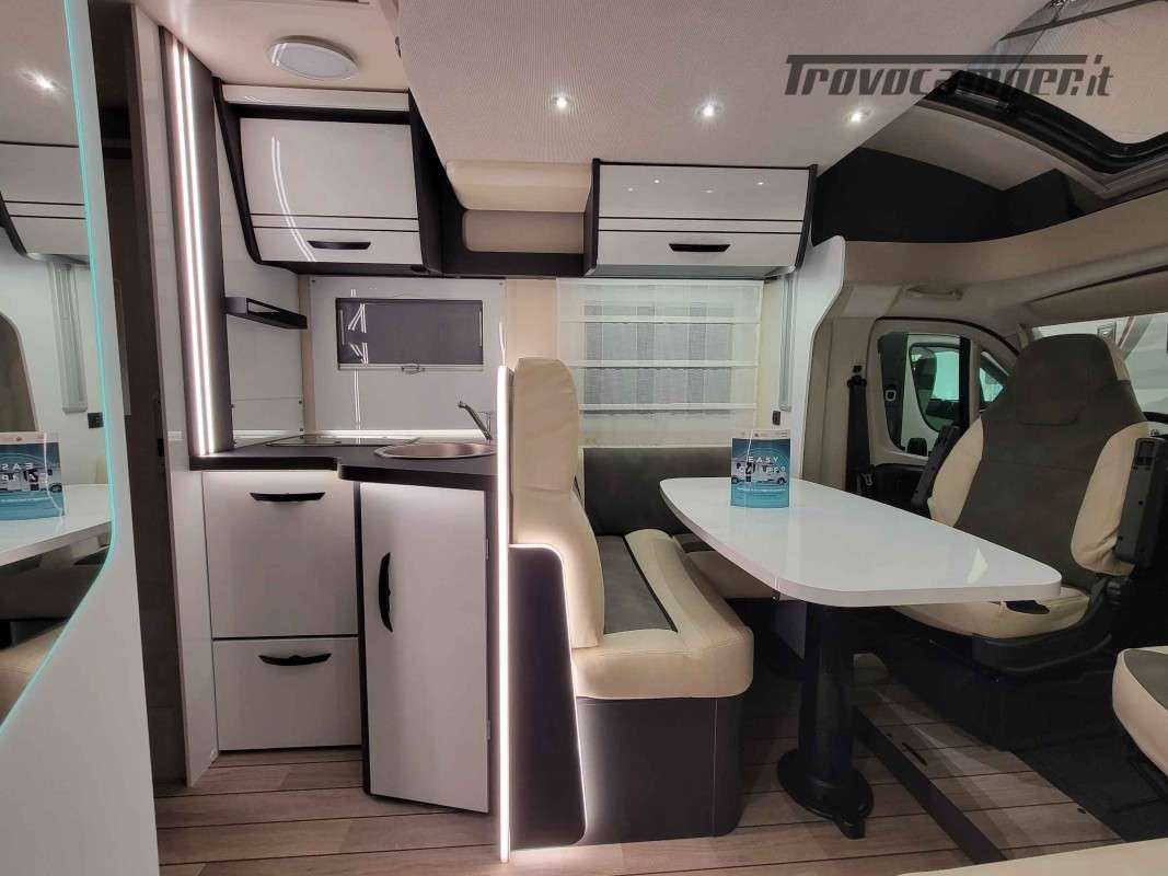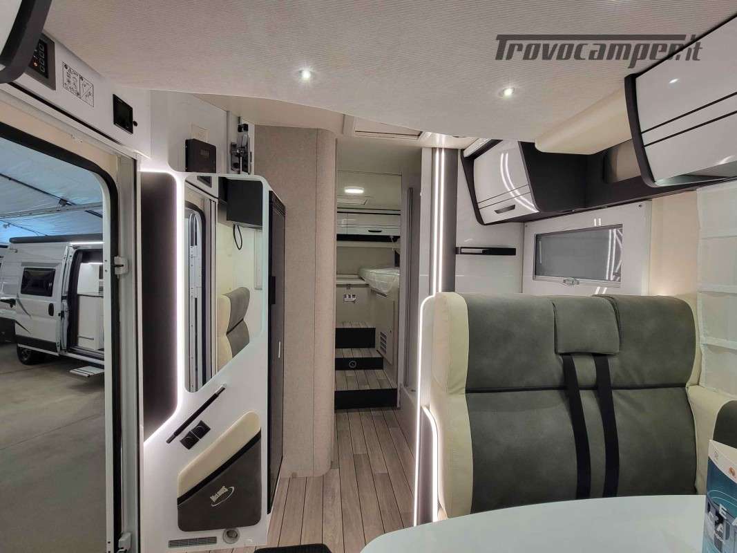 Cucina a L con piano cottura a 2 fuochi, lavello a vasca tonda in acciaio spazzolato. Toilette compatta con oblò 28×28, doccia integrata con ante rigide pieghevoli e rubinetto estraibile. Un cestone soft-close, con cassetto interno.