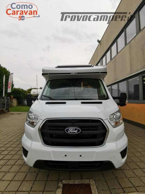 Ford Transit 2.0 I 165CV, Fari "High Series" con luci di svolta statiche, Vano portaoggetti con serratura, Finiture plancia e "Trend", Paraurti e modanature laterali verniciati in tinta con la carrozzeria, Porta ingresso cellula XL a 2 punti di chiusura con finestra e chiusura centralizzata, Pannello solare da 200W con regolatore MPPT, SKYRoof, Tende da cabina plissettate, Braccio porta TV, Coprisedili cabina, freno a mano elettrico, cerchi in acciaio da 16', Tempomat intelligente, fari fendinebbia, accensione automatica dei fari, tergicristalli automatici, servizio di emergenza Ford, fotocamera posteriore, sistema frenante anticollisione, assistenza al mantenimento di corsia, riconoscimento segnali di velocità, avviso di guida in contromano, sensori di parcheggio anteriori, sensori di pressione gonfiaggio pneumatici, touch screen da 12' (apple car play/android auto), quadro strumenti semi digitale da 8', climatizzatore automatico, modem 5G con aggiornamenti tramite smartphone, ABS, ESP, start/stop, airbag conducente passeggero, specchietti con sbrinatore, fix&go.