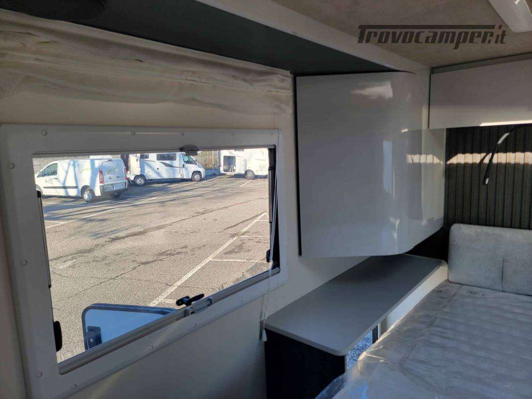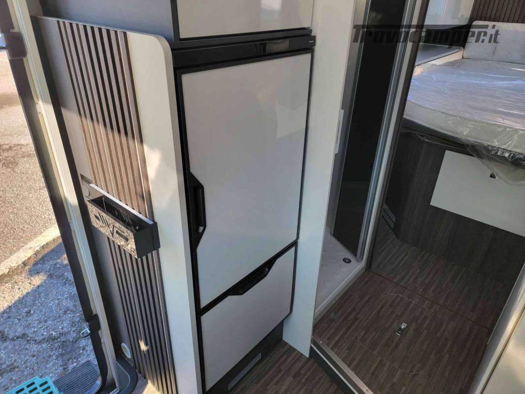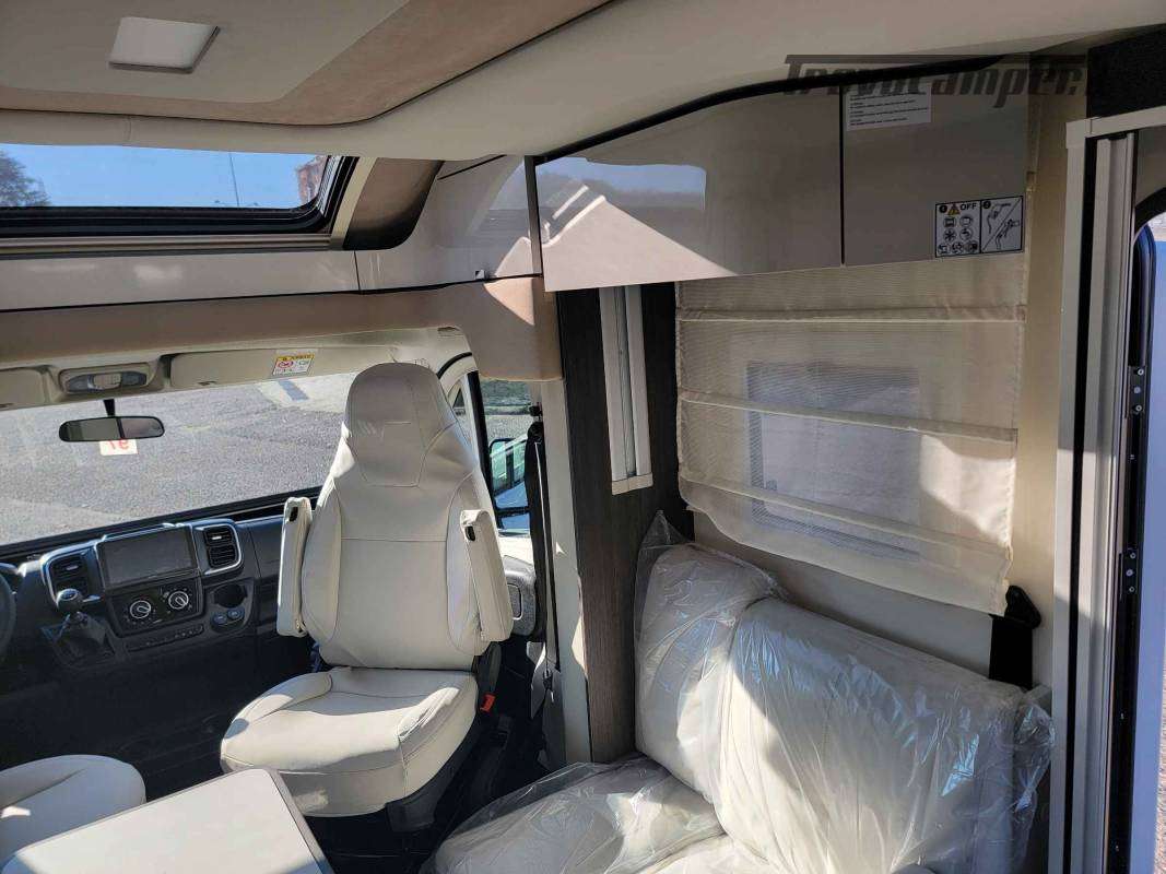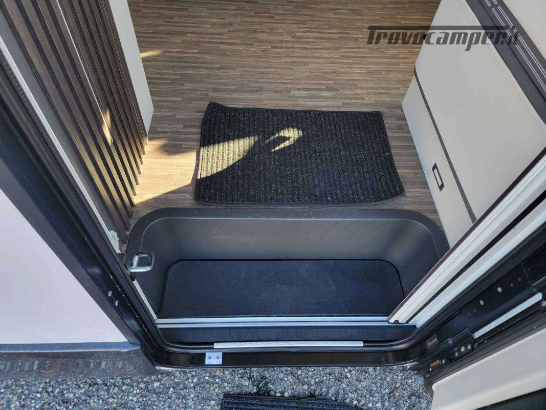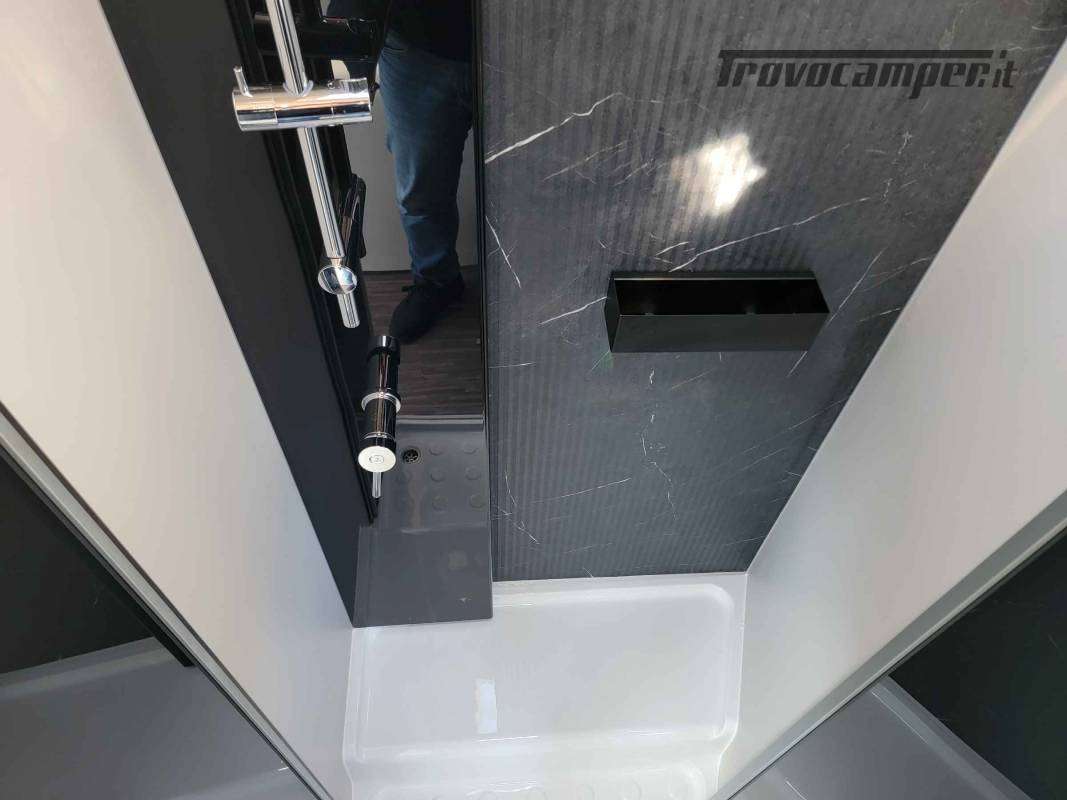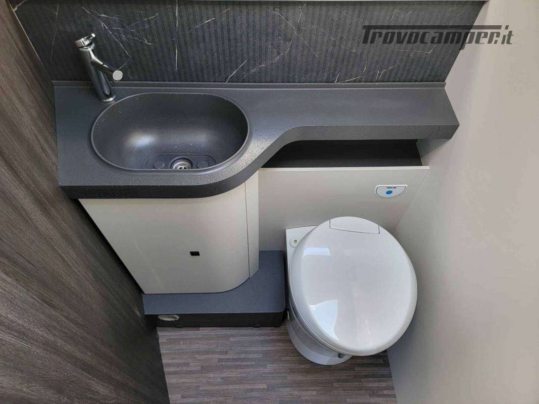 La toilette è arredata in legno con piano in laminato opaco. Sopra sono ricavati vani di stivaggio e il grande specchio nasconde un vano stivaggio.TANTO SPAZIO PER LE TUE DESTINAZIONI