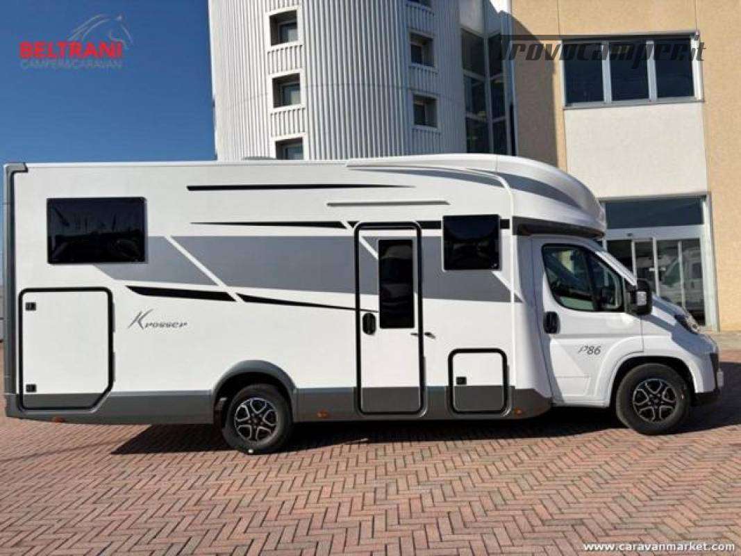 Mobilvetta Krosser P86 2026 | Automatico. Semintegrale con doppio pavimento tecnico e layout con letti gemelli posteriori, pensato per chi cerca comfort di alto livello e grande capacità di stivaggio in ogni stagione, Il cambio automatico su Fiat Ducato 2.2 rende la guida fluida e sicura, mentre il living face?to?face con skydome, cucina centrale completa e toilette con doccia separata offrono spazi luminosi e funzionali per la vita a bordo, Fari full LED, ampio garage passante collegato all?abitacolo e dotazioni moderne per 4 posti viaggio/letto completano un allestimento curato, ideale per viaggi lunghi con comfort, tecnologia e design in puro stile Mobilvetta