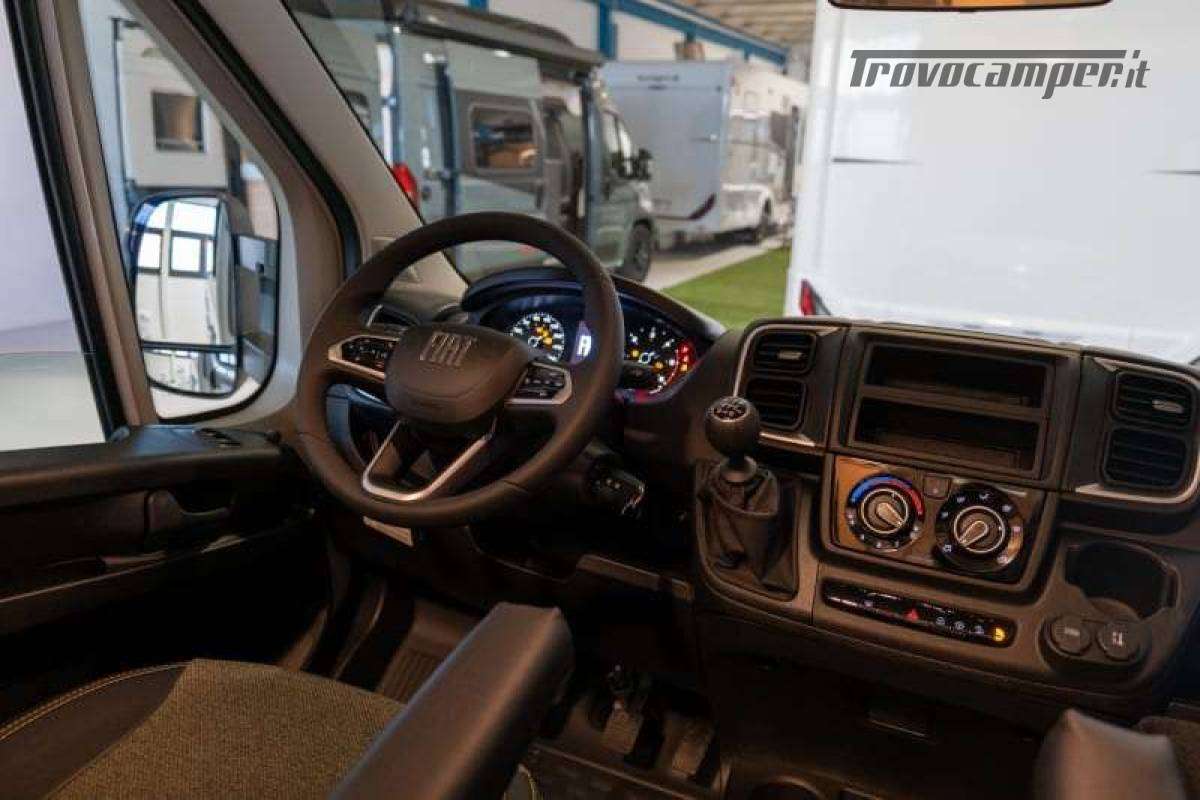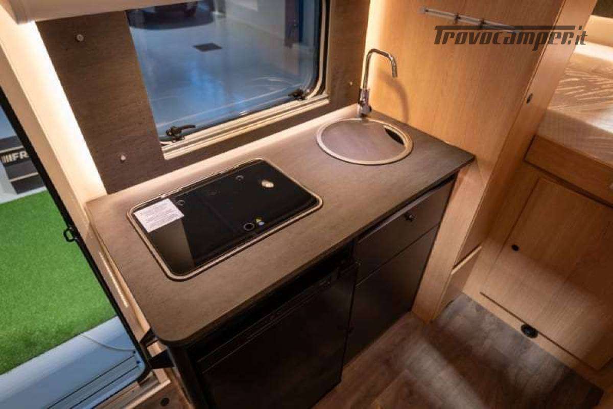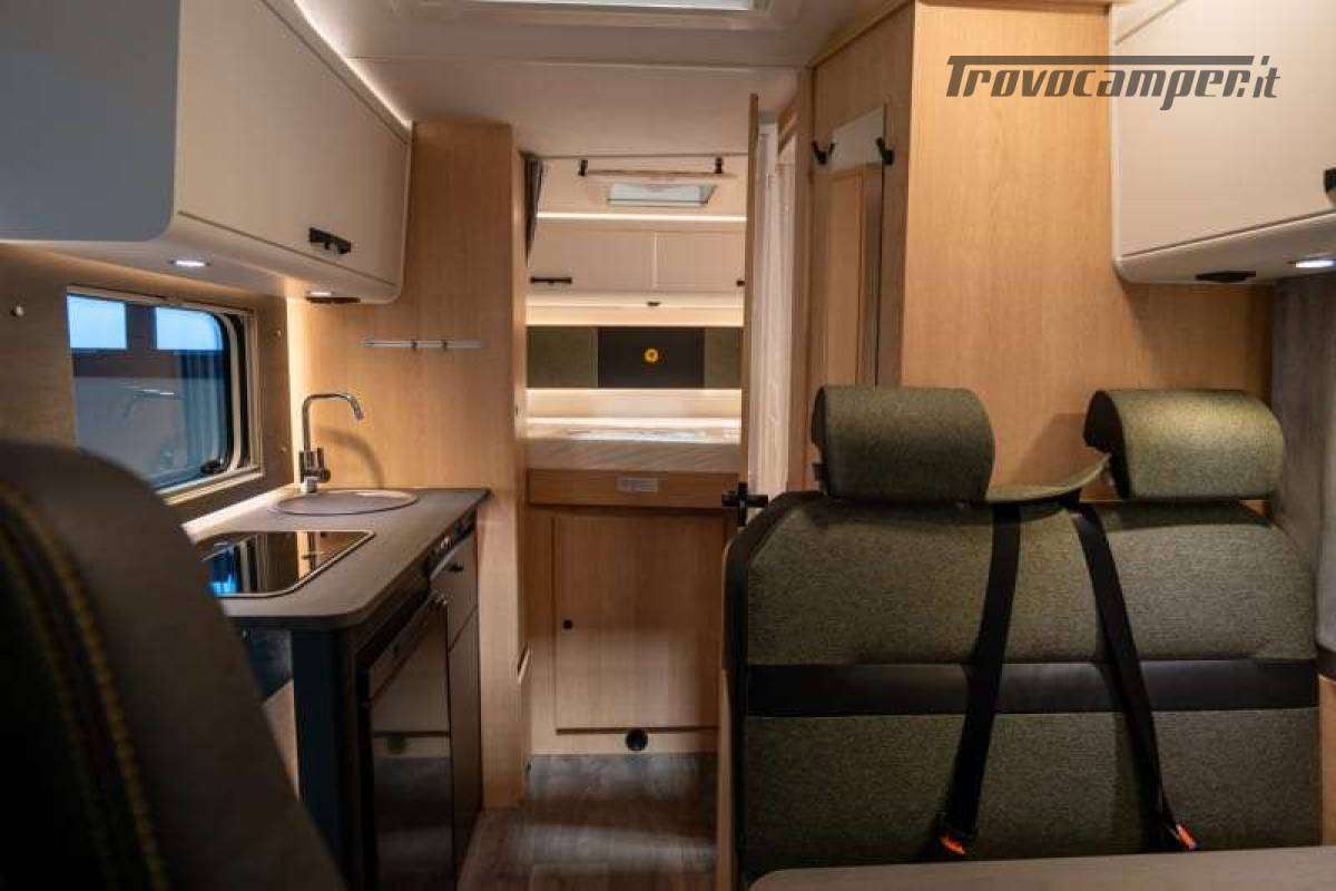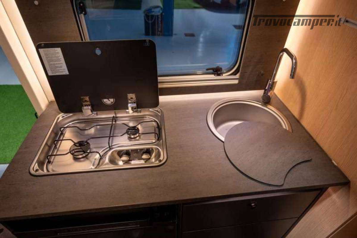 La cucina in linea è attrezzata con piano cottura, lavello e frigorifero trivalente da 78 litri, mentre il bagno compatto con doccia integrata offre tutto il necessario per la quotidianità anche in viaggio.