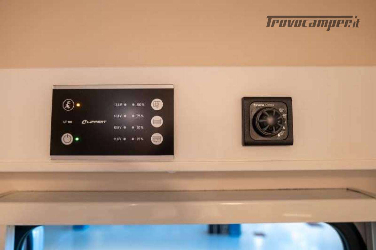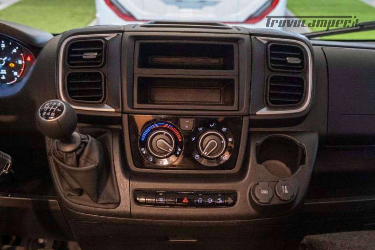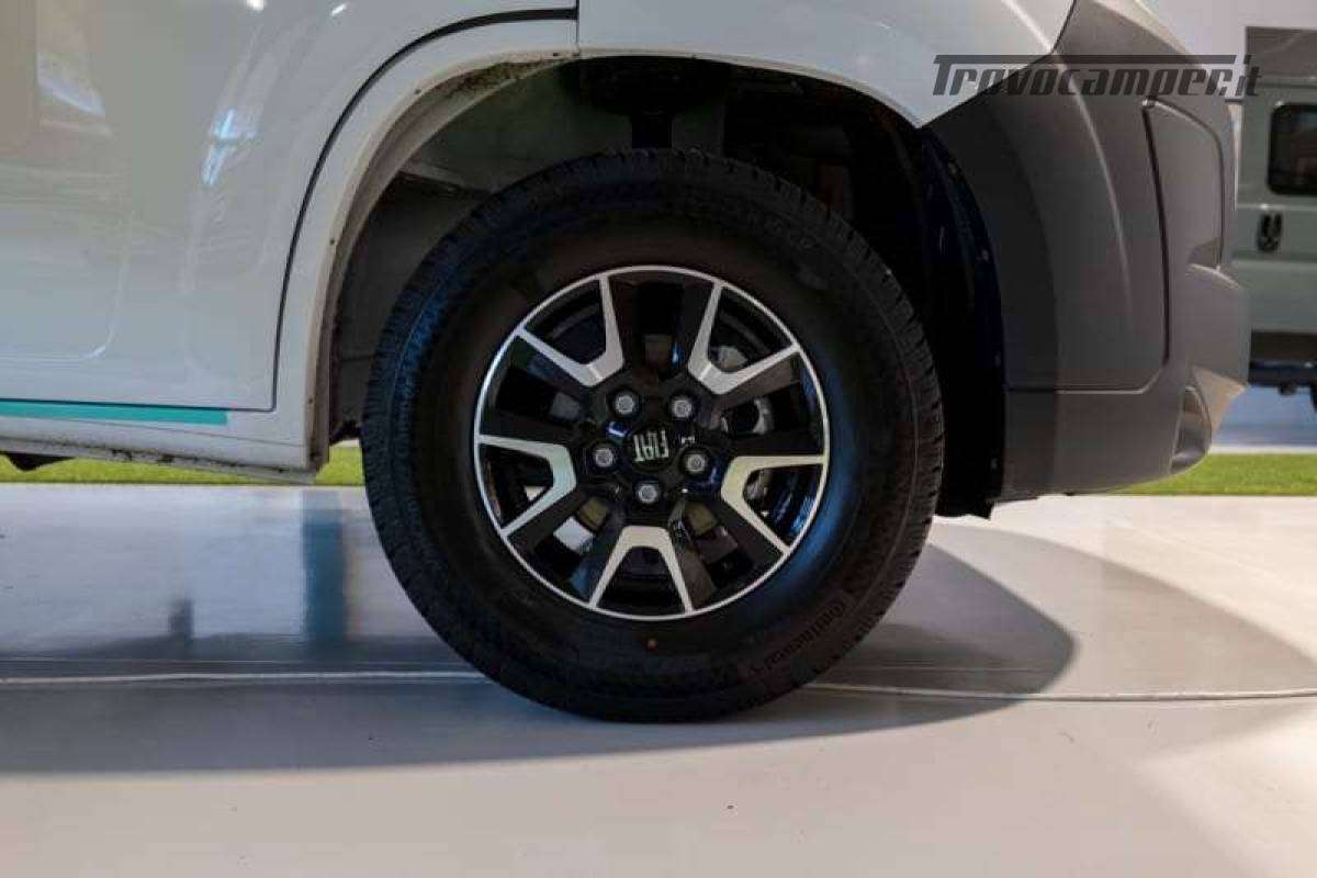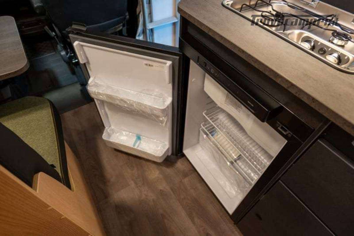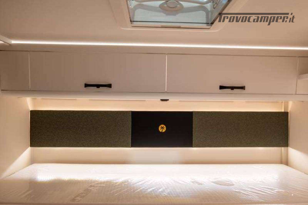La cucina in linea è attrezzata con piano cottura, lavello e frigorifero trivalente da 78 litri, mentre il bagno compatto con doccia integrata offre tutto il necessario per la quotidianità anche in viaggio.