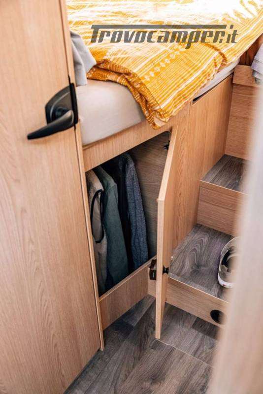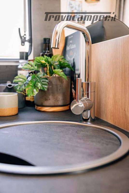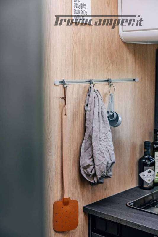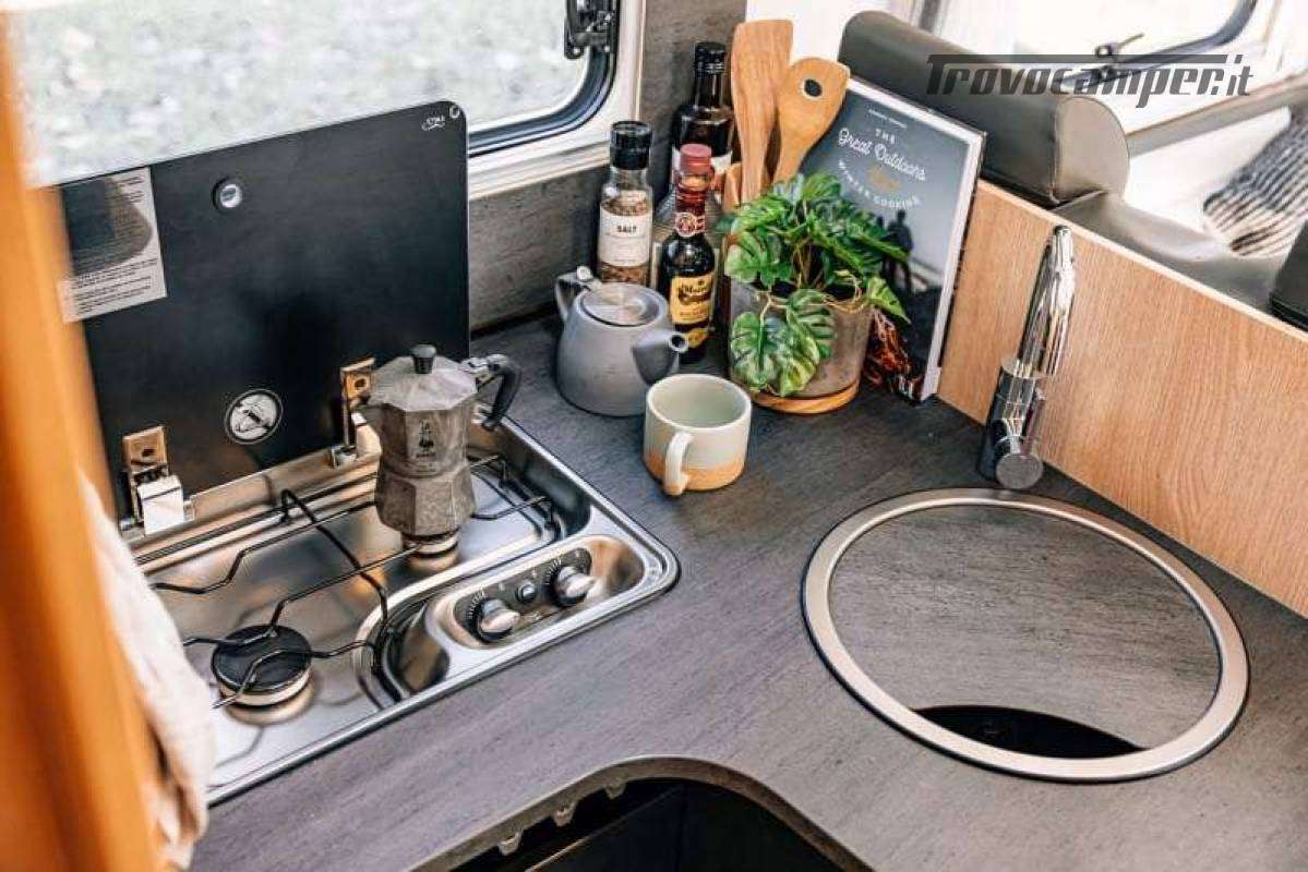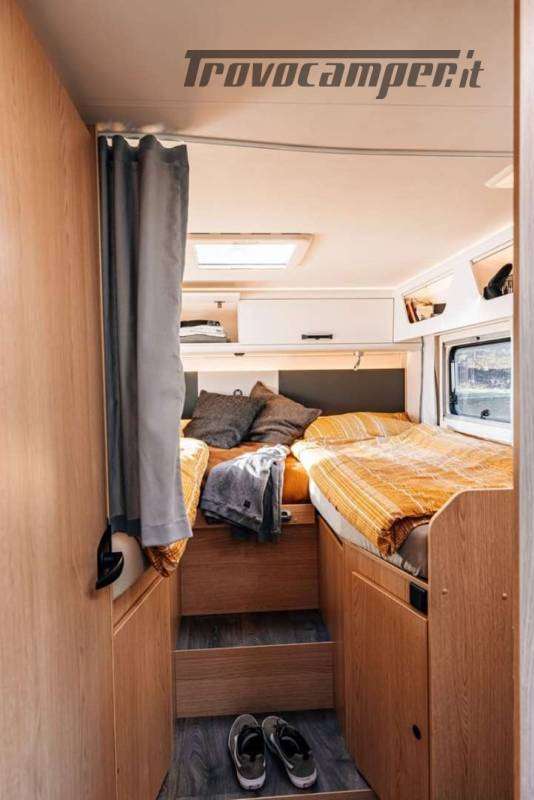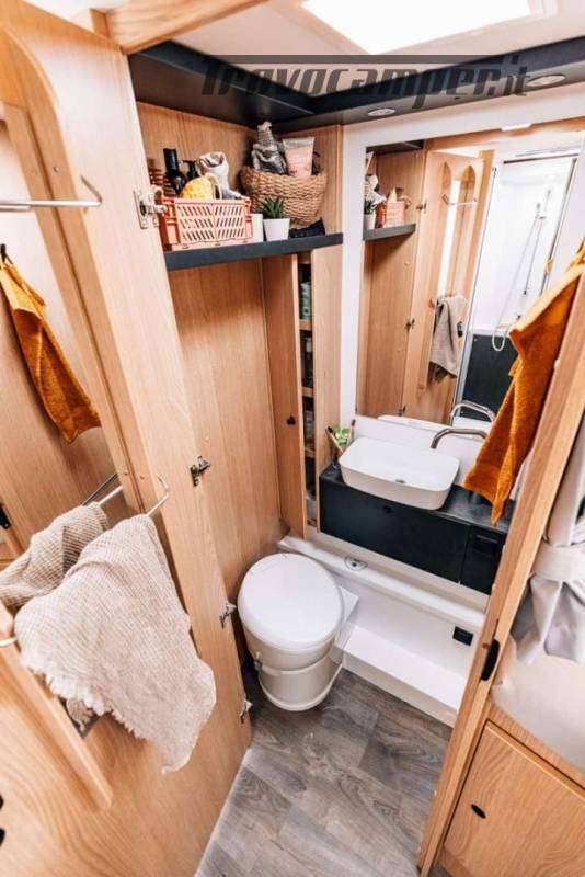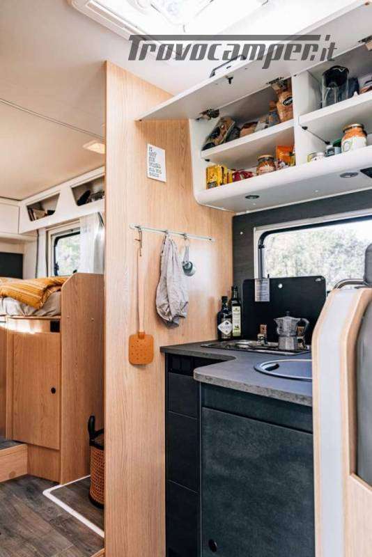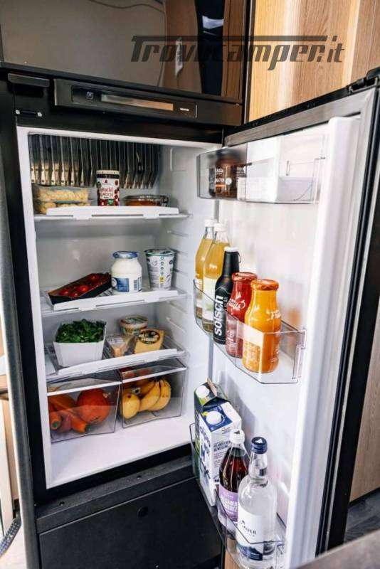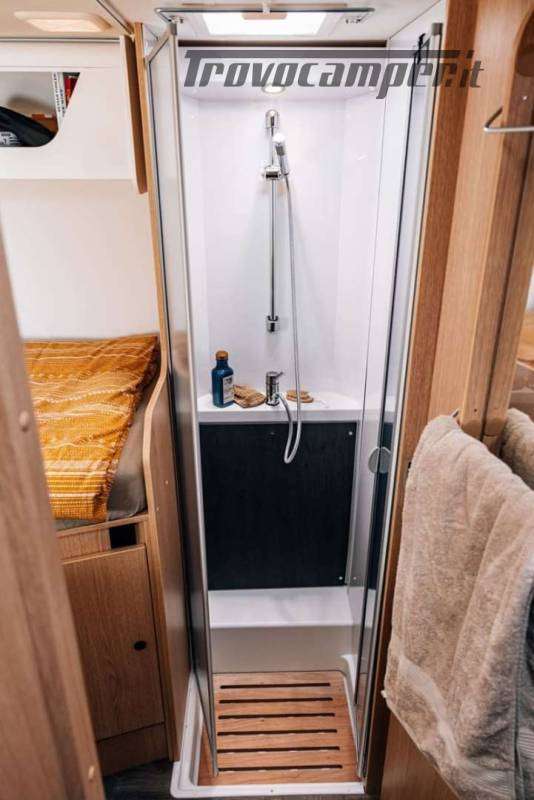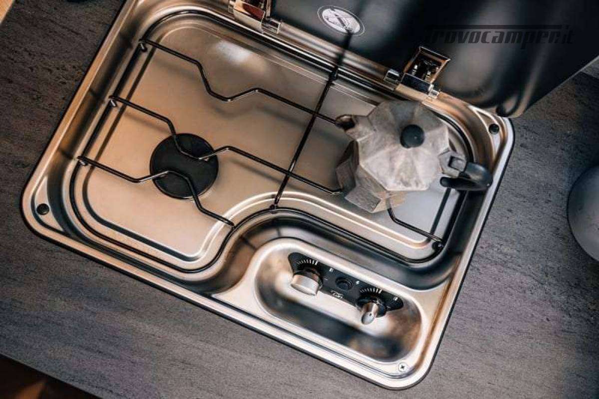 La cucina a L offre tutto il necessario per cucinare in viaggio: ampi spazi di lavoro, frigorifero da 156 litri con freezer separato, piano cottura e lavello. Il bagno è completo di doccia separata, WC e mobile lavabo, con finiture resistenti e funzionali.