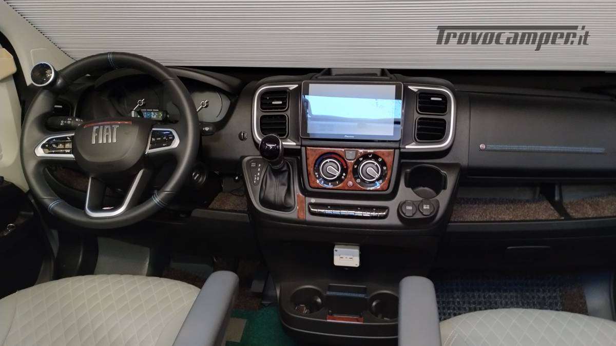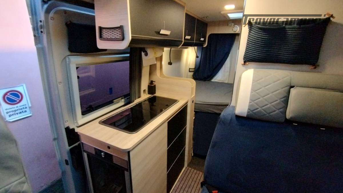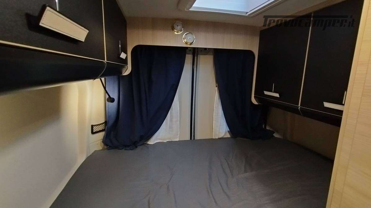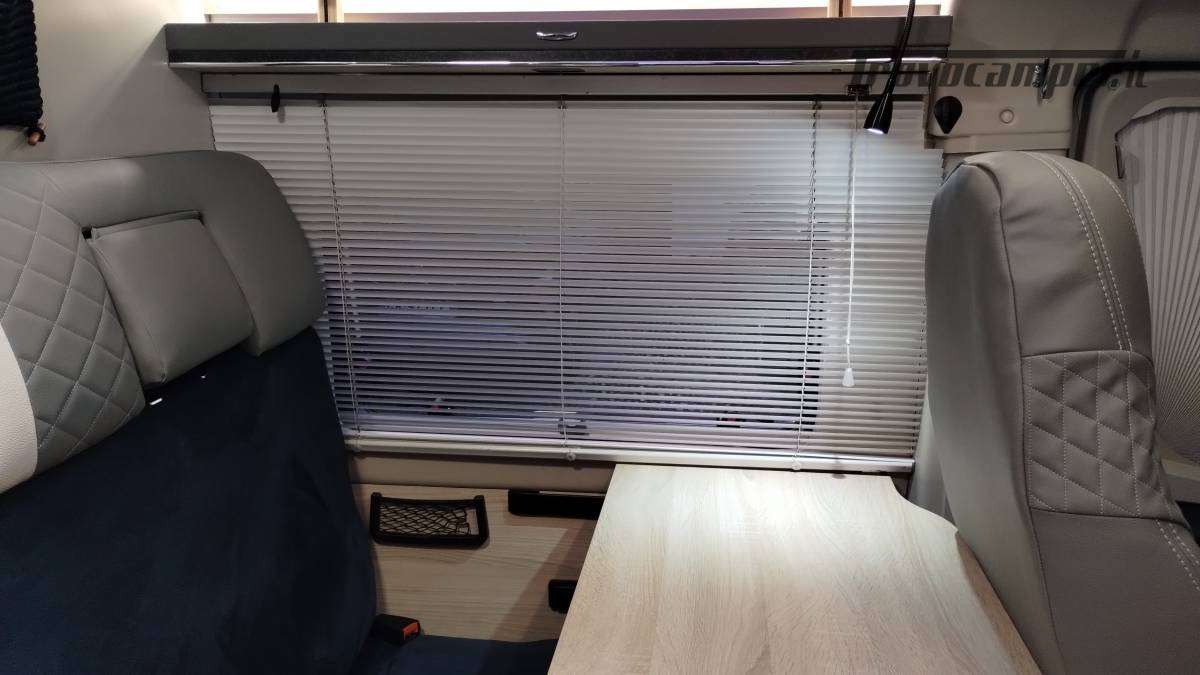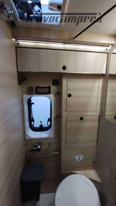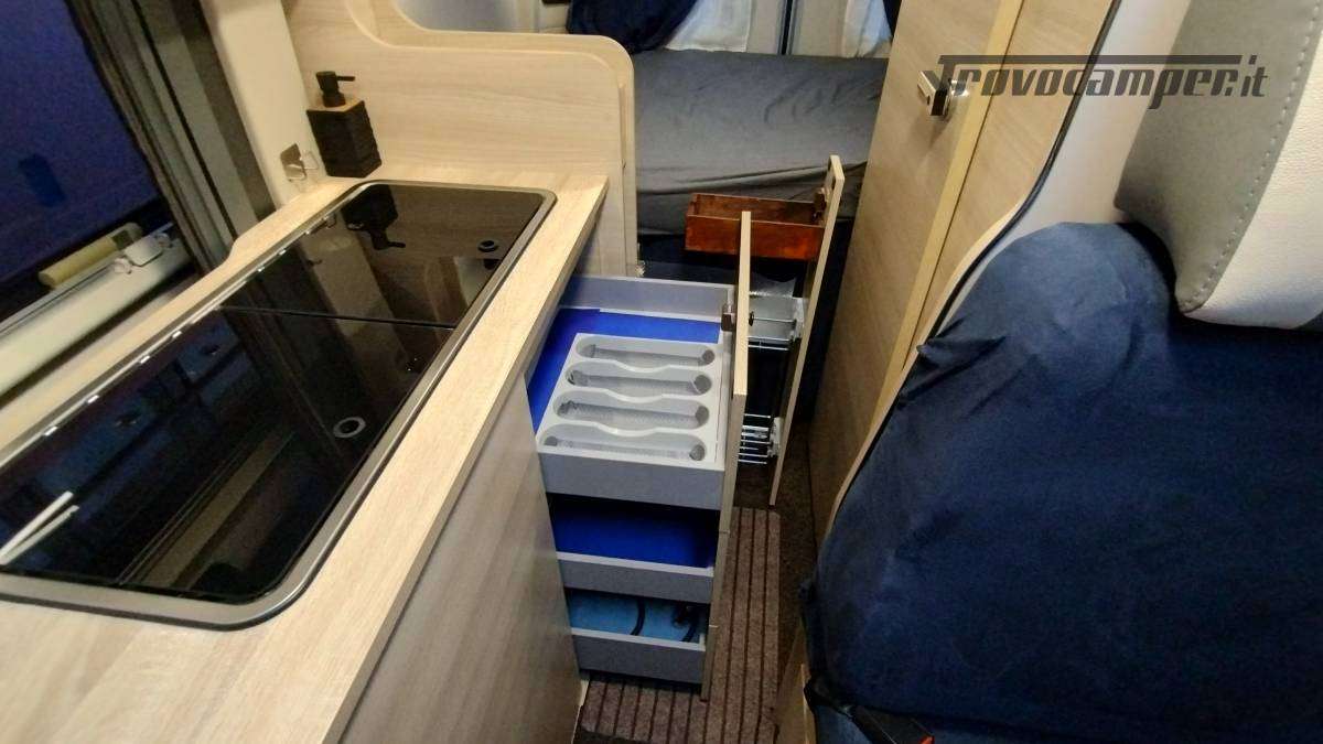 Accessori:Seconda batteria AGM 95Ah, inverter onda pura 1500W, faretti diurni e profondità, barra LED curva a tetto, voltmetro, oblò bagno 28x28 con ventolina USB, mensola dinette con faretto, veneziana finestra dinette, seconda cassetta Thetford (nuova), ripiano cucina pieghevole, bombola Camping Gas 3 kg, pattumiera, dispenser saponi, accesso facilitato gavone, prese 12V/USB sotto letto e vicino centralina, tende oscuranti cotone blu portellone e oblò, tendine posteriori, imbottitura parafreddo portello scorrevole, tendina separazione bagagliaio-corridoio, paraspruzzi anteriori.