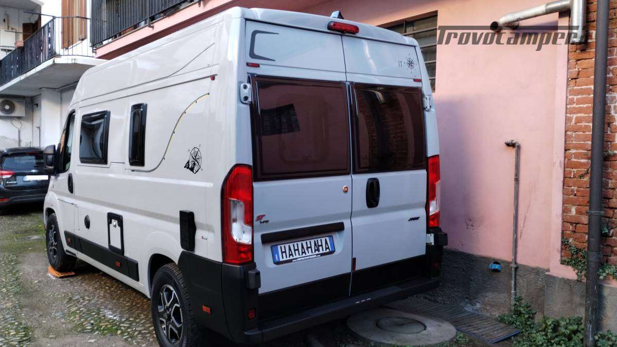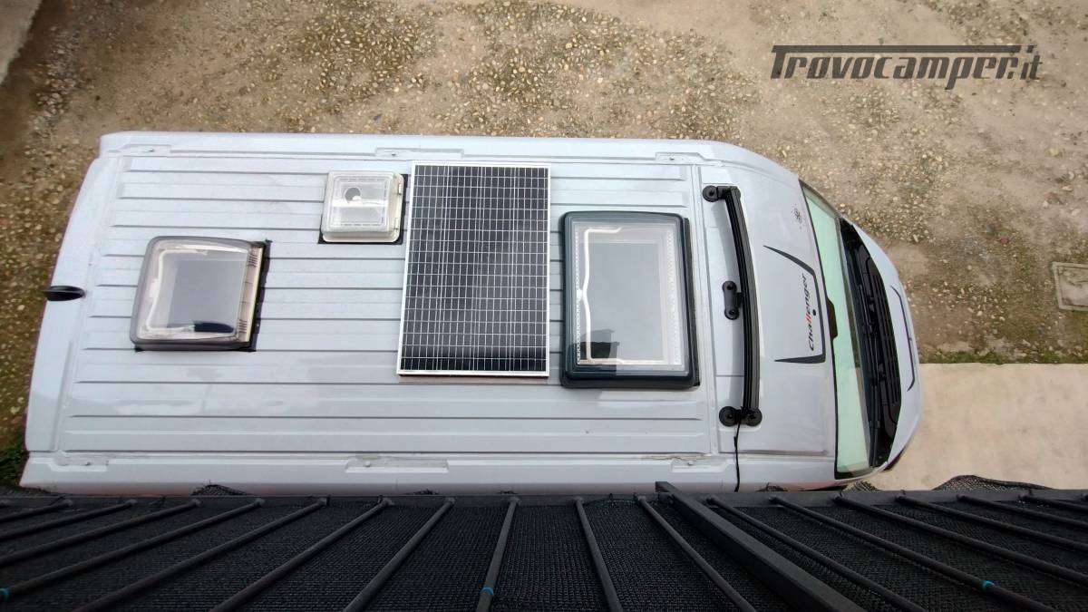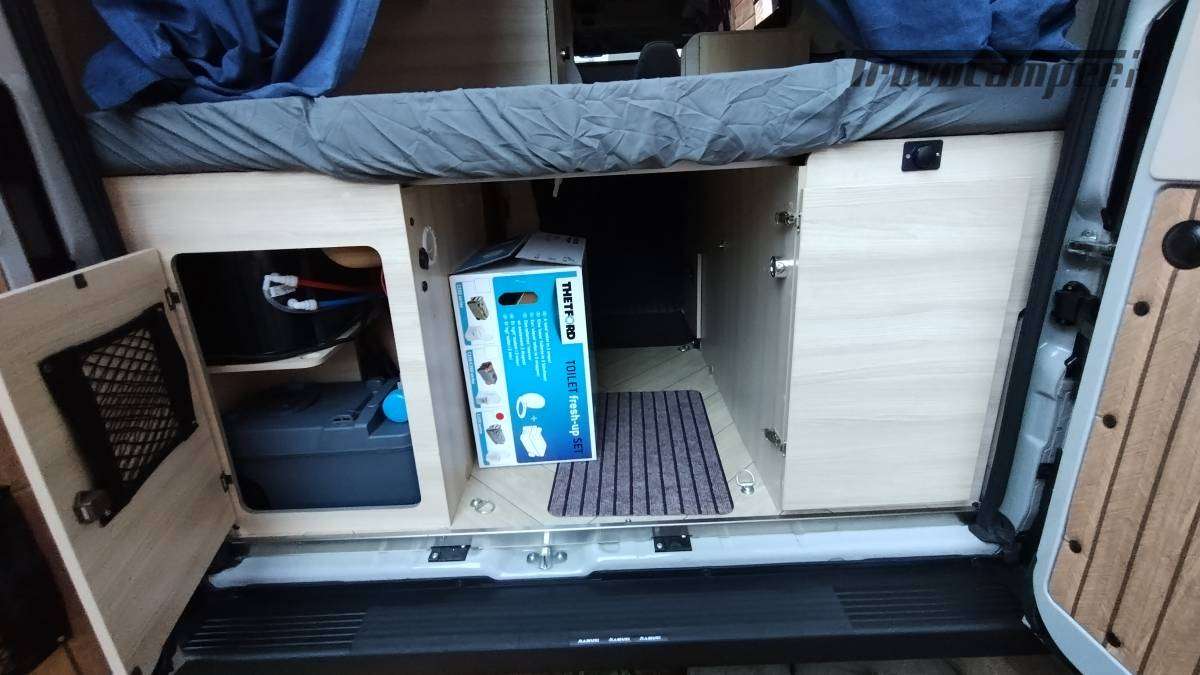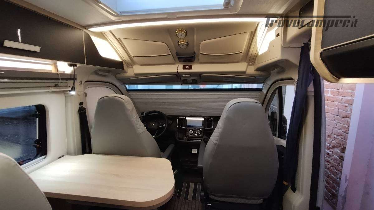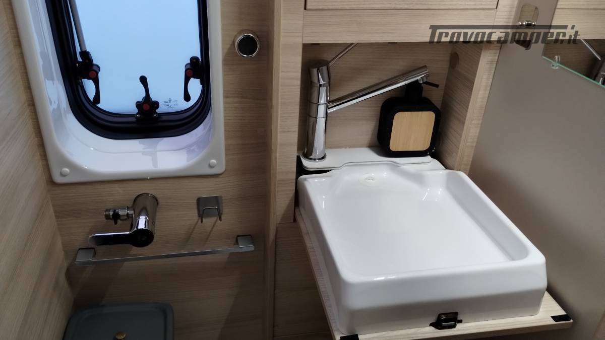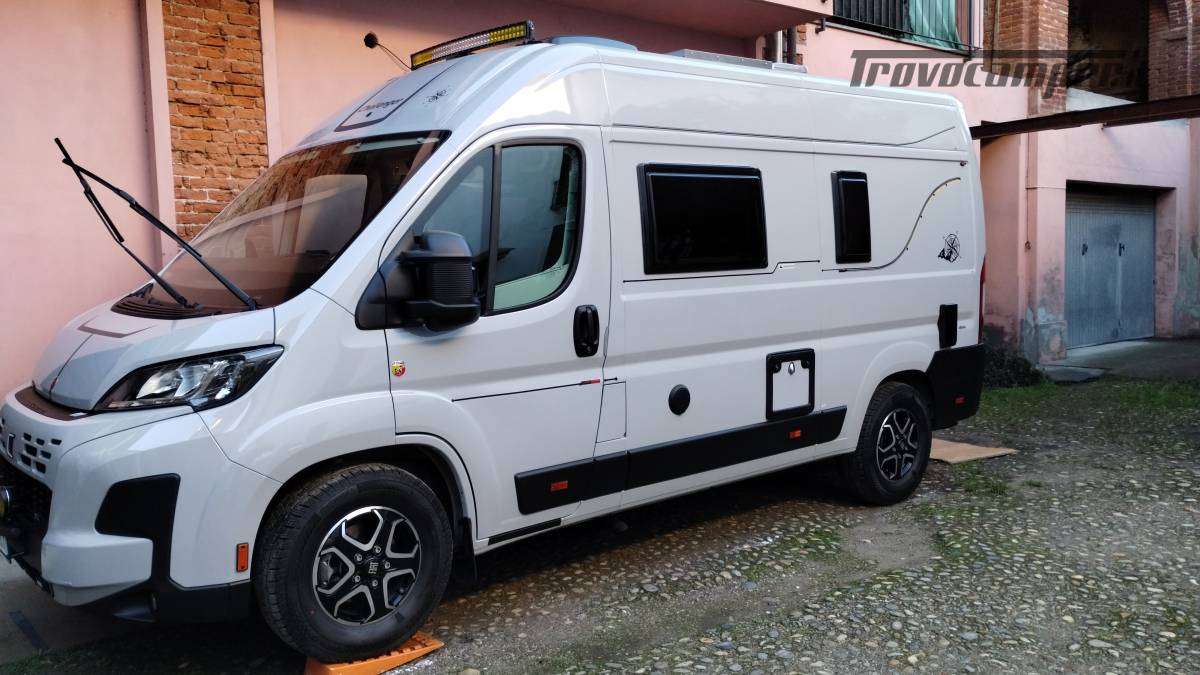 Accessori:Seconda batteria AGM 95Ah, inverter onda pura 1500W, faretti diurni e profondità, barra LED curva a tetto, voltmetro, oblò bagno 28x28 con ventolina USB, mensola dinette con faretto, veneziana finestra dinette, seconda cassetta Thetford (nuova), ripiano cucina pieghevole, bombola Camping Gas 3 kg, pattumiera, dispenser saponi, accesso facilitato gavone, prese 12V/USB sotto letto e vicino centralina, tende oscuranti cotone blu portellone e oblò, tendine posteriori, imbottitura parafreddo portello scorrevole, tendina separazione bagagliaio-corridoio, paraspruzzi anteriori.