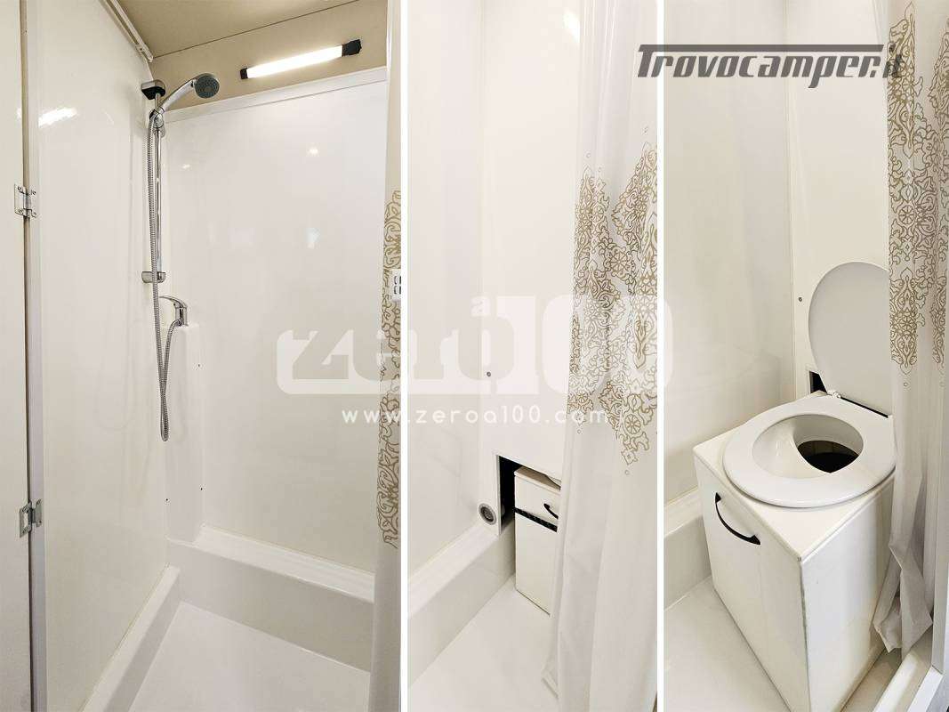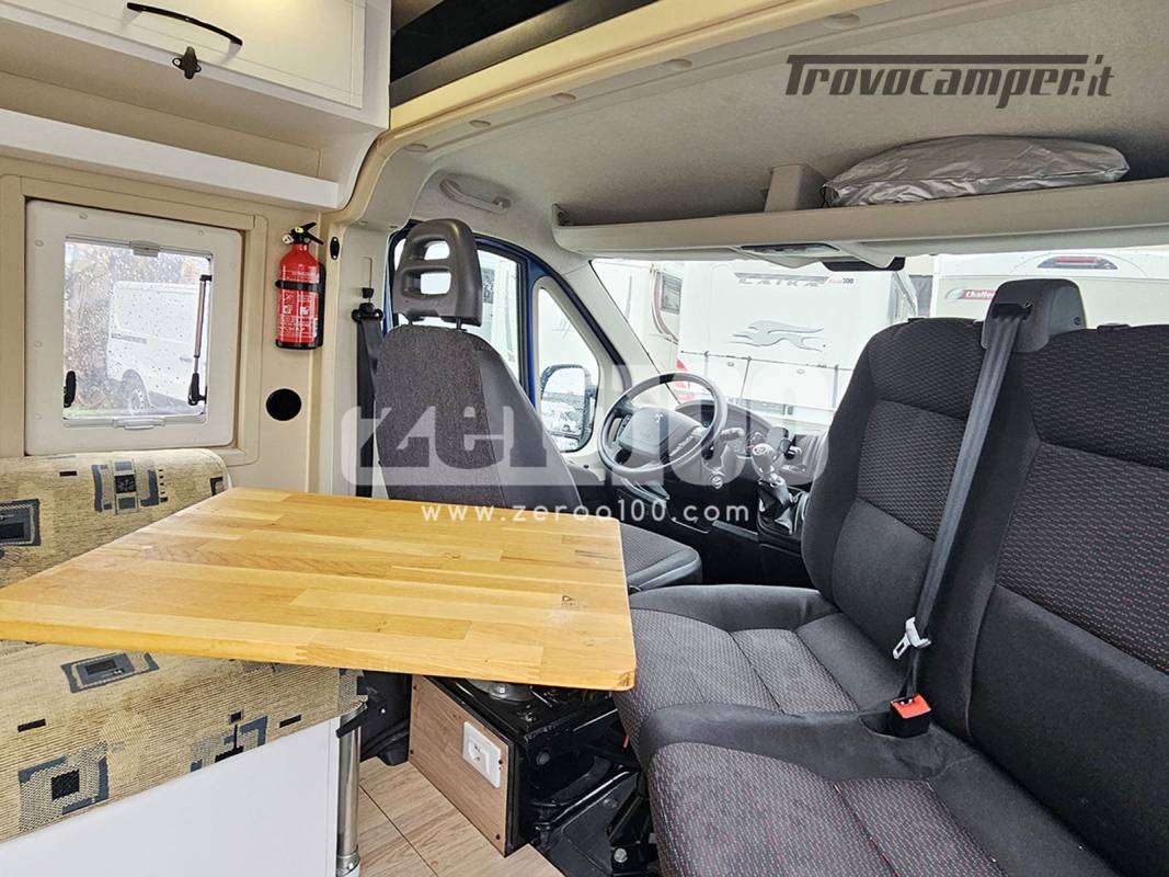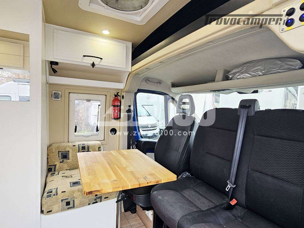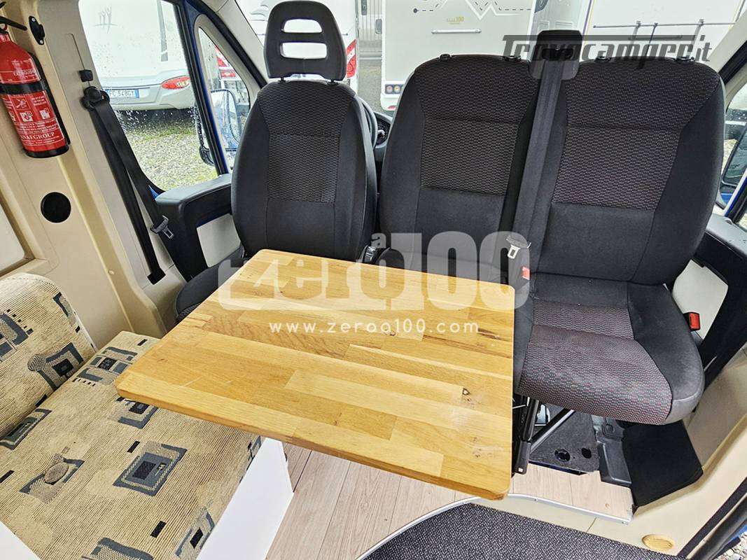 Letto a castello trasversale in coda costituito da 1 matrimoniale trasversale superiore e 1 letto singolo inferiore – Seduta singola lato sx anteriore con sedili cabina girevoli – Cucina lineare 2 fuochi con piezo – Frigorifero a compressore lt 45 – Toilette con wc a secco, Doccia con oblo’ 28 x 28.