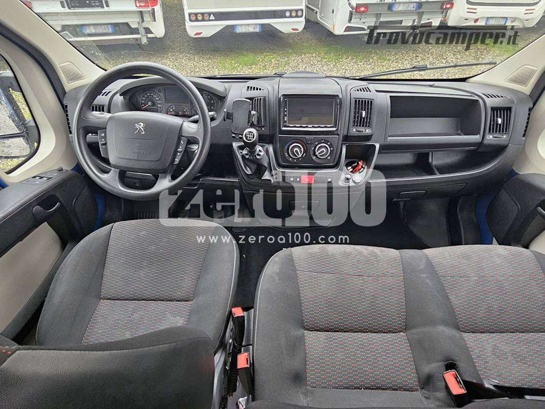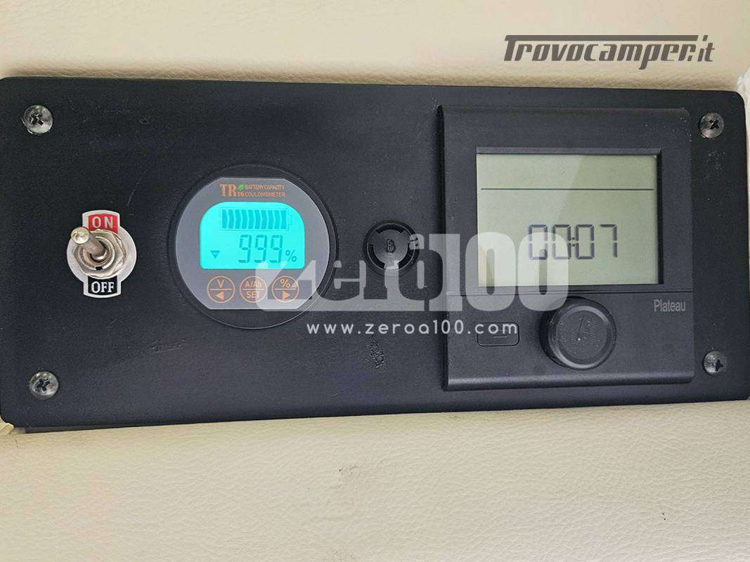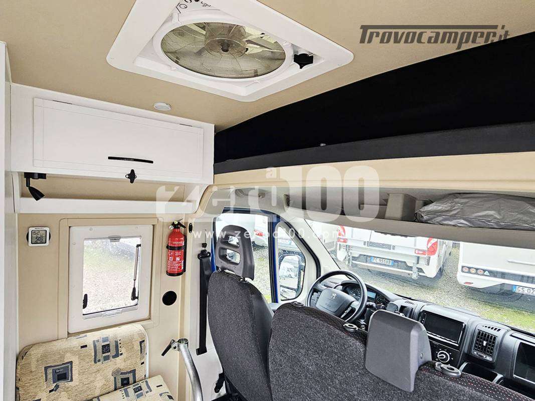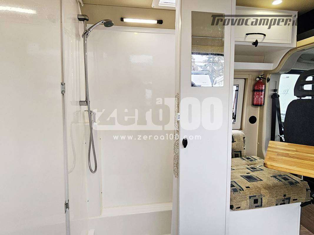 Letto a castello trasversale in coda costituito da 1 matrimoniale trasversale superiore e 1 letto singolo inferiore – Seduta singola lato sx anteriore con sedili cabina girevoli – Cucina lineare 2 fuochi con piezo – Frigorifero a compressore lt 45 – Toilette con wc a secco, Doccia con oblo’ 28 x 28.