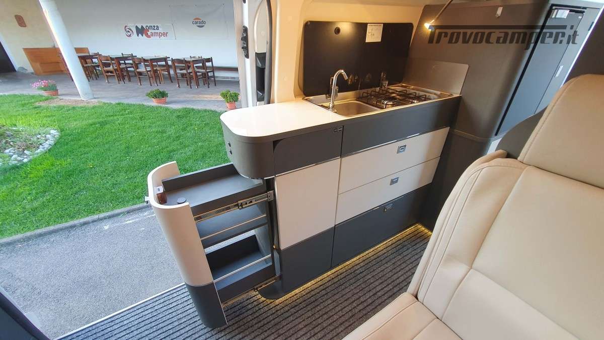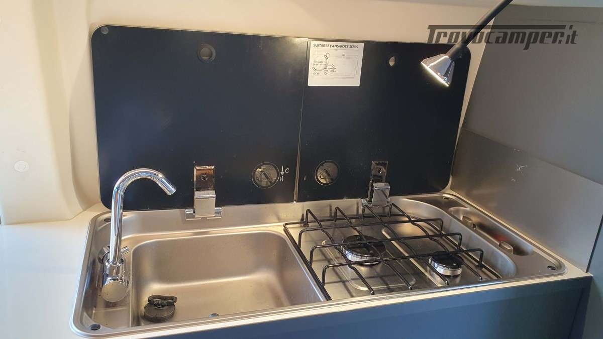 La cucina a gas è compatta ma completa, con due fuochi, lavandino e frigorifero a compressore da 70 litri, perfetta per preparare e conservare i pasti anche durante i viaggi più lunghi.